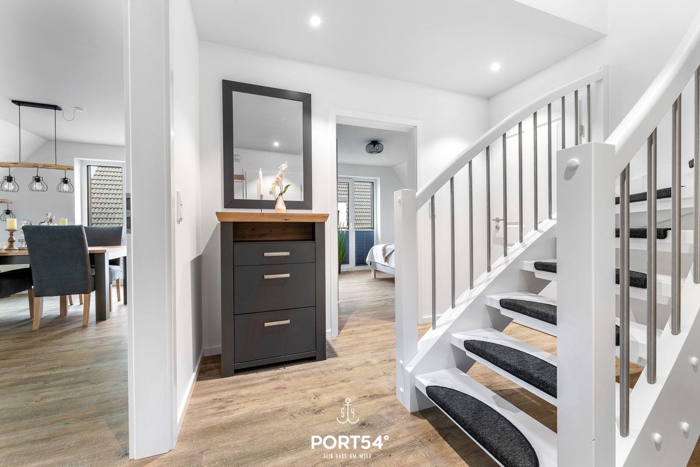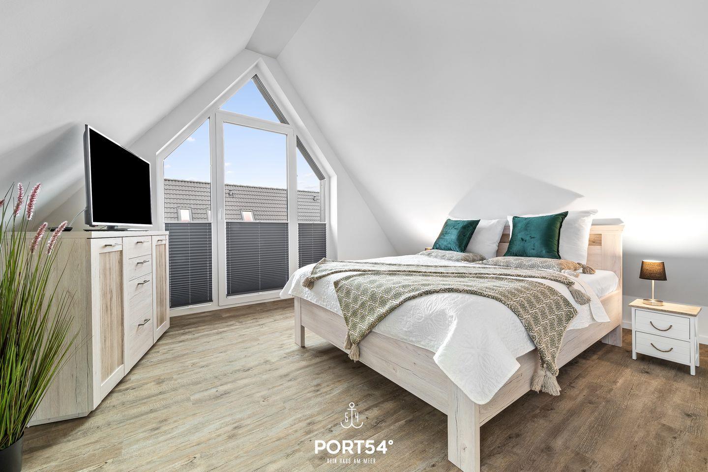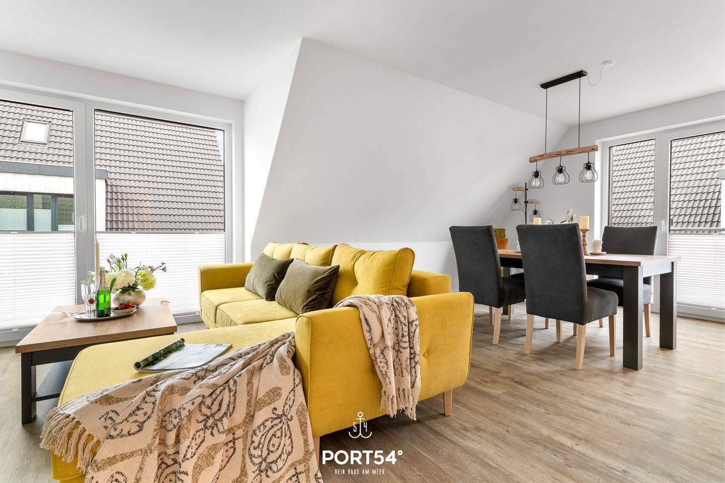 In gehobener und exklusiver Holzständerwerk-Bauweise erwartet Sie die im Dachgeschoss und Spitzboden gelegene Ferienwohnung "Küste 8" auf etwa 85m². Der lichtdurchflutete Wohnbereich ist mit einer gemütlichen Wohnlandschaft inklusive Schlaffunktion (250x160cm) und einem Flachbild-TV ausgestattet. Die angrenzende Küche ist offen gestaltet und bietet alle Annehmlichkeiten, die für einen geselligen Kochabend benötigt werden. Am Esstisch mit gemütlichen Stühlen können Sie bequem gemeinsam essen oder einen Spieleabend verbringen. Bodentiefe Fenster lassen viel Licht herein und ermöglichen den Zutritt zum vollmöblierten Balkon. In einem der beiden Schlafzimmer erwartet Sie ein großes Doppelbett (180x200cm), sowie verdunkelbare Fenster. Das andere Schlafzimmer befindet sich im ausgebauten Spitzboden und bietet ein Doppelbett (160x200cm) und einen weiteren Flachbild-TV fürs nächtliche Entertainment und Verdunkelungsmöglichkeiten für erholsame Nächte. Das Badezimmer ist mit einer ebenerdigen Dusche, einem WC sowie einem Waschbecken ausgestattet. Im Spitzboden befindet sich ein Gäste Bad mit WC und Waschbecken. Mitgebrachte Fahrräder können im Fahrradschuppen untergestellt werden.