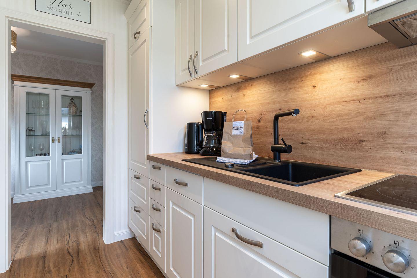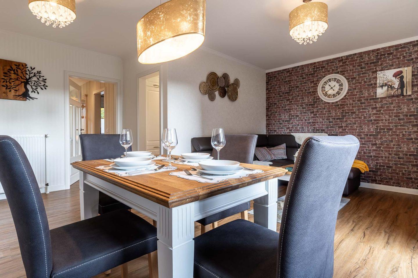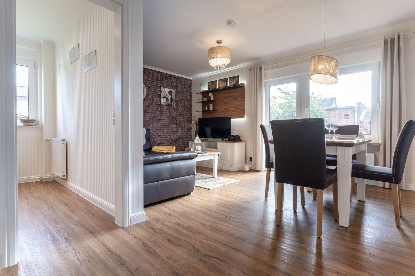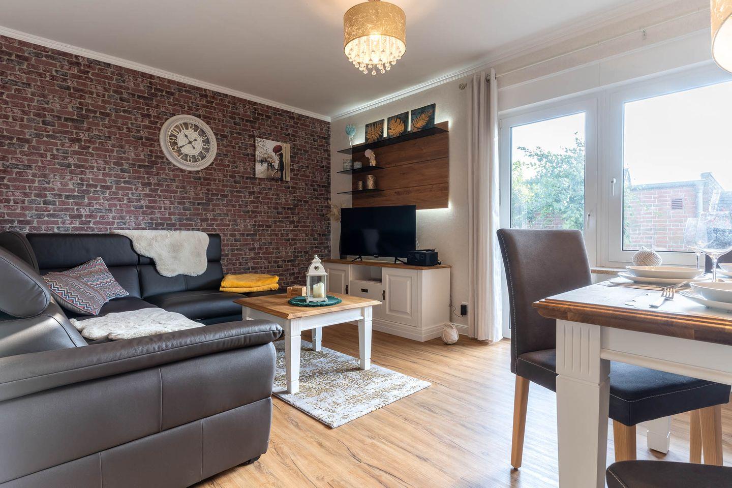 Die geschmackvoll eingerichtete Ferienwohnung verfügt über ein gemütliche Schlafzimmer, das Platz für 2 Personen bietet. Die moderne Küche ist komplett ausgestattet und lädt dazu ein, regionale Köstlichkeiten selbst zuzubereiten. Das großzügige Wohnzimmer ist der ideale Ort, um sich nach einem erlebnisreichen Tag zu entspannen. Hier gäbe es auch die Möglichkeit eines dritten Schlafplatzes auf der gemütliche Schlaf-Couch ( 1,20 x 1,90m ). Die angrenzende Terrasse mit bequemen Gartenmöbeln lädt dazu ein, die frische Nordseeluft zu genießen und den Tag bei einem Glas Wein ausklingen zu lassen.