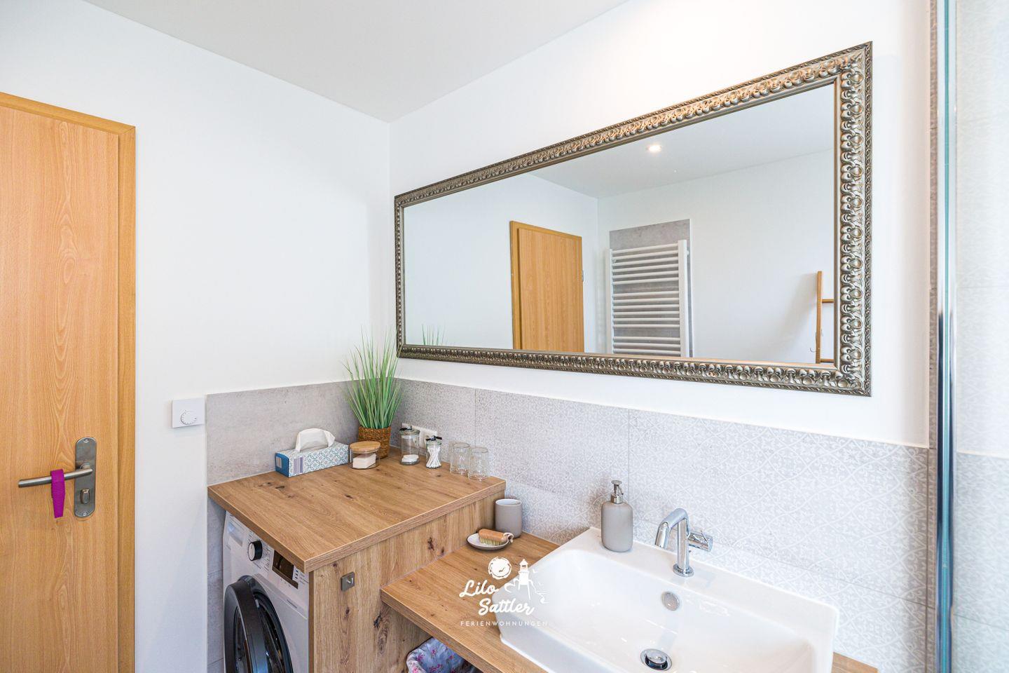 Dusche, WC, Waschbecken, Spiegel, Handtuchtrockner, Waschmaschine, Föhn, Fenster, Fliegengitter