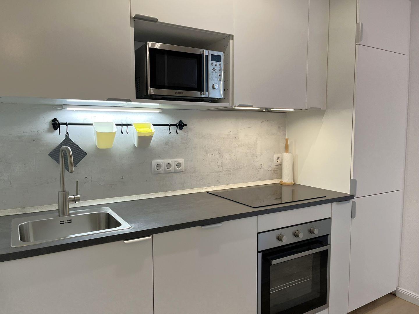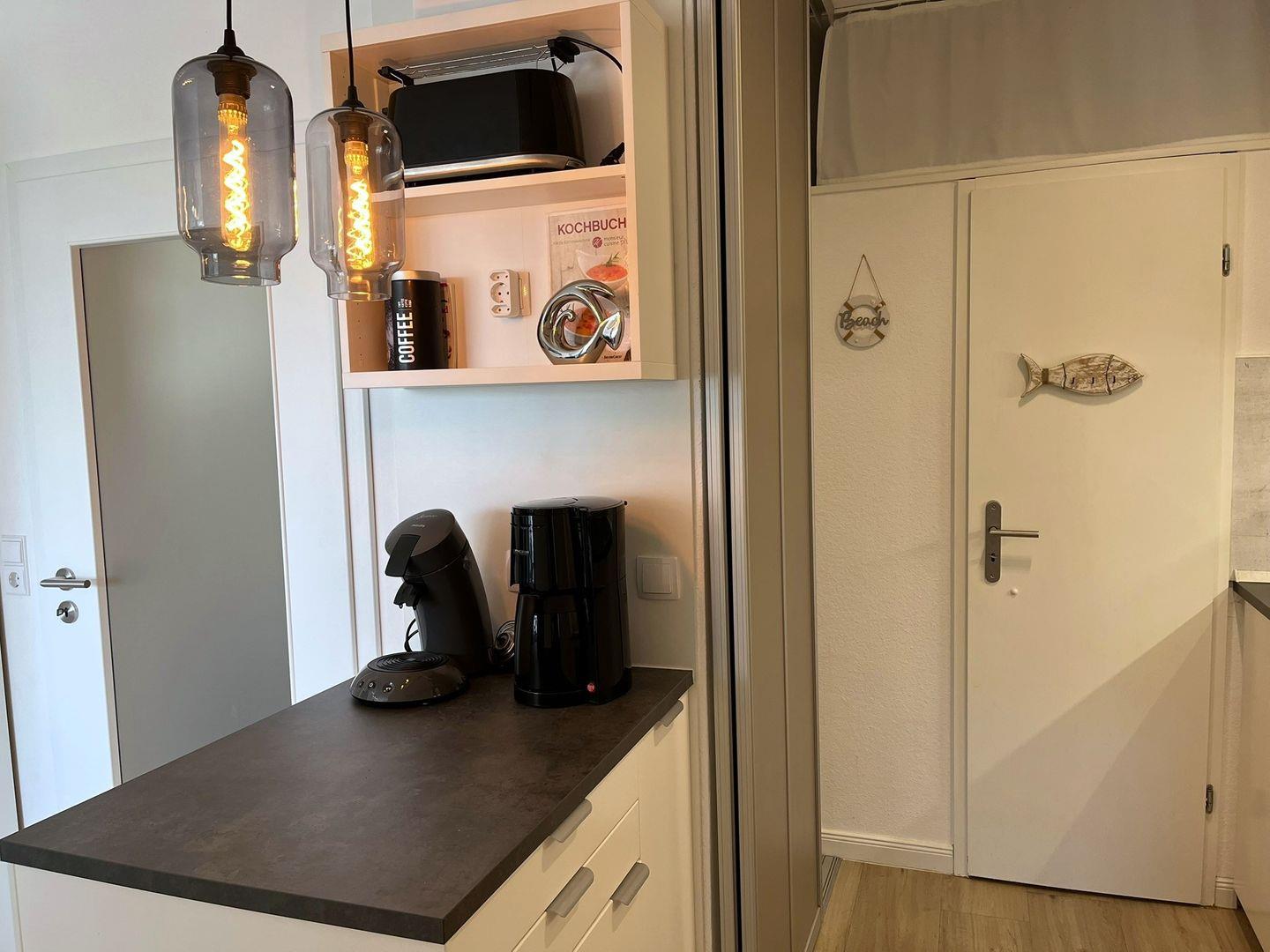 Die offene Küche ist vollständig ausgestattet und grenzt direkt an das Wohnzimmer an. Zur Küchenausstattung gehören unter anderem ein Ceran-Herd, Backofen, Mikrowelle, Spülmaschine sowie ein Kühlschrank mit integriertem Gefrierfach. Zudem finden Sie eine Kaffeemaschine, eine Senseo-Espressomaschine, einen Wasserkocher und einen Toaster vor. Geschirr, Besteck sowie notwendige Küchenutensilien sind in ausreichender Menge vorhanden, sodass die Zubereitung eigener Mahlzeiten angenehm und unkompliziert verläuft.