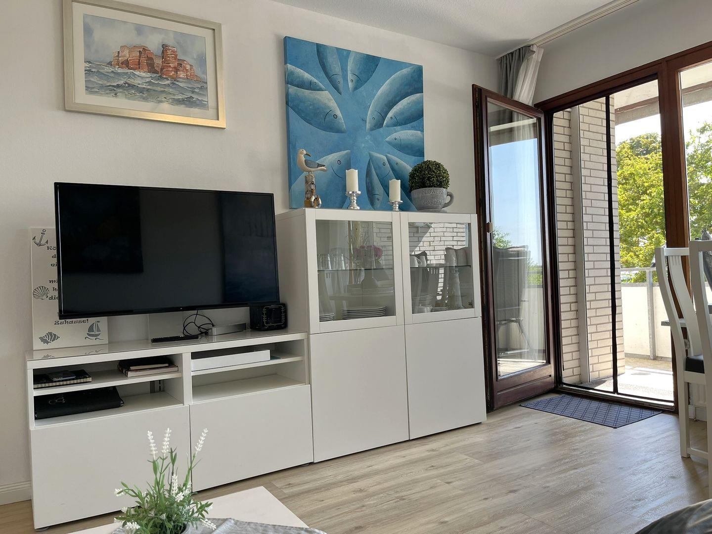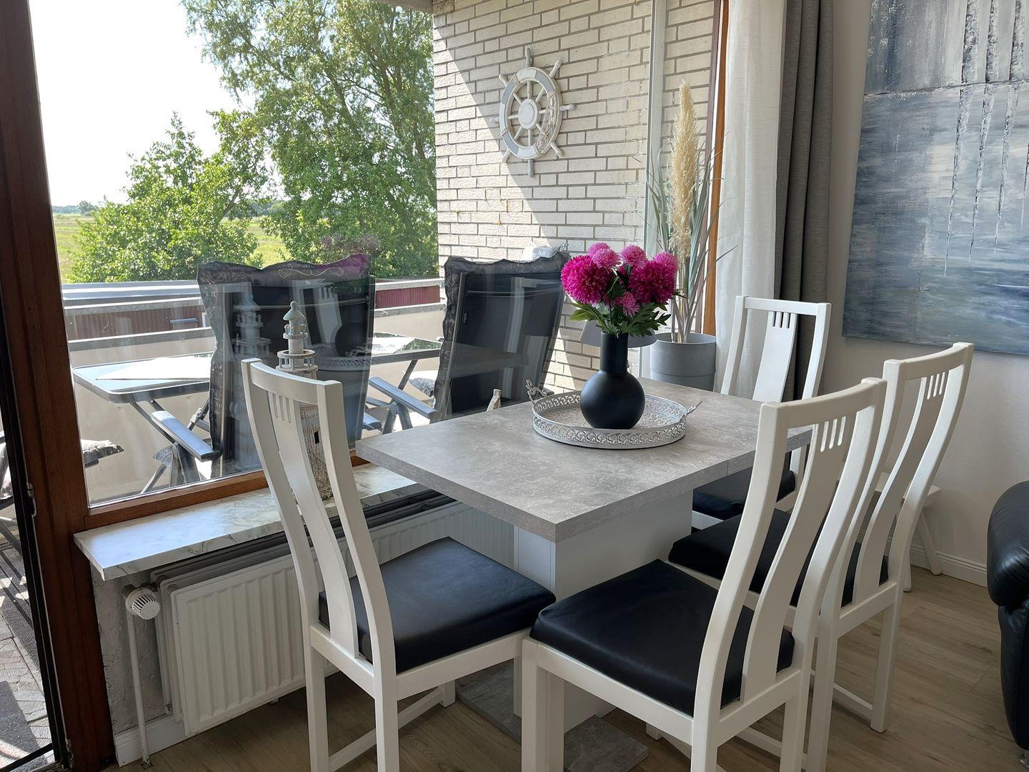 Der überdachte, möblierte Balkon, der an den Wohnraum angrenzt, bietet einen geschützten Außenbereich, um die frische Nordseeluft zu genießen.