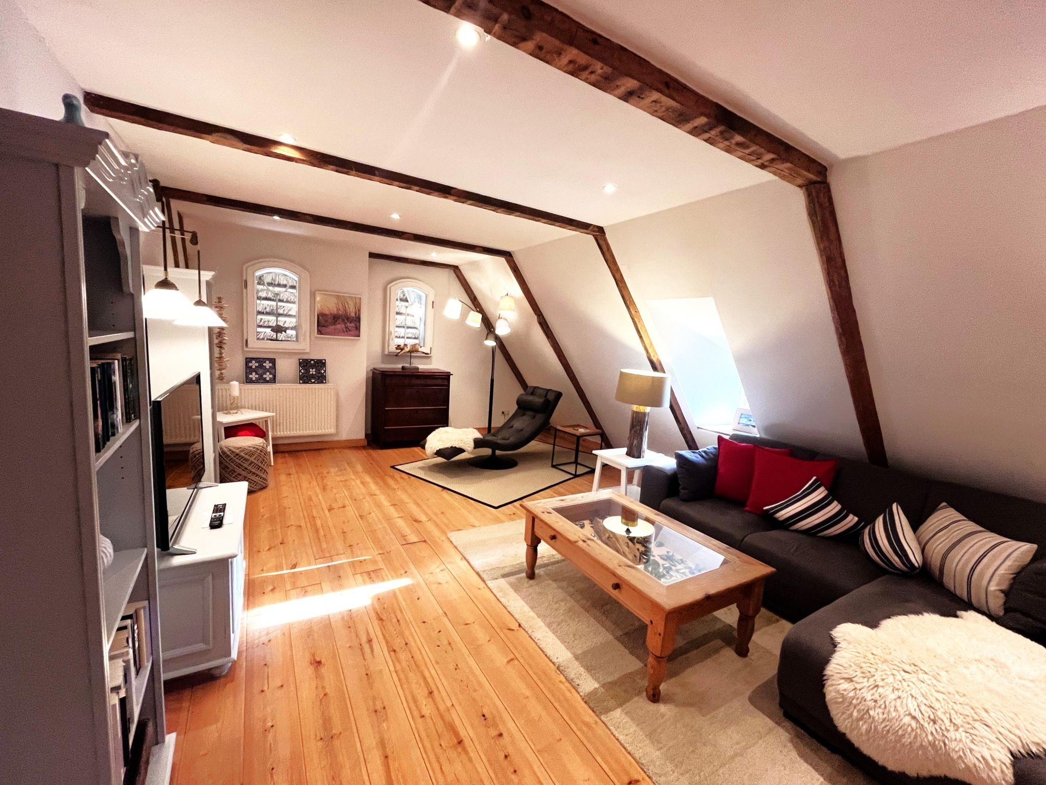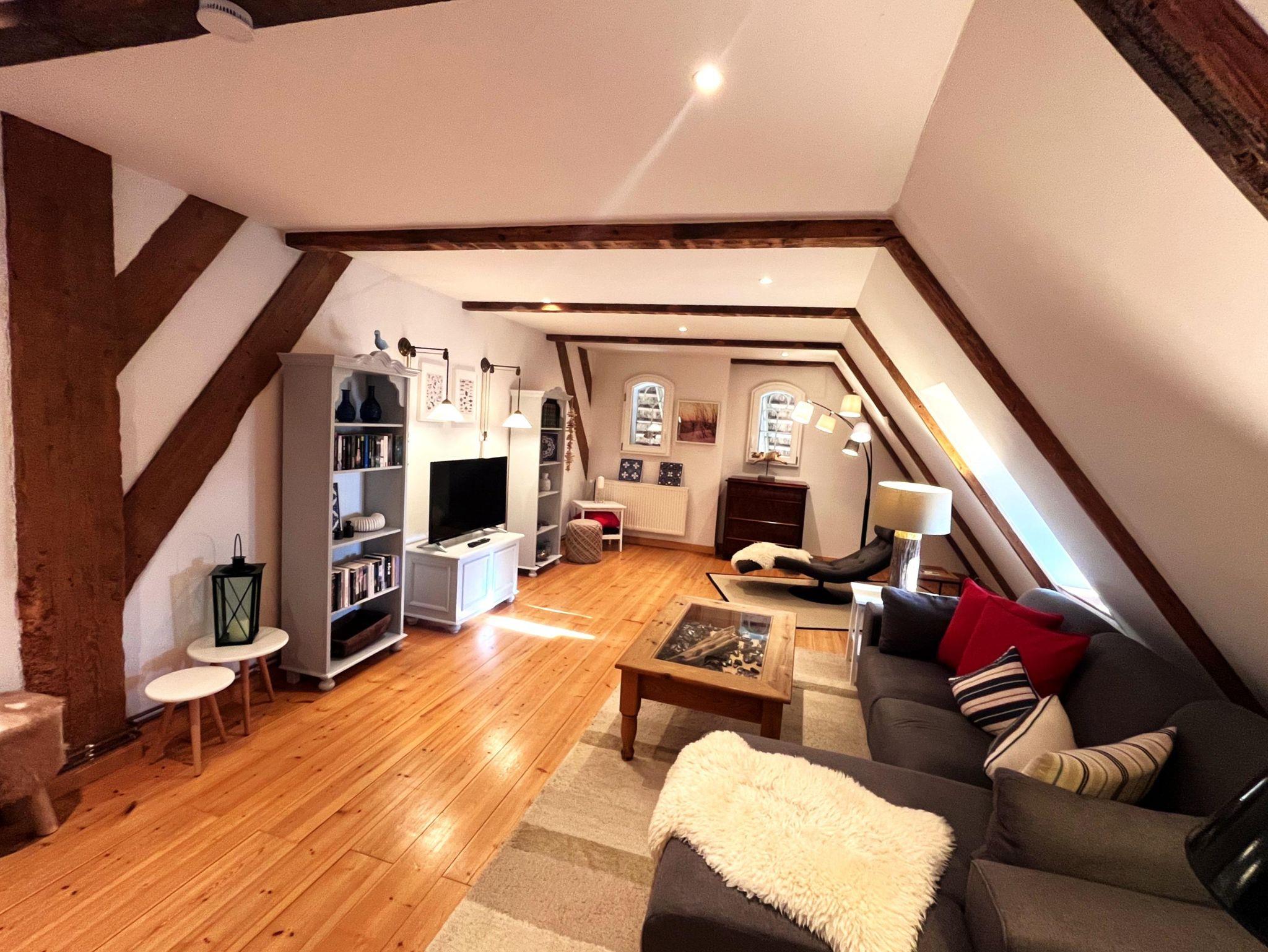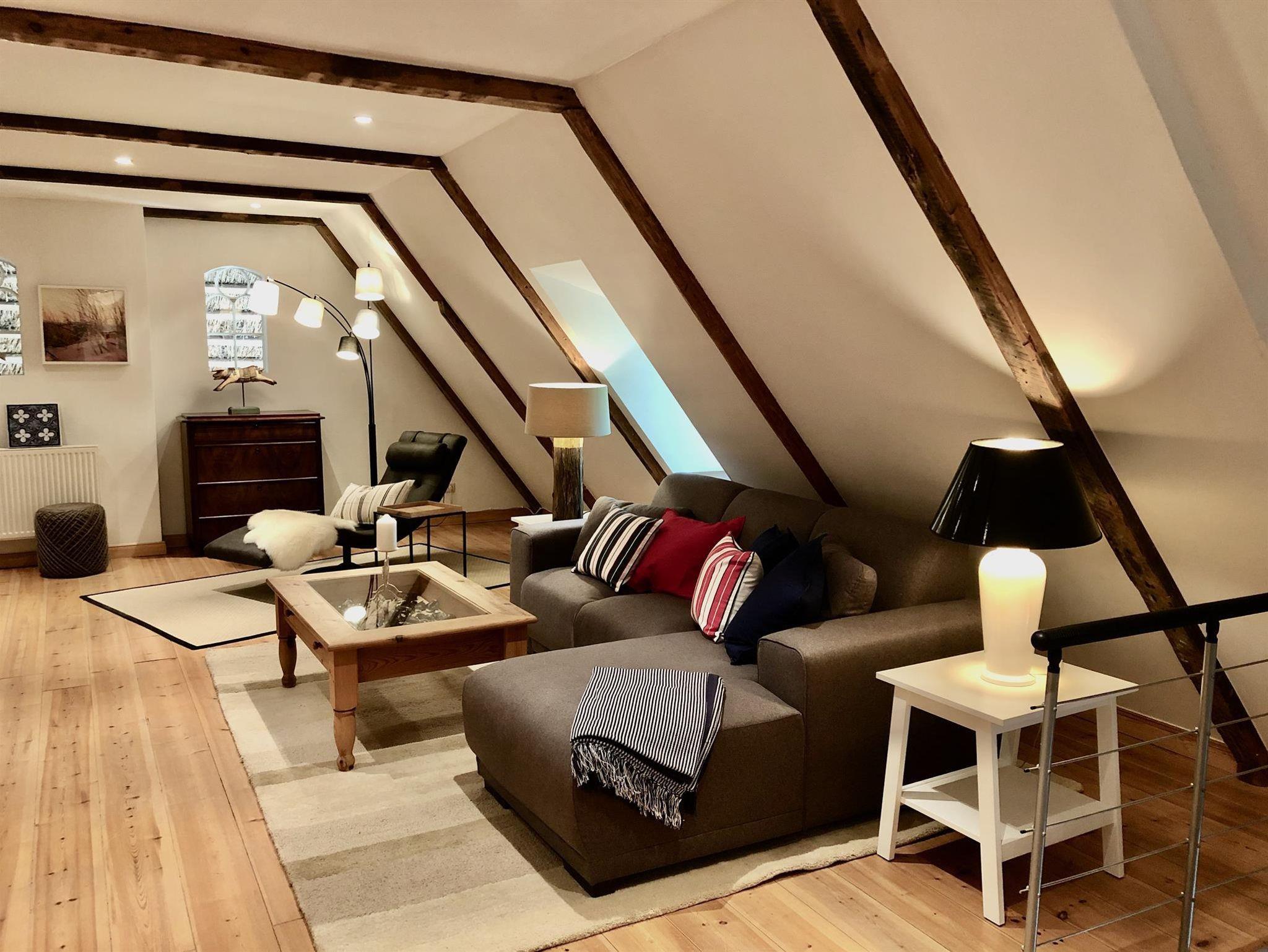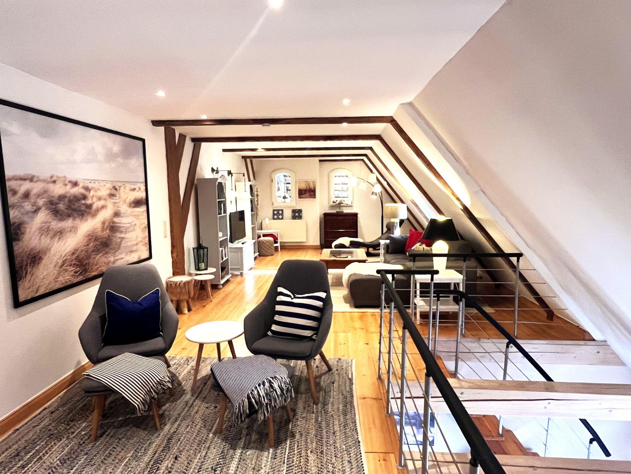 Der Wohnbereich im Obergeschoss bietet einen tollen Kaminofen, ist großzügig aufgeteilt und modern-behaglich ausgestattet. Im Erdgeschoss finden Sie einen schönen Essplatz für bis zu vier Personen in der lichtdurchfluteten Wohnküche. Die beiden Schlafzimmer sind komfortabel und maritim eingerichtet und haben jeweils ein eigenes Badezimmer. Auf unserem Anwesen können Sie sich im riesigen Garten erholen und die Ruhe zur Entspannung geniessen - die eigene Sonnenterasse samt Strandkorb, Brise und Weitblick sind inklusive.