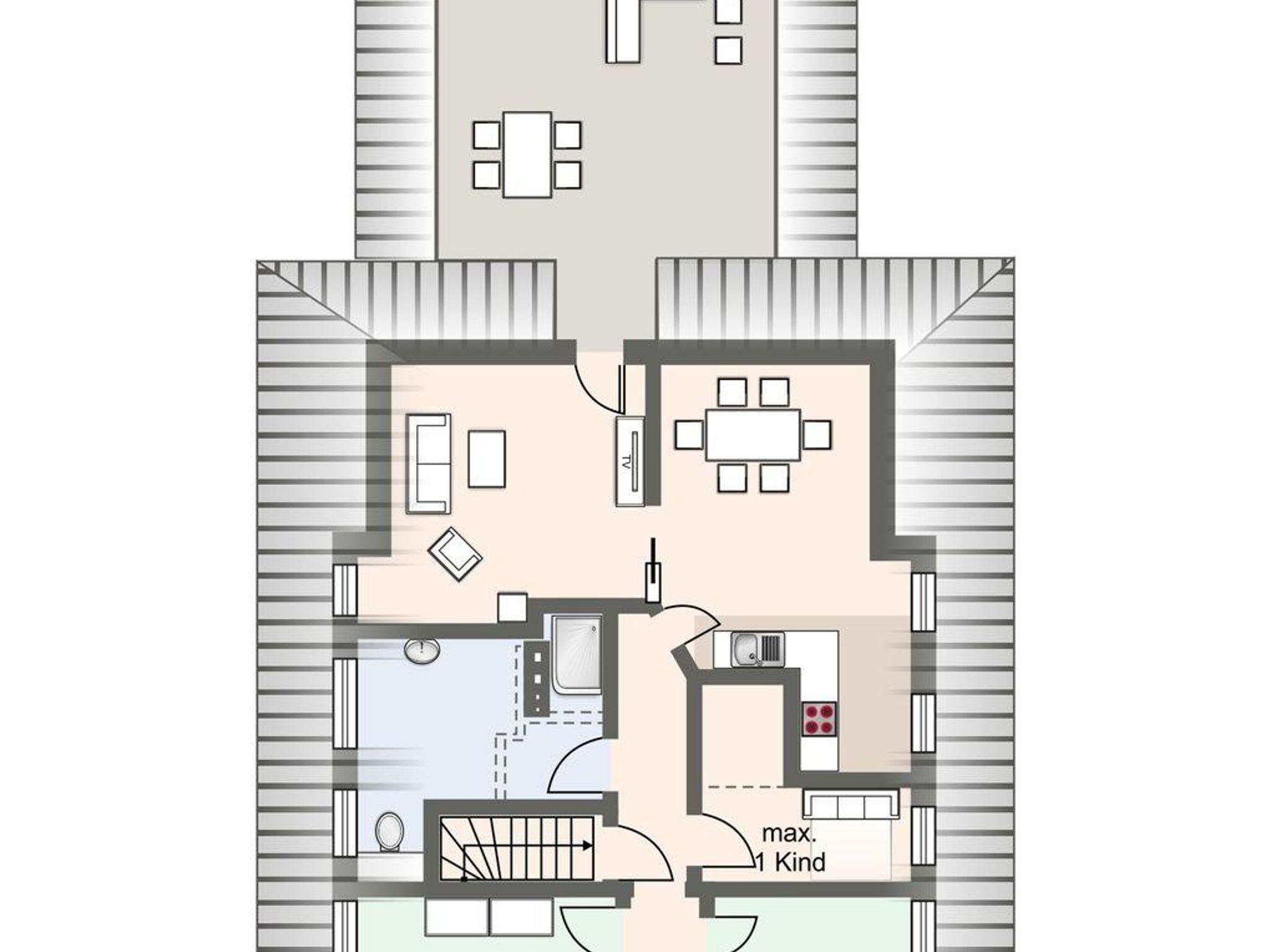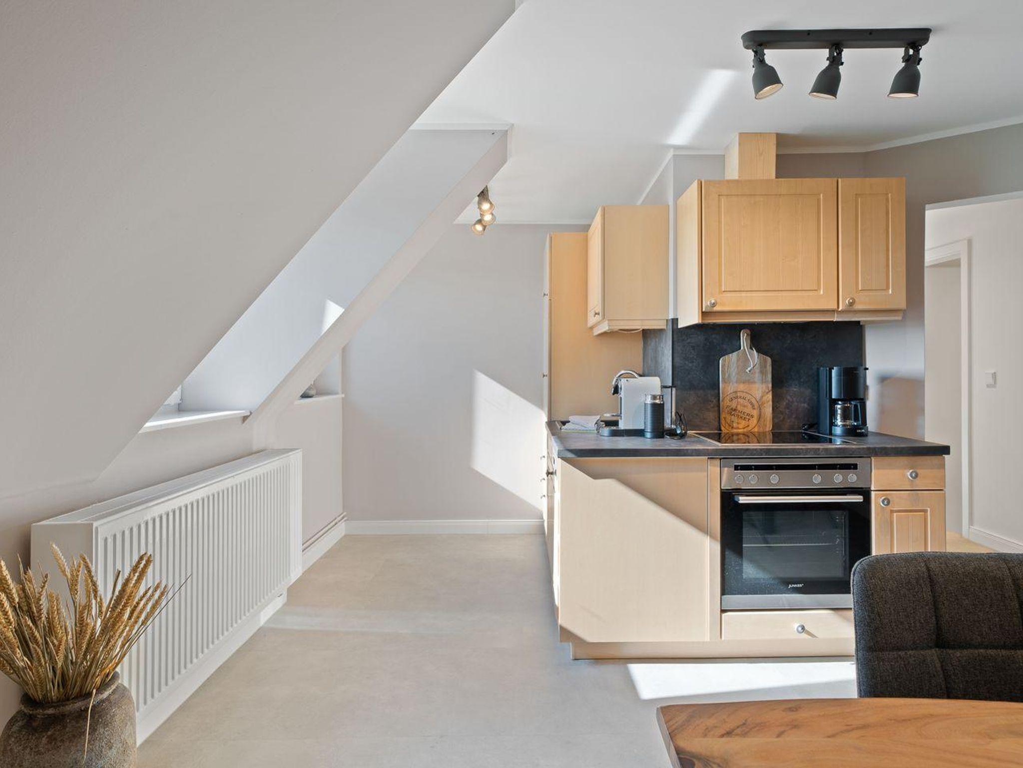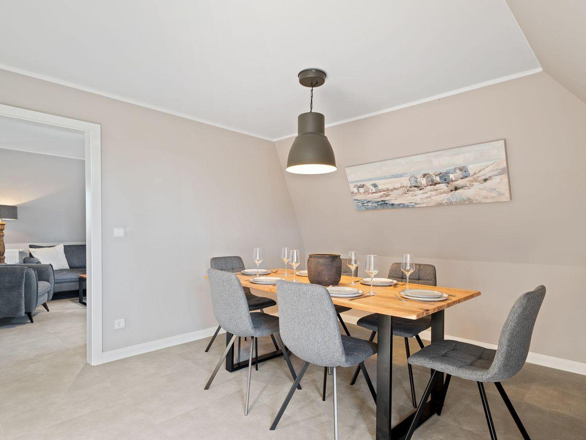Die Ferienwohnung verfügt über ca. 60 m² Wohnfläche und ist wie folgt aufgeteilt: Ein geräumiger Wohnraum mit TV und Zugang zur großzügigen Dachterrasse. Die Küche ist voll ausgestattet und grenzend an den offenen Wohn- und Essenbereich. Ein separates Duschbad bietet allen Komfort. Vom Flur aus gelangen Sie in die Schlafzimmer mit einem Boxspringbett (1,8 x 2,0 m) und einem weiteren Schlafzimmer mit zwei Einzelbetten (0,9 x 2,0 m).