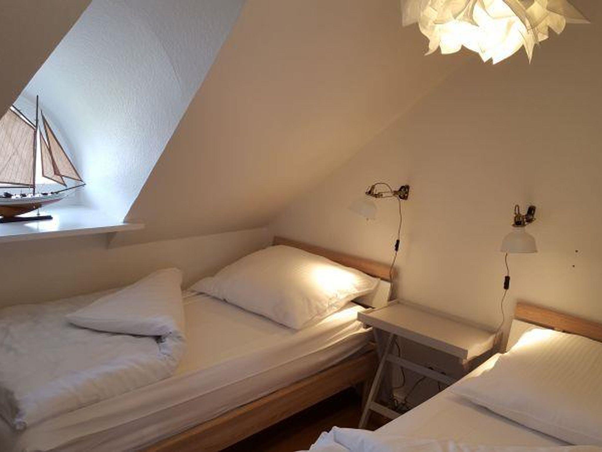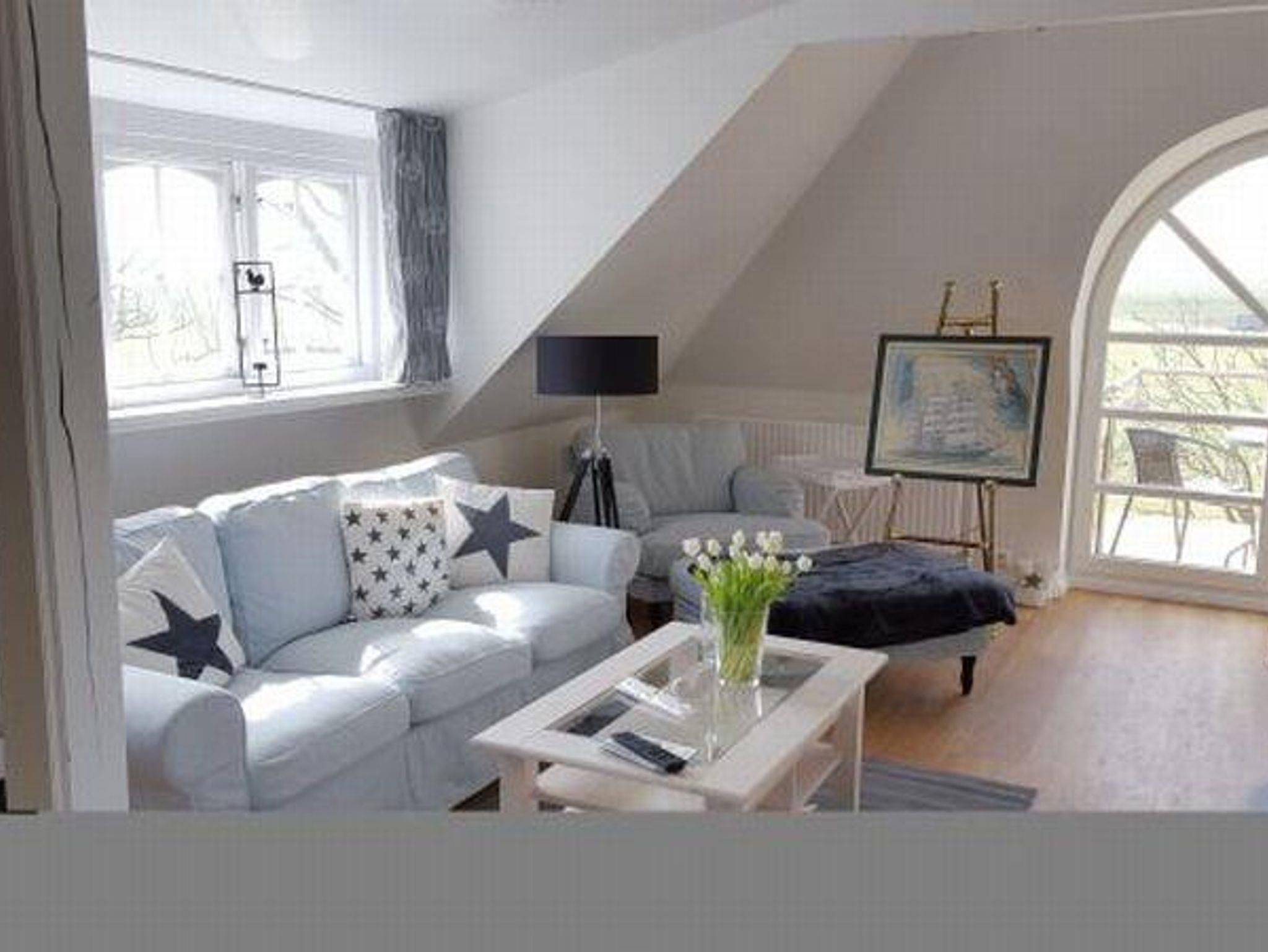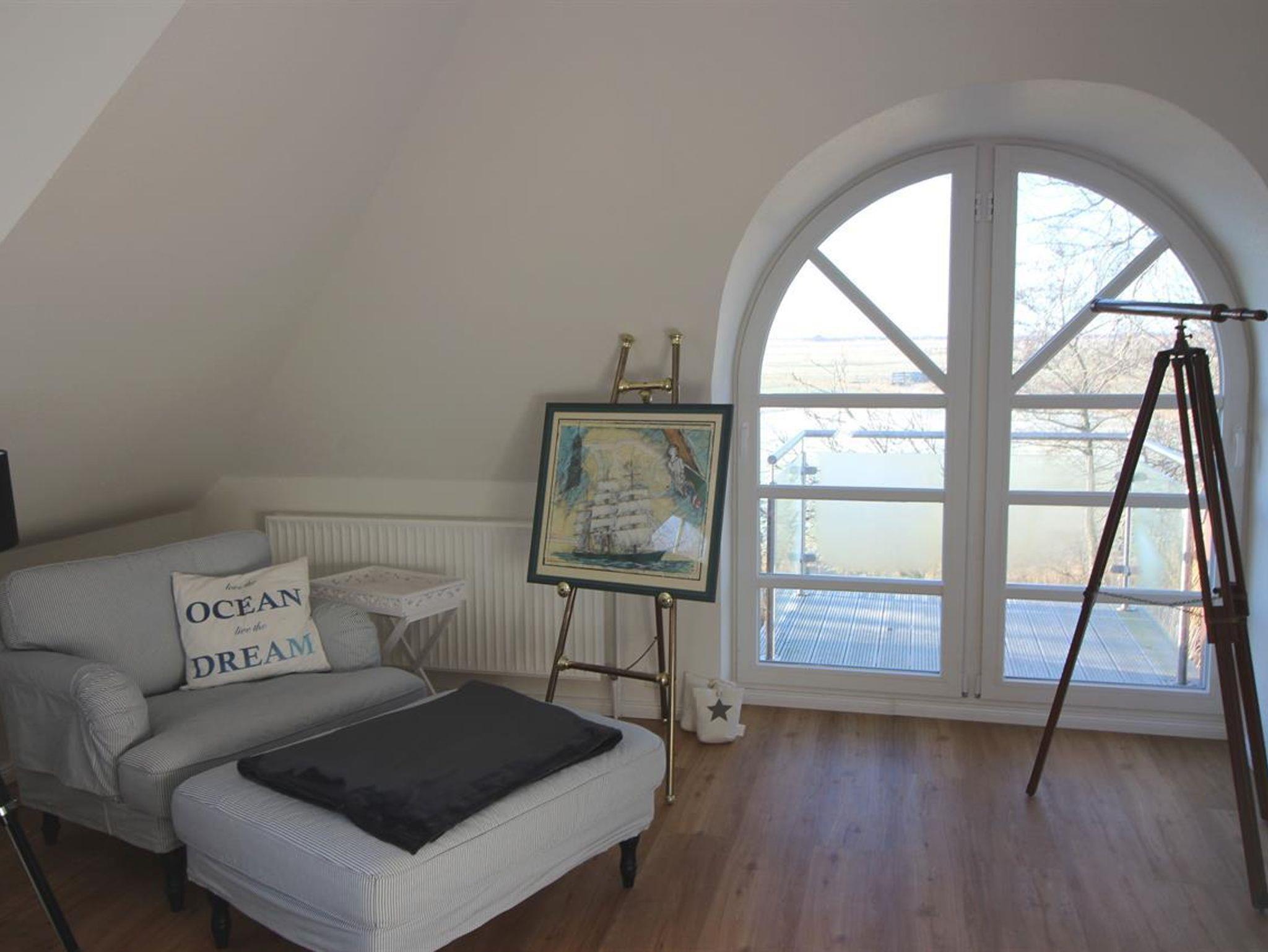 Die großzügige Dachwohnung ist ca. 100 qm groß und für 4 - 5 Personen geeignet. Durch das große Gaubenfenster mit Austritt nach Westen haben Sie einen großartigen Blick über die Wiesen zum Kirchturm und natürlich zum Leuchtturm. Die 4 Schlafkammern mit jeweils einem Gaubenfenster, sind zwar klein aber kuschelig. Im hellen Wohnraum befindet sich die Sitzecke mit lässigen Sitzmöbeln und Kaminofen. Im großen Küchenbereich mit Spülmaschine und freistehendem Kühlschrank lädt der große Esstisch zu schönen Gemeinschaftserlebnissen ein.