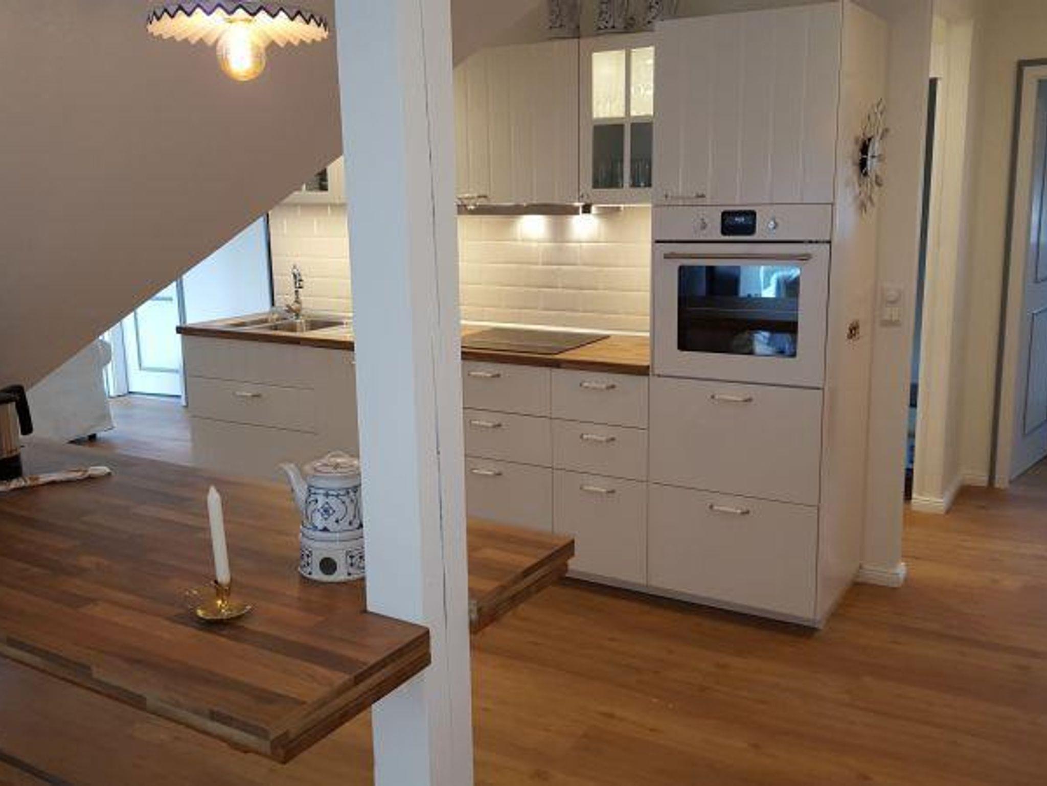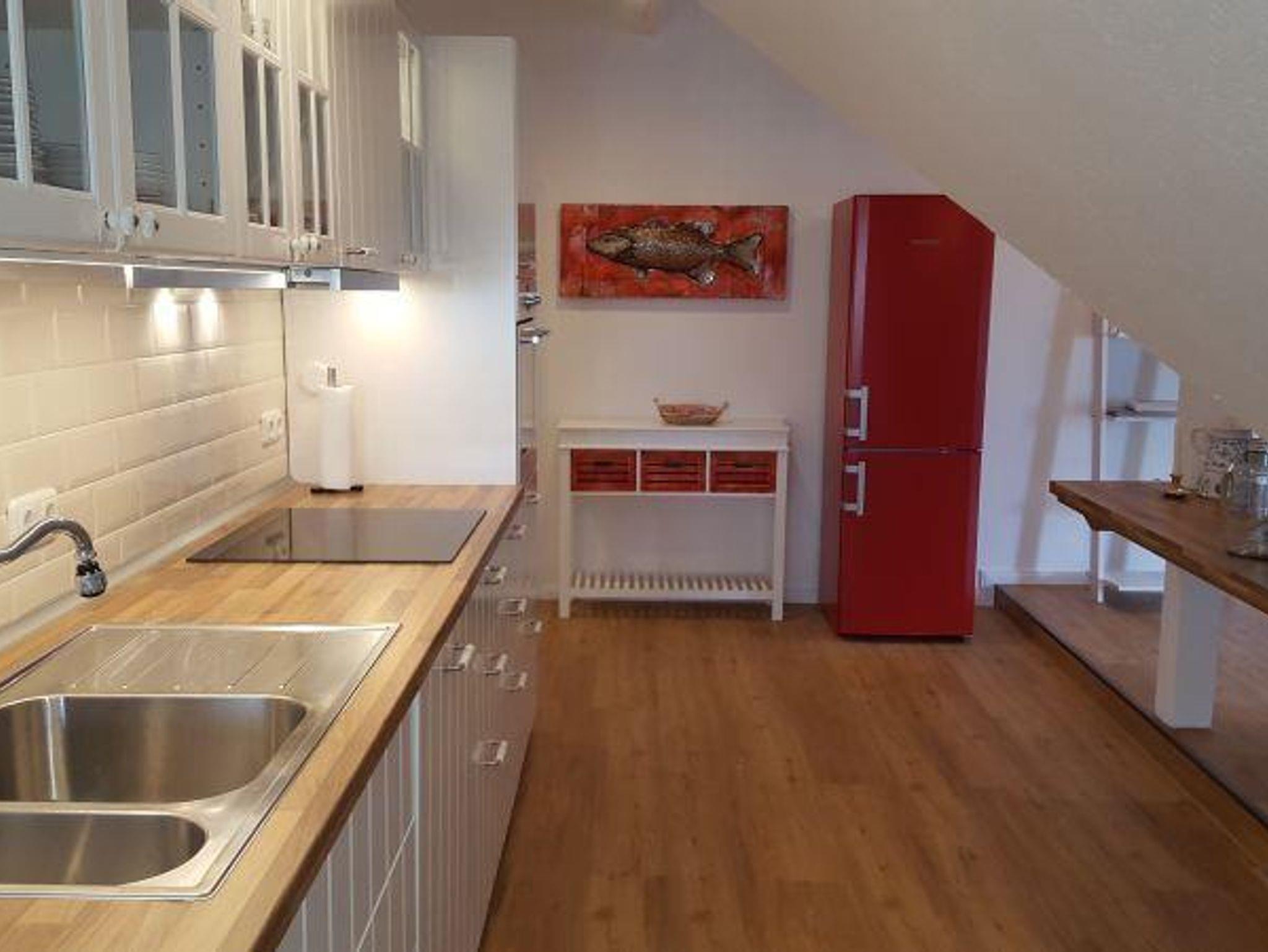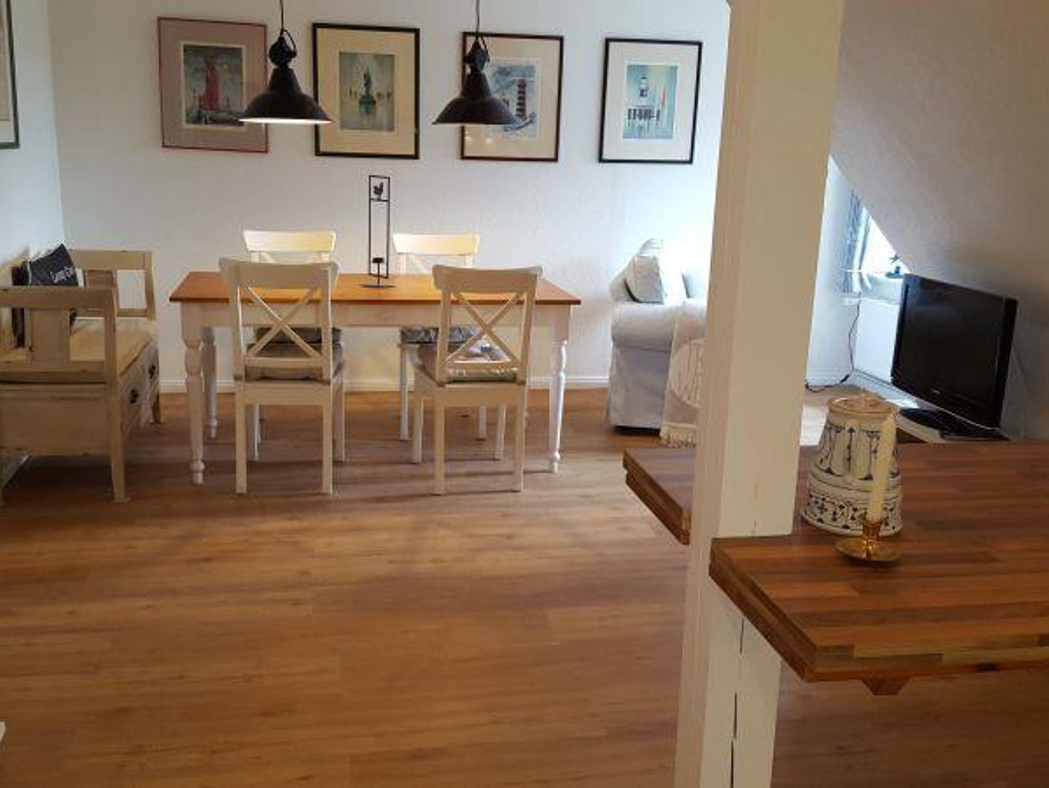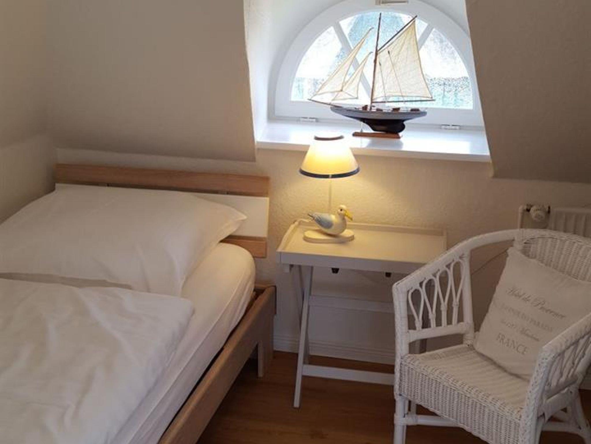 Die großzügige Dachwohnung ist ca. 100 qm groß und für 4 - 5 Personen geeignet. Durch das große Gaubenfenster mit Austritt nach Westen haben Sie einen großartigen Blick über die Wiesen zum Kirchturm und natürlich zum Leuchtturm. Die 4 Schlafkammern mit jeweils einem Gaubenfenster, sind zwar klein aber kuschelig. Im hellen Wohnraum befindet sich die Sitzecke mit lässigen Sitzmöbeln und Kaminofen. Im großen Küchenbereich mit Spülmaschine und freistehendem Kühlschrank lädt der große Esstisch zu schönen Gemeinschaftserlebnissen ein.