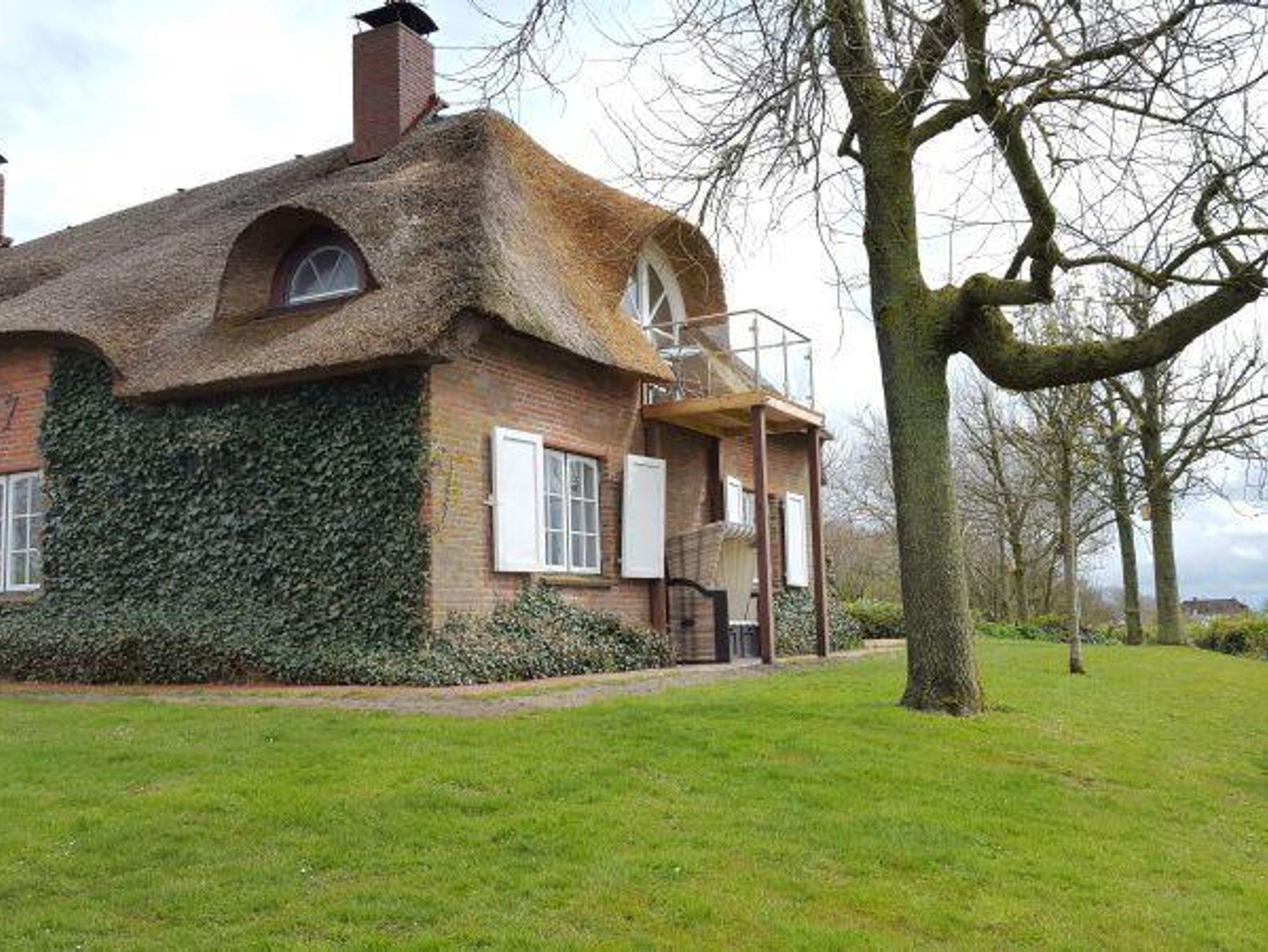 Friesenhaus Westerhever: Historisches Reetdachhaus mit Kamin, Terrasse und Blick auf Leuchtturm, ideal für Erholung an der Nordsee.