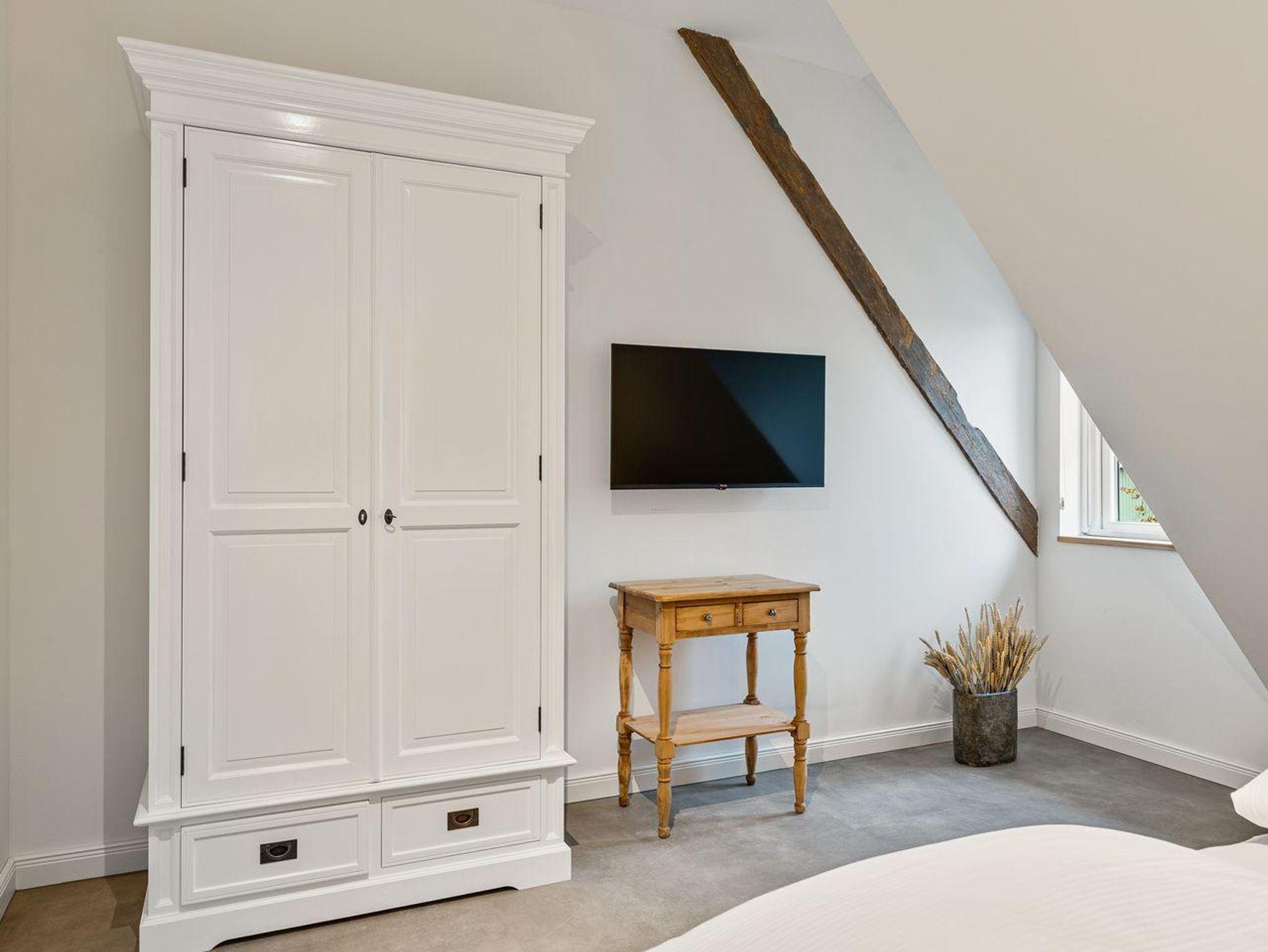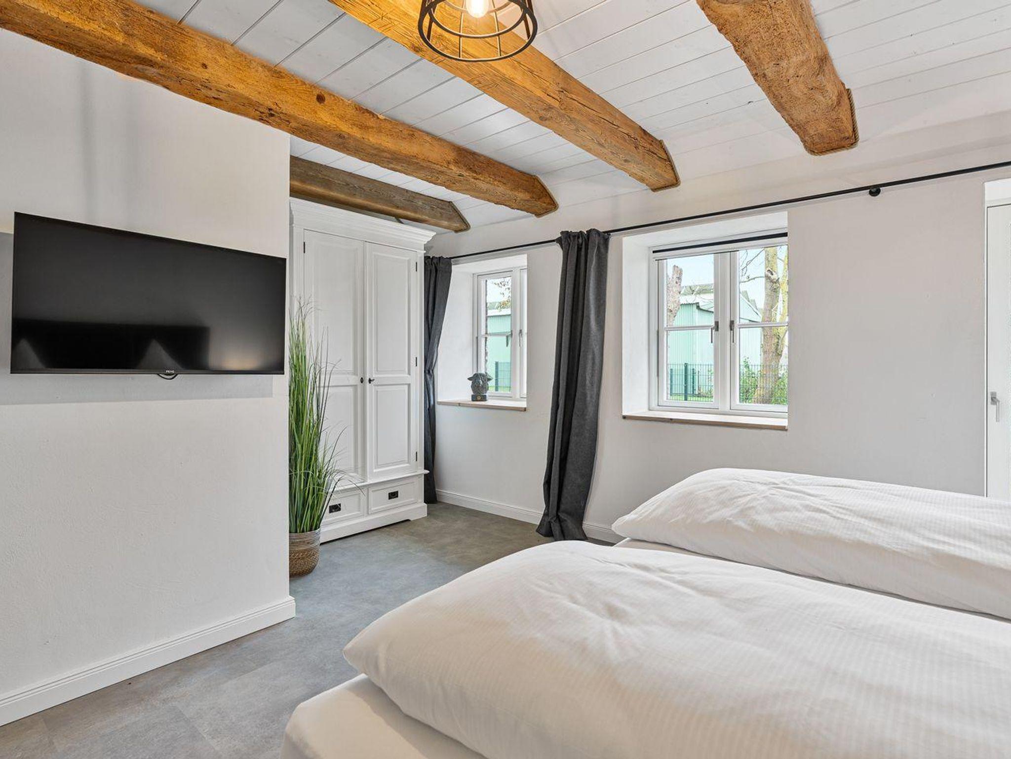 Vom Wohnbereich gelangen Sie über eine Lofttreppe ins Obergeschoss. Hier befinden sich zwei weitere Schlafzimmer, jeweils mit einem Boxspringbett (1,8 x 2,0 m) und je einem TV, sowie ein separates Duschbad mit zusätzlichem WC.