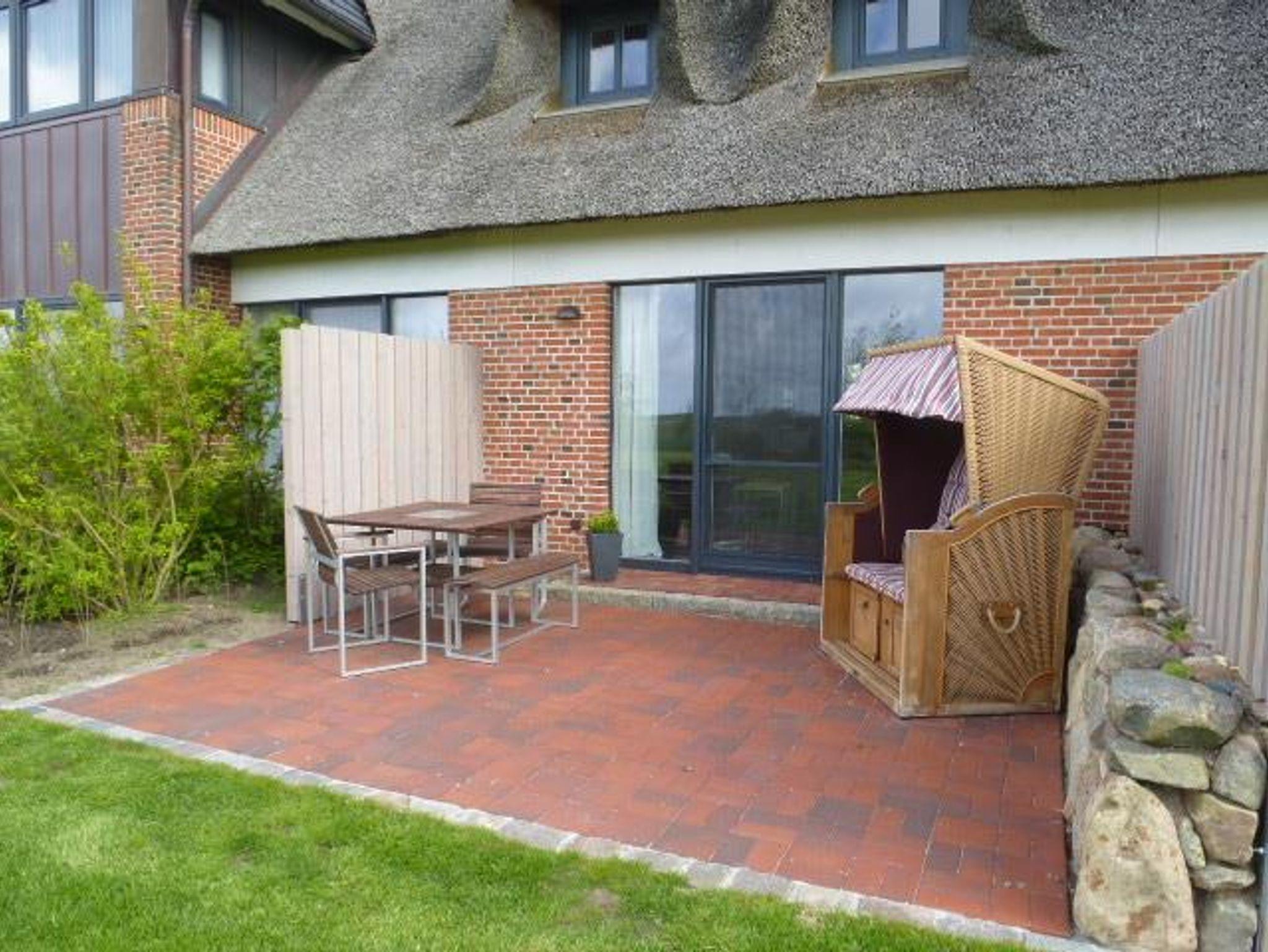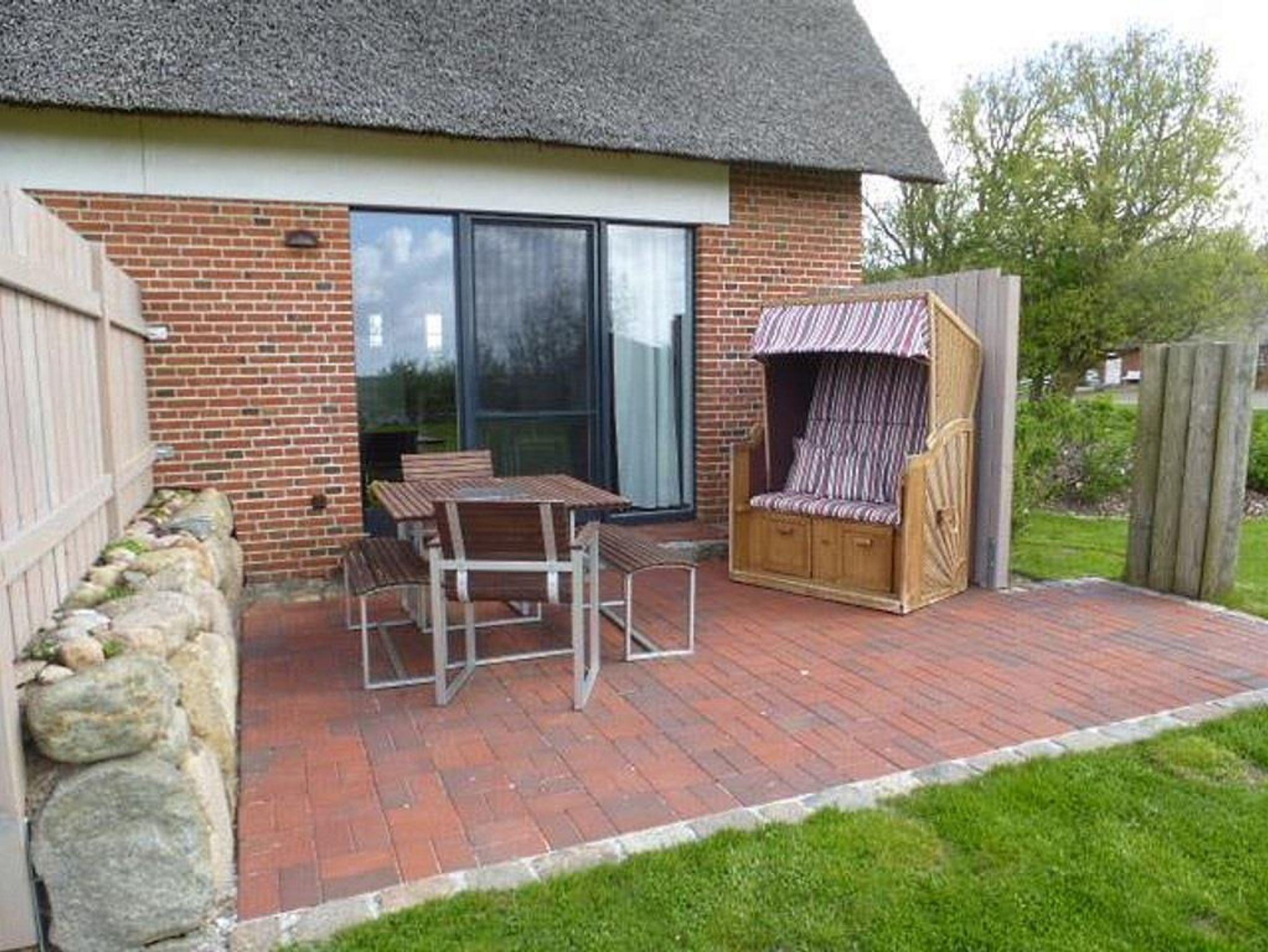 Gemütliche Ferienwohnung unter Reet in Westerhever mit Terrasse, Gartenblick und Strandkorb für erholsamen Nordseeurlaub.