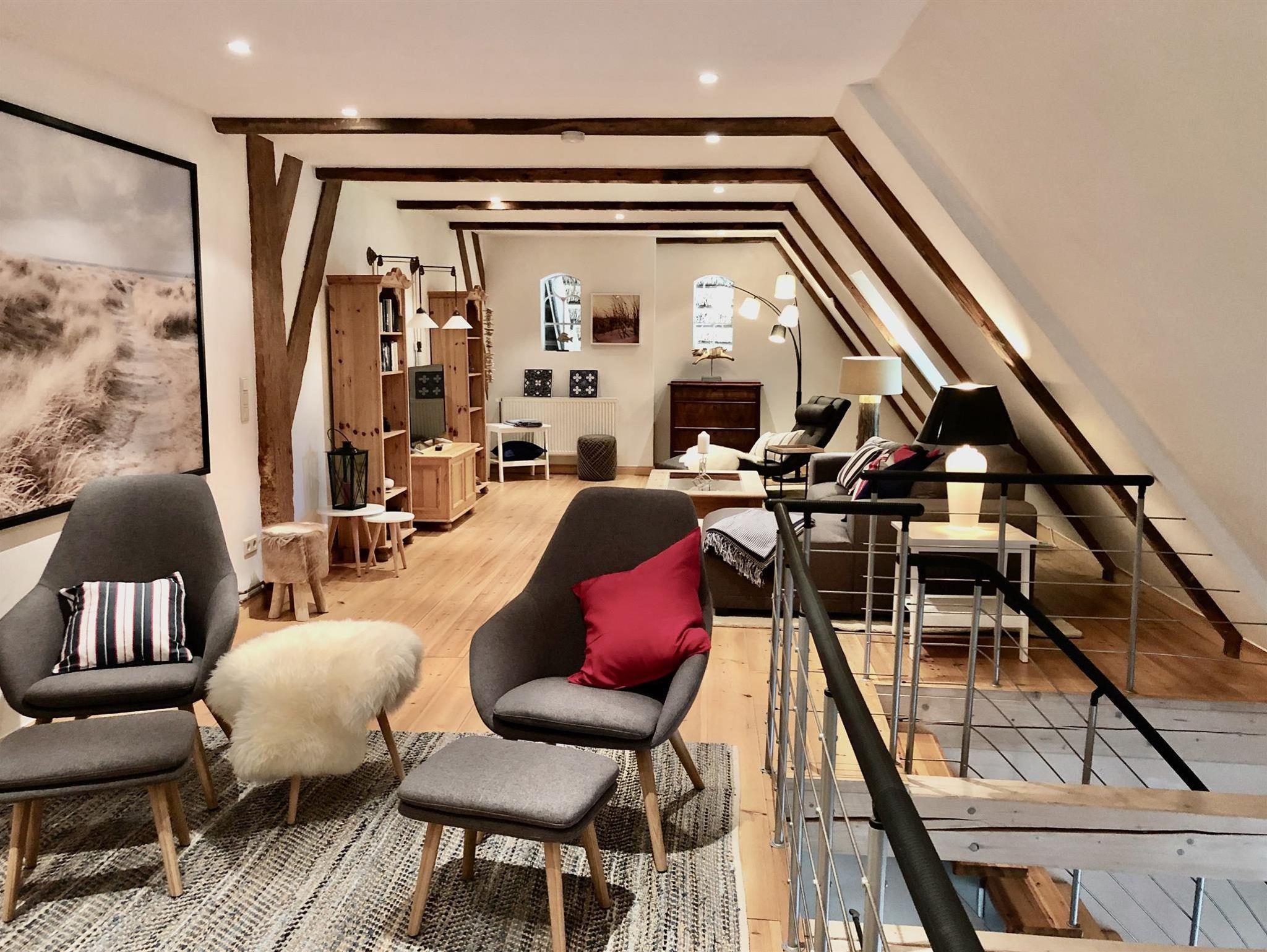 Im Obergeschoss stehen Ihnen neben einem separaten, stilvollen Wohnzimmer mit TV und XXL-Sofa mit der Bibliothek ein weiterer Rückzugsort zur Verfügung. Dieser ist über eine Galerie sehr hell und offen gestaltet, verbreitet mit Bildern & Einrichtung sehr viel Nordsee-Flair und bietet durch eine tolle Dachgabue einen Blick Richtung Leuchtterm. Die Ausstattung haben wir auch hier bspw. mit einer bequemen Recamiere modern-maritim gehalten.