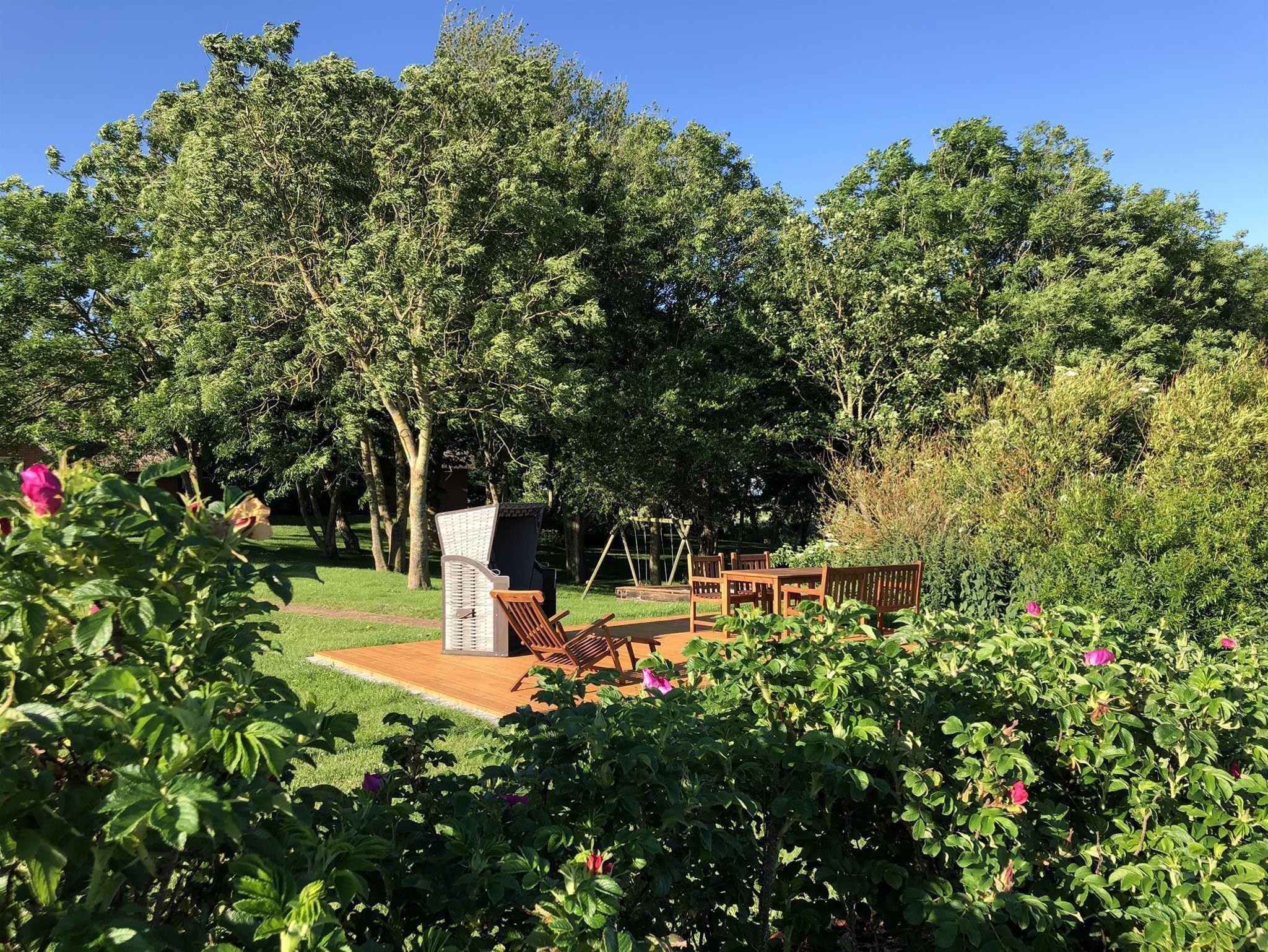 Im Garten steht Ihnen Ihre eigene, private Sonnenterassen samt Strandkorb und Gartenmöbeln zur Verfügung. Neben viel Platz für Kinder und Hunde gibt er einen riesigen Sandkasten, Schaukeln, sowie einen Grillplatz - perfekt für einen schönen lauen Abend im Freien. Ab Sommer 2020 werden wir mit unserem Badefass/ Whirlpool noch mehr tolle Erlebnisse für Sie bereithalten. Mit unserer hauseigenen Sauna (ab Winter 2020) können Sie auch in der kalten Jahreszeit optimal ausspannen und sich nach einem anstrengenden Tag am Strand oder vom Wandern erholen. Die großzügigen Parkplätze zur exklusiven Nutzung direkt auf dem Grundstück vor der Tür runden das Bild ab. In der 120qm großen Loo-Diele können Fahrräder, etc. sicher abgestellt und E-Bikes geladen werden.