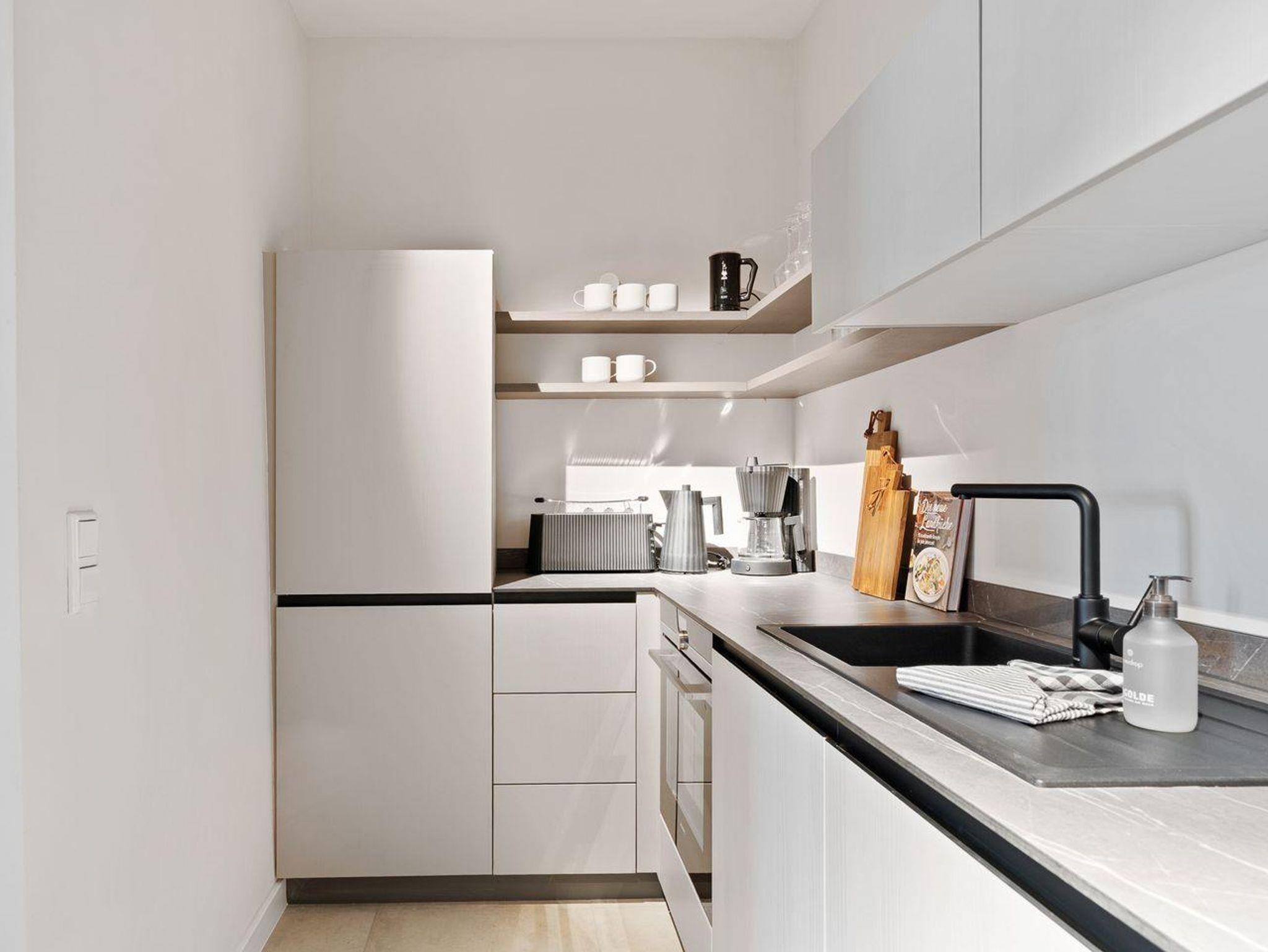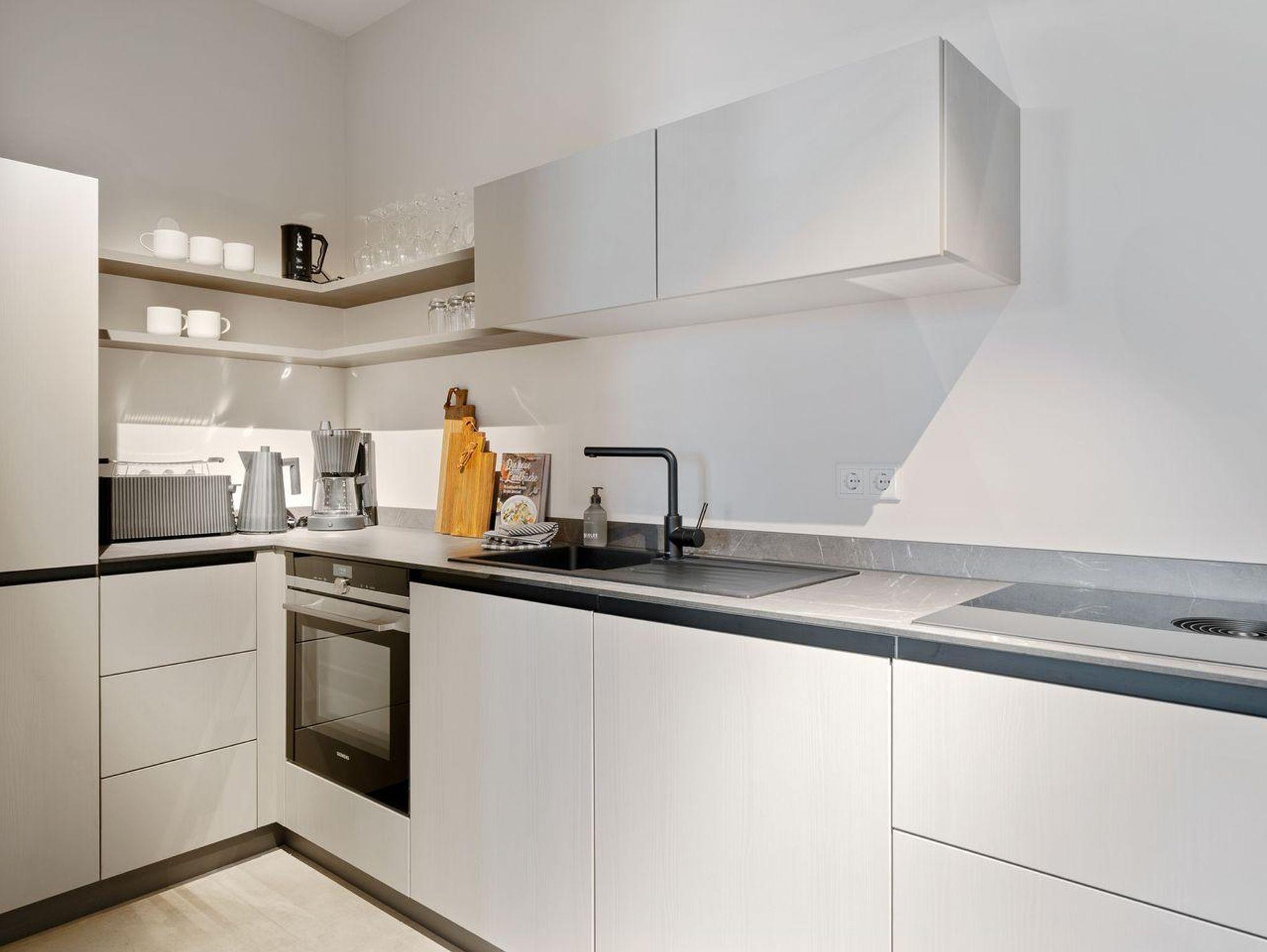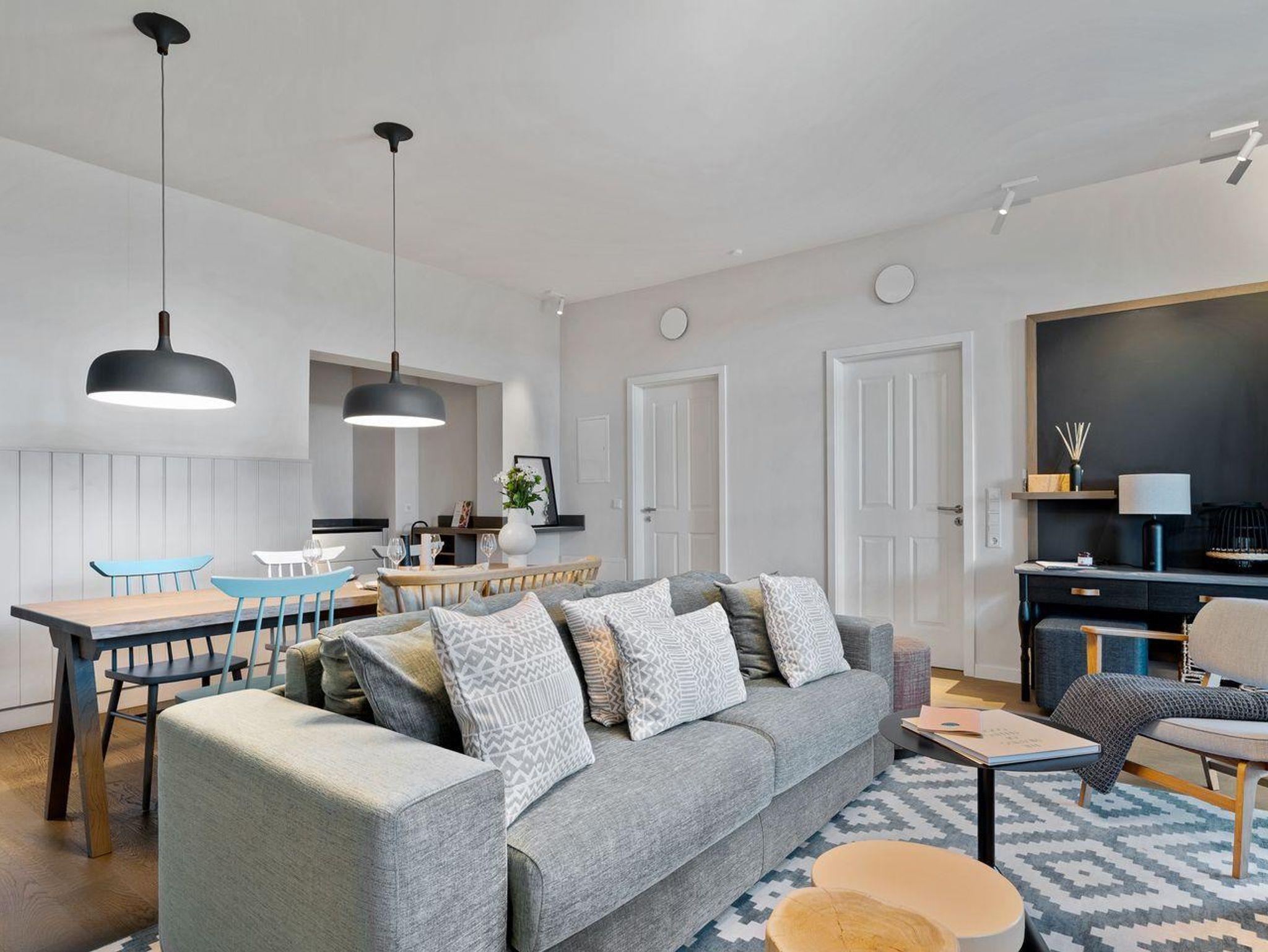 Die offene und exklusive Küche ist komplett ausgestattet und ideal für alle, die gerne selbst kochen. Hier finden Sie alle notwendigen Küchenutensilien sowie Hochwertige E-Geräte wie einen Induktionsherd, einen Backofen, eine Spülmaschine, eine Kaffeemaschine um Ihren Morgen mit einer Tasse frisch gebrühten Kaffee zu beginnen. Der eingerichtet Wohnbereich ist hell und exklusiv gestaltet und verbindet sich harmonisch mit der Küche. Gemütliche Abende können Sie beim Fernsehen verbringen; die Ferienwohnung ist mit zwei TV-Geräten ausgestattet, sodass Sie Ihre Lieblingssendungen in beiden Bereichen genießen können.