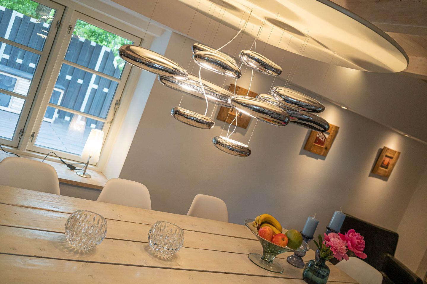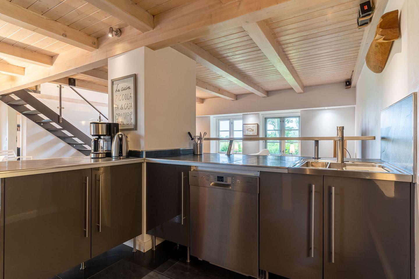 Die liebevoll sanierte Immobilie besticht durch ihre besondere Architektur und den modernen Charme. Nach einer behutsamen 8-monatigen Restaurierung wurde sie zu einem außergewöhnlichen Ferienhaus umgebaut und bietet bis zu 6 Personen genügend Platz. Im lichtdurchfluteten Wohnraum mit gemütlichem Kamin, stilvollem Essbereich und offener Küche können Sie gemeinsam kulinarische Köstlichkeiten zaubern und in geselliger Runde verweilen. Die moderne Küche ist umfangreich ausgestattet und verfügt über einen 5-flammigen Gasherd - hier kommen Hobbyköche voll auf ihre Kosten. Im Erdgeschoss befinden sich außerdem zwei geräumige Schlafzimmer mit komfortablen Doppelbetten und jeweils einem eigenen Fernseher. Hier lässt sich nach einem erlebnisreichen Tag wunderbar entspannen.