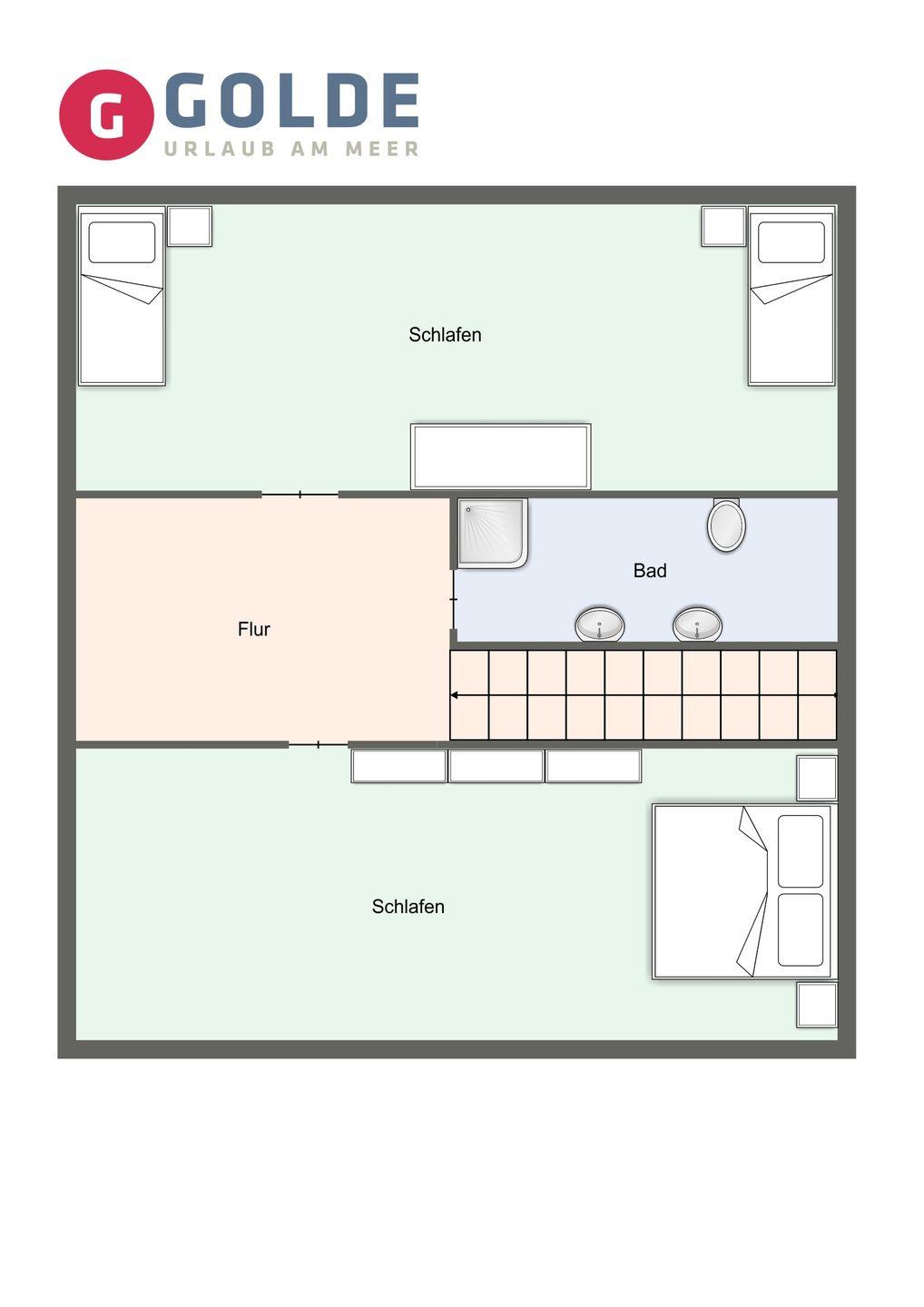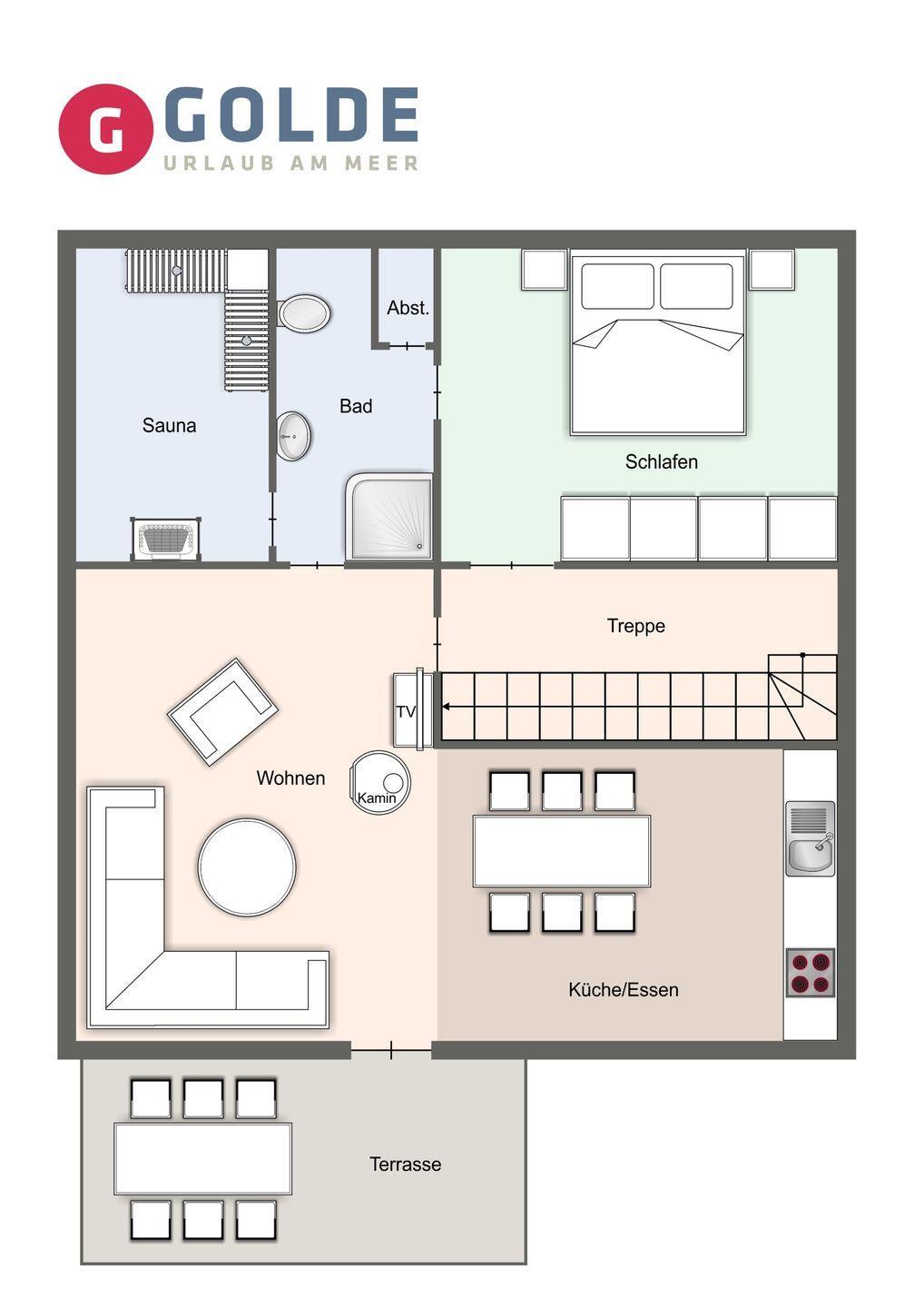 Das Ferienhaus erstreckt sich über 2 Etagen mit einer Wohnfläche von ca. 120 m². Im Erdgeschoss erwartet Sie ein geräumiger Wohnraum mit Kamin und TV, eine offene Küche und ein gemütlicher Essbereich. Die Küche ist komplett ausgestattet und bietet direkten Zugang zur Sonnenterrasse. Ein separater Wellnessbereich mit Duschbad und Sauna sorgt für besonderen Komfort. Vom Flur aus gelangen Sie in das erste Schlafzimmer mit einem Doppelbett (1,8 x 2,0 m). Über eine Holztreppe gelangen Sie ins Obergeschoss, wo sich zwei weitere Schlafzimmer mit Doppelbetten (1,8 x 2,0 m) und ein Schlafzimmer mit zwei Einzelbetten (0,9 x 2,0 m) befinden. Zudem gibt es ein weiteres Duschbad mit zusätzlichem WC im Obergeschoss.
