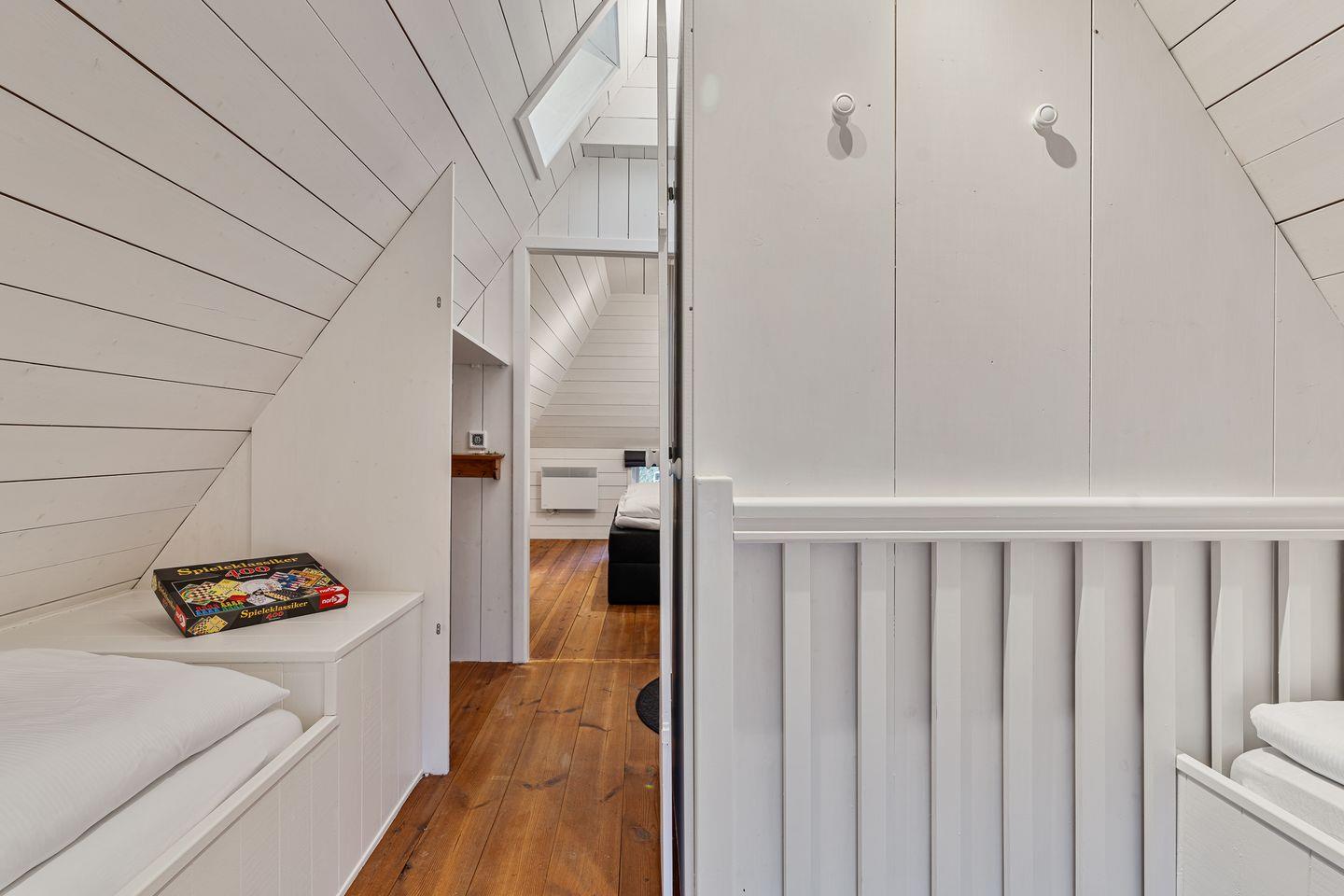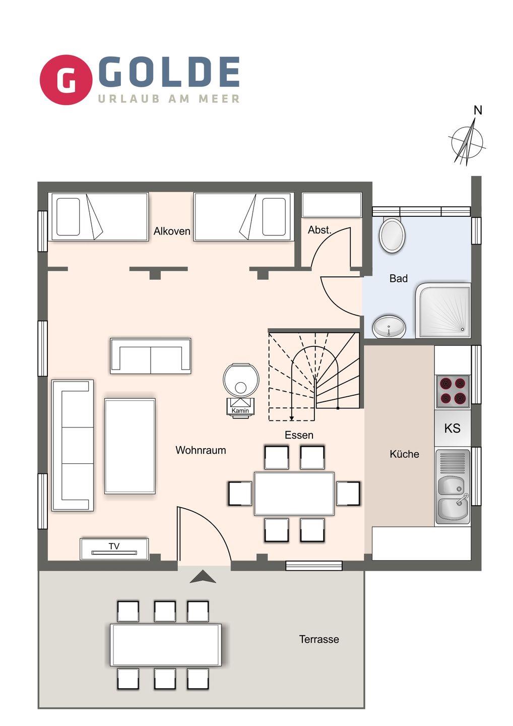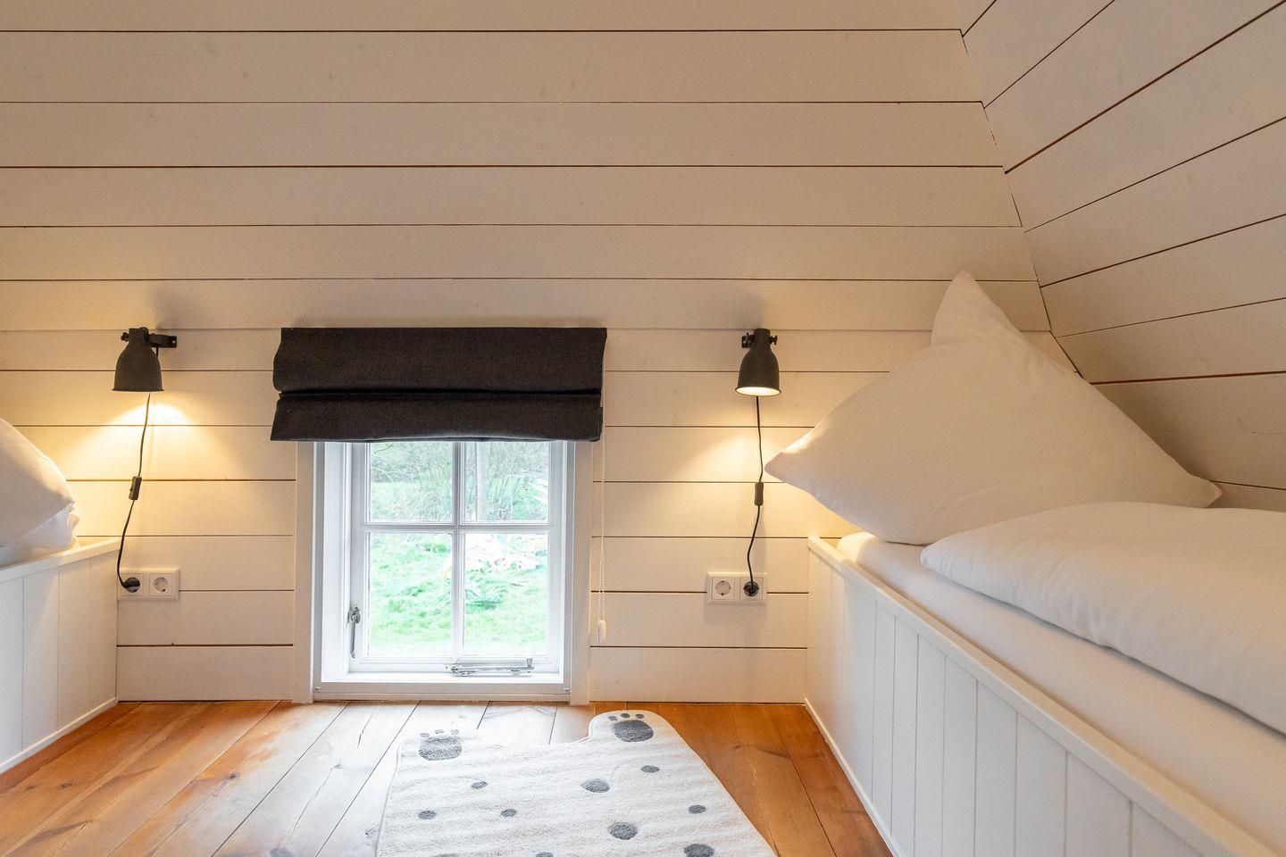 Mit einer Wohnfläche von ca. 70 m² erstreckt sich das Landhaus über 2 Etagen. Im Erdgeschoss erwartet Sie ein gemütlicher Wohnbereich mit einem wärmenden Kamin und einem TV, eine offene Küche und ein einladender Essbereich. Zusätzlich bieten zwei entzückende Alkoven (1,0 x 2,0 m) im Wohnbereich eine behagliche Schlafgelegenheit, die mit einem Vorhang für Ihre Privatsphäre abgetrennt werden kann. Das Erdgeschoss verfügt auch über ein Duschbad mit WC. Über eine Landhaustreppe gelangen Sie ins Obergeschoss, wo sich zwei weitere Schlafzimmer befinden. Das Elternschlafzimmer ist mit einem komfortablen Boxspringbett (1,8 x 2,0 m) ausgestattet, während das charmante und offene Kinderzimmer ein Einzelbett (0,9 x 2,0 m) und ein bezauberndes kleines Bett mit den Maßen 0,9 x 1,8 m bereithält.