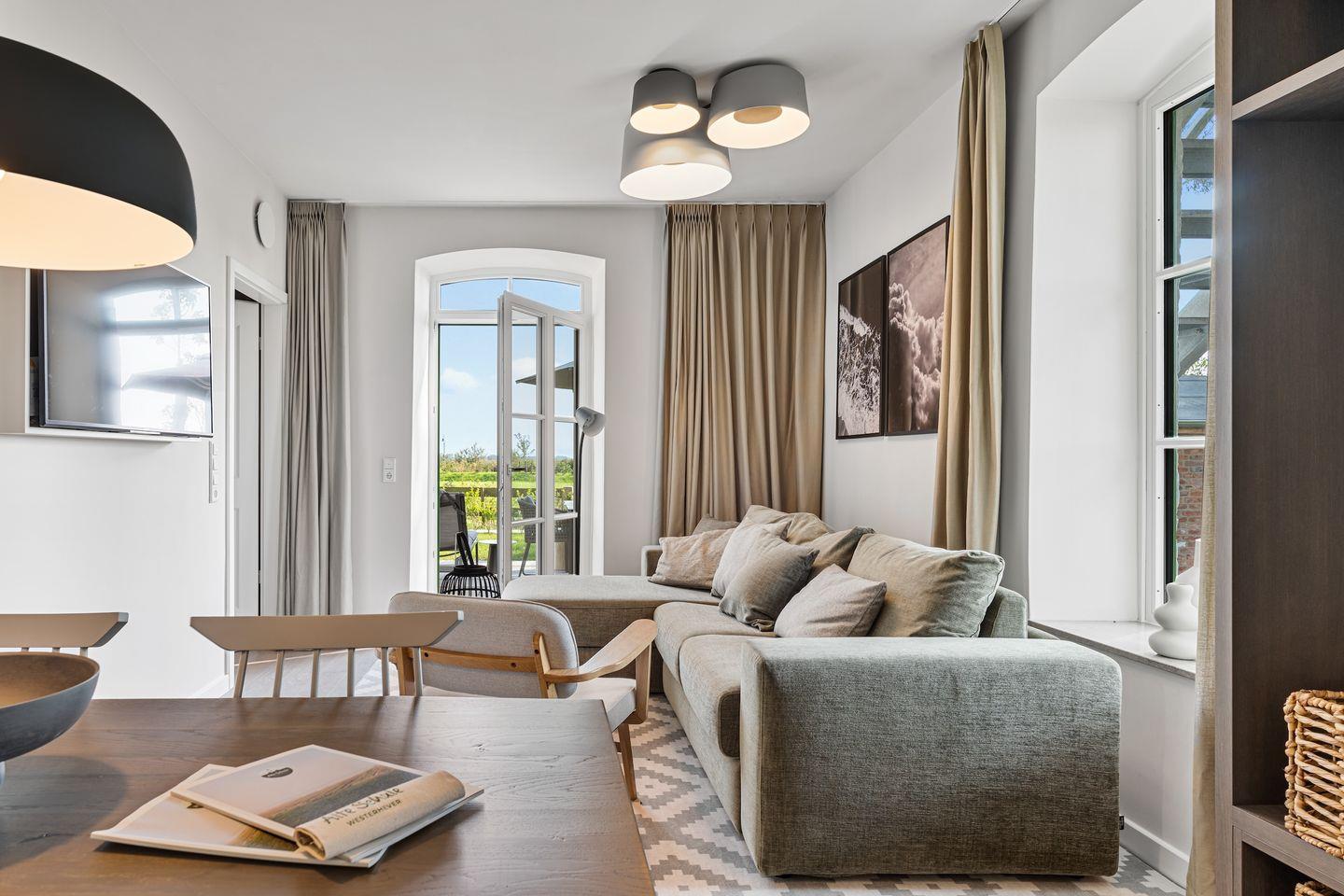 Die offene und exklusive Küche ist komplett ausgestattet und ideal für alle, die gerne selbst kochen. Hier finden Sie alle notwendigen Küchenutensilien sowie Hochwertige E-Geräte wie einen Induktionsherd, einen Backofen, eine Spülmaschine, eine Kaffeemaschine um Ihren Morgen mit einer Tasse frisch gebrühten Kaffee zu beginnen. Der eingerichtet Wohnbereich ist hell und exklusiv gestaltet und verbindet sich harmonisch mit der Küche. Gemütliche Abende können Sie beim Fernsehen verbringen; die Ferienwohnung ist mit zwei TV-Geräten ausgestattet, sodass Sie Ihre Lieblingssendungen in beiden Bereichen genießen können.