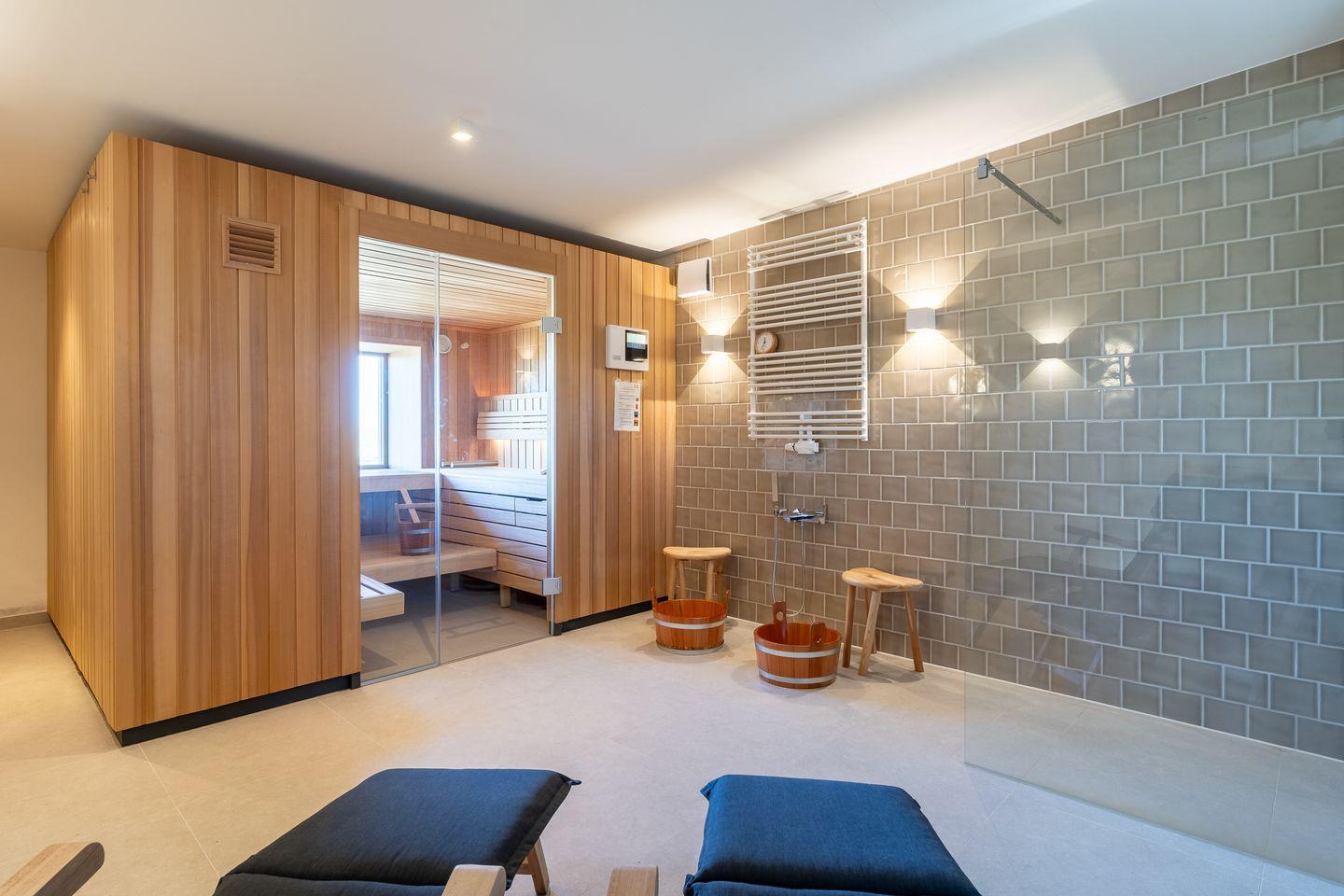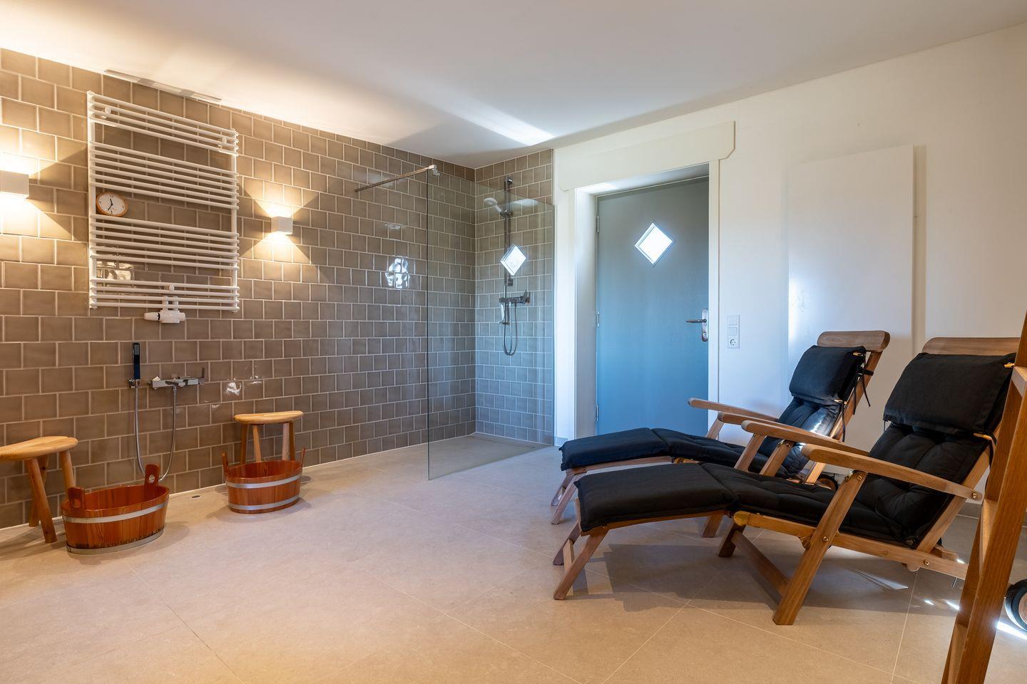 Ein separater Sauna Raum mit einer Sauna für bis zu sechs Personen und einer eigenen Dusche steht Ihnen uneingeschränkt zur Verfügung.