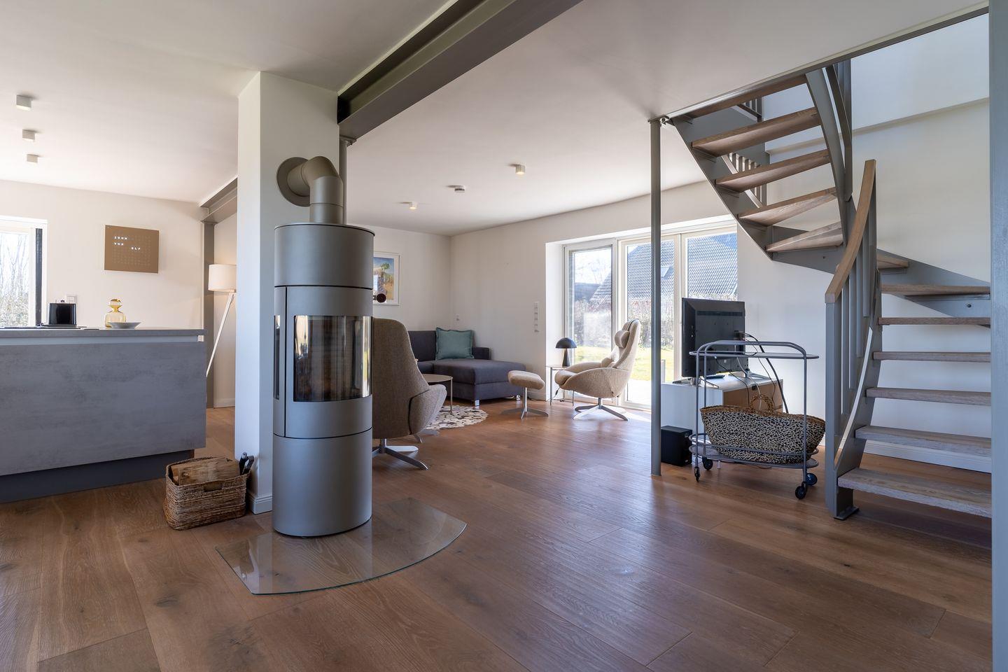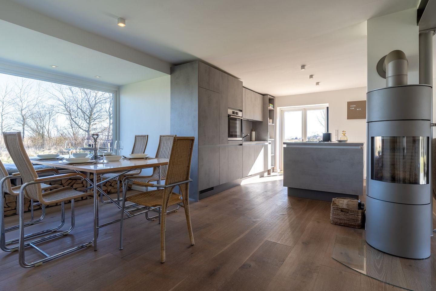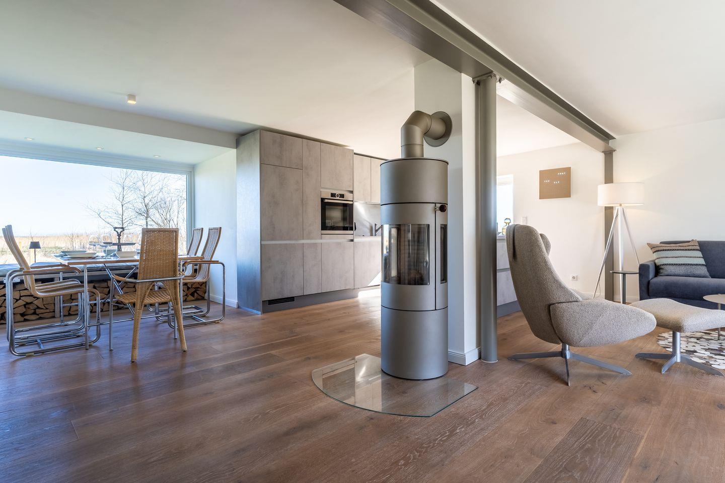 Der offene Wohnbereich mit Kamin lädt zum Entspannen ein. Eine voll ausgestattete Küche mit Ceranherd, Kühlschrank, Kaffeemaschine und mehr bietet alles für gemeinsame Kochabende. TV und WLAN stehen ebenfalls zur Verfügung.