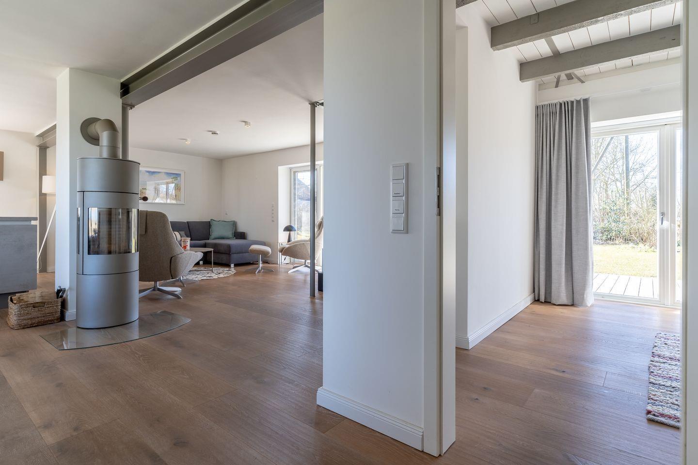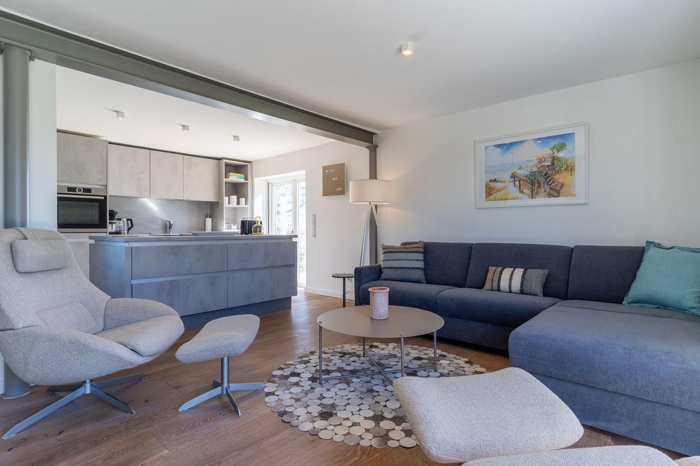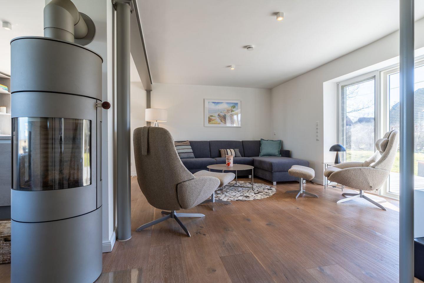Der offene Wohnbereich mit Kamin lädt zum Entspannen ein. Eine voll ausgestattete Küche mit Ceranherd, Kühlschrank, Kaffeemaschine und mehr bietet alles für gemeinsame Kochabende. TV und WLAN stehen ebenfalls zur Verfügung.