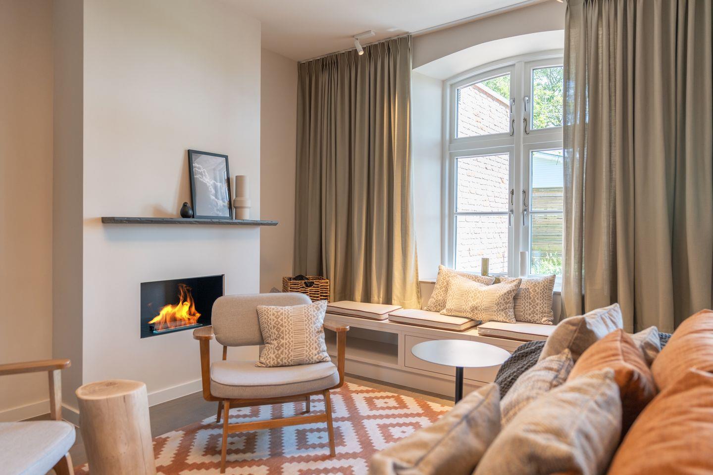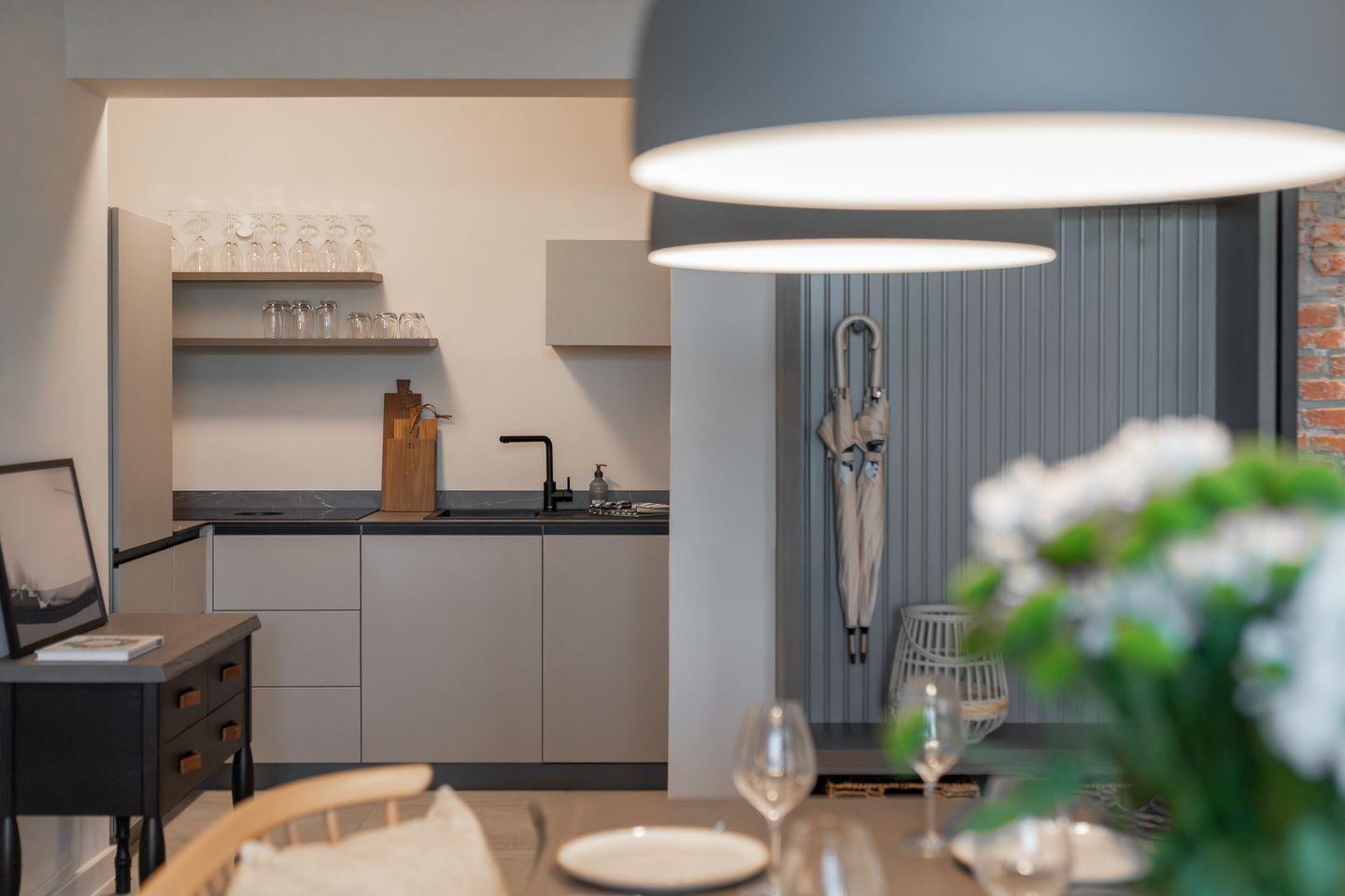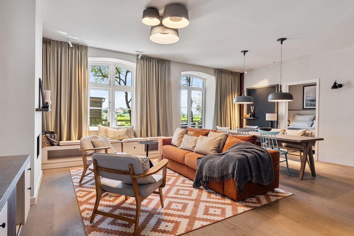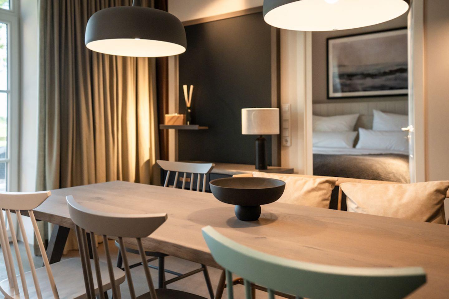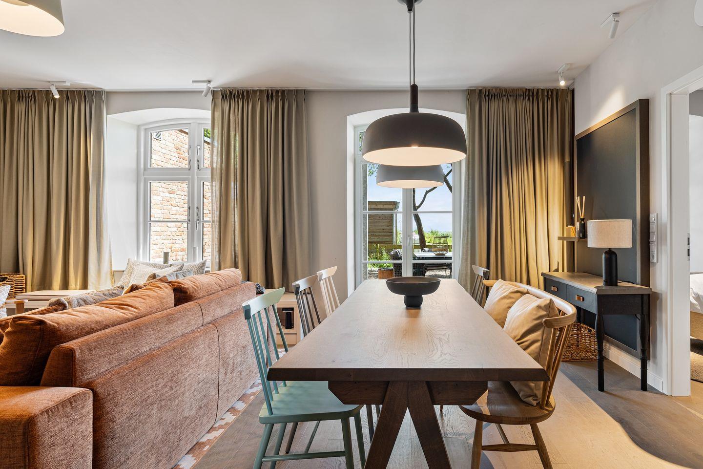 Die offene und exklusive Küche ist komplett ausgestattet und ideal für alle, die gerne selbst kochen. Hier finden Sie alle notwendigen Küchenutensilien sowie Hochwertige E-Geräte wie einen Induktionsherd, einen Backofen, eine Spülmaschine, eine Kaffeemaschine um Ihren Morgen mit einer Tasse frisch gebrühten Kaffee zu beginnen. Der eingerichtet Wohnbereich ist hell und exklusiv gestaltet und verbindet sich harmonisch mit der Küche. Gemütliche Abende können Sie beim Fernsehen verbringen; die Ferienwohnung ist mit zwei TV-Geräten ausgestattet, sodass Sie Ihre Lieblingssendungen in beiden Bereichen genießen können.