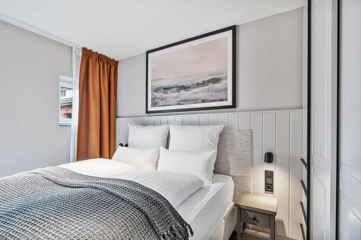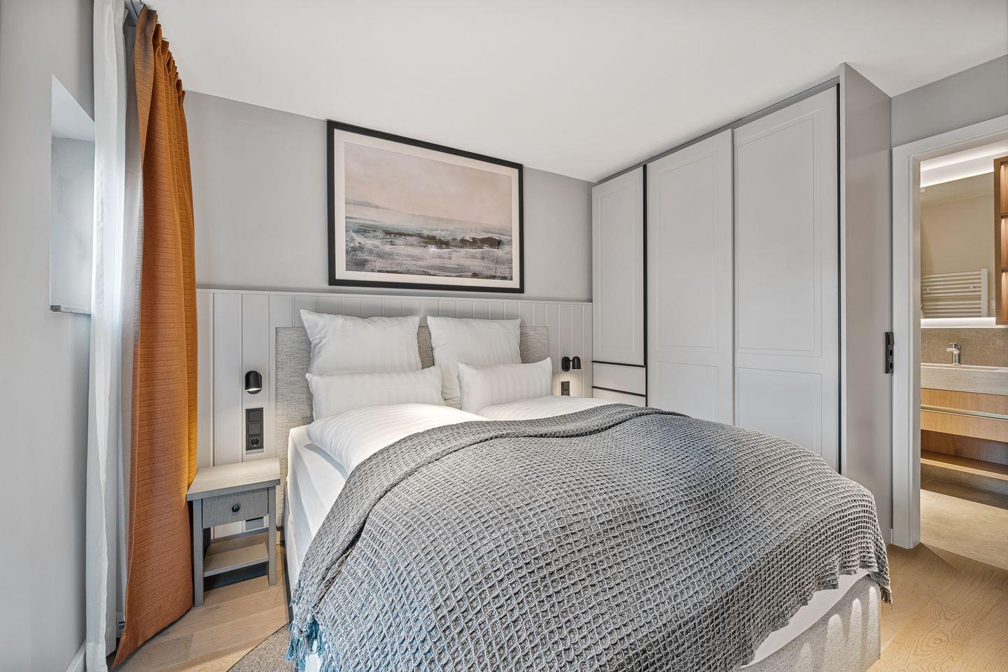 Ein ruhiges Schlafzimmer mit erstklassigem Boxspinrgbett (1,80 x 2,00) bietet Rückzugsmöglichkeiten für erholsame Nächte. Die Fußbodenheizung sorgt in der kalten Jahreszeit für wohlige Wärme, während der Sichtschutz an allen Fenstern für Privatsphäre während Ihres Aufenthalts sorgt. Vom Schlafzimmer aus steht Ihnen außerdem ein eigenes Bad mit Dusche zur Verfügung.
