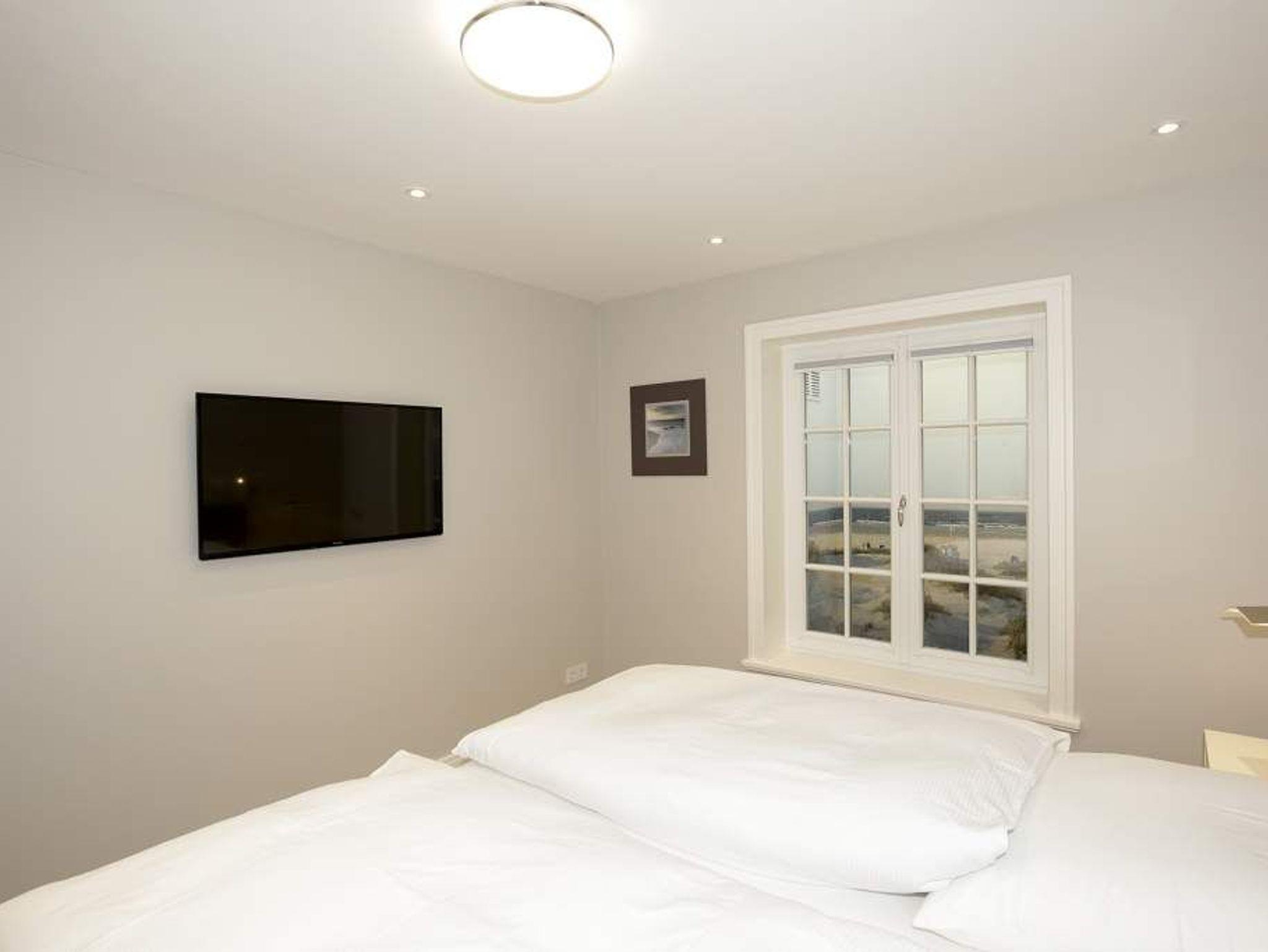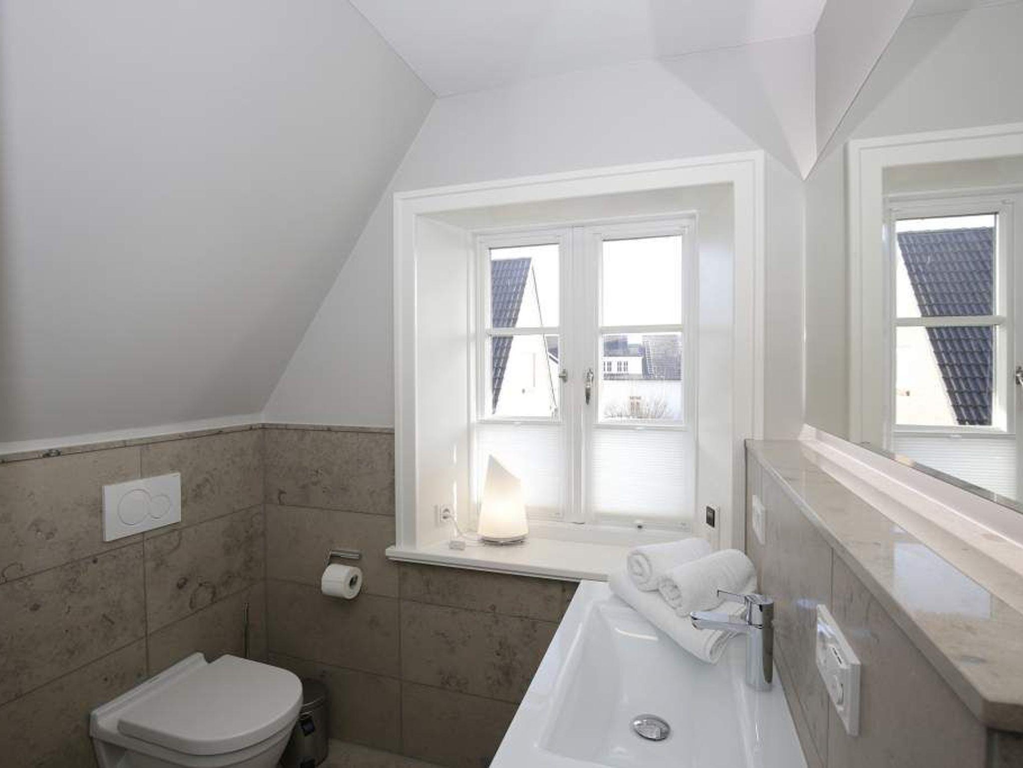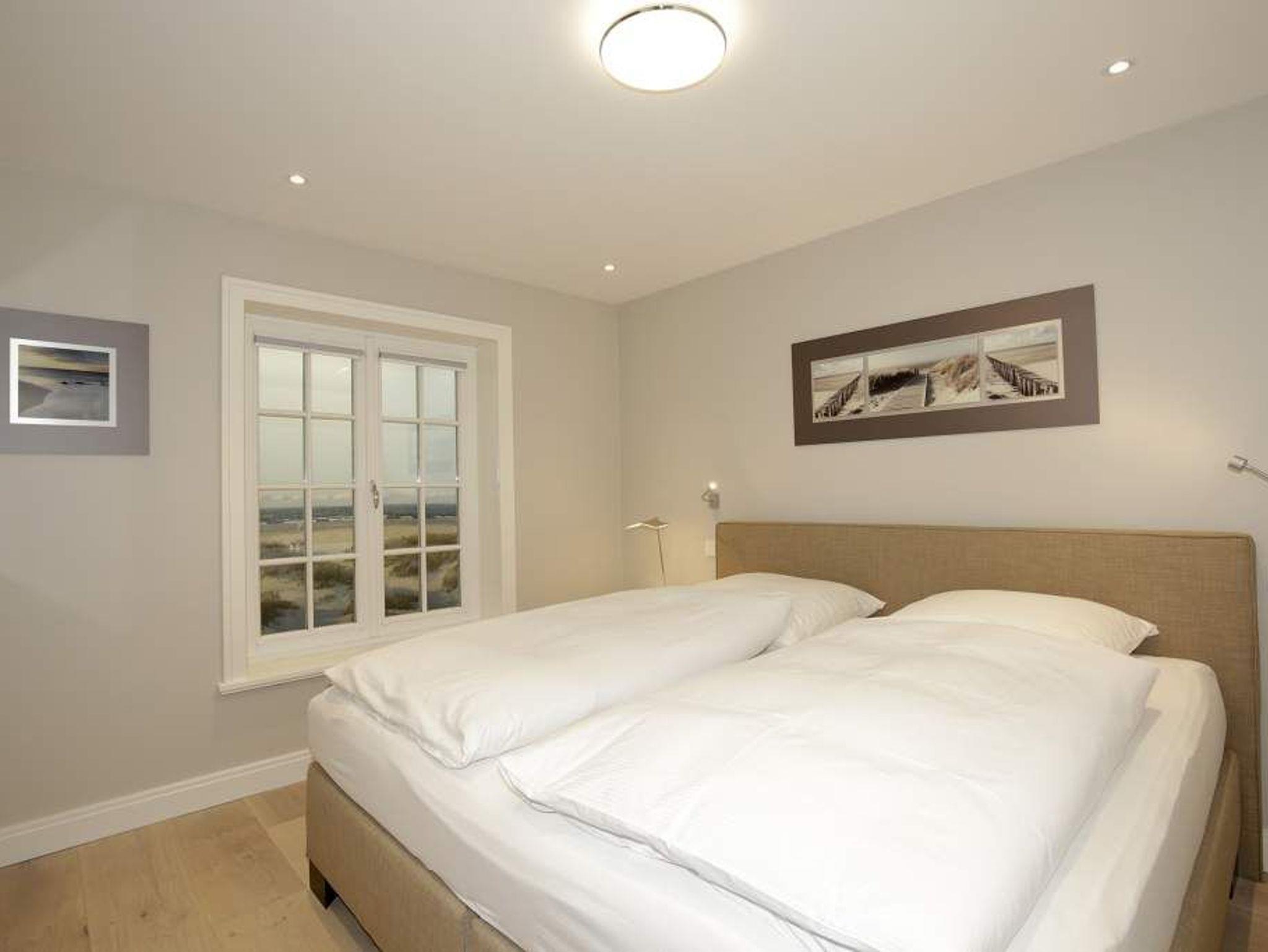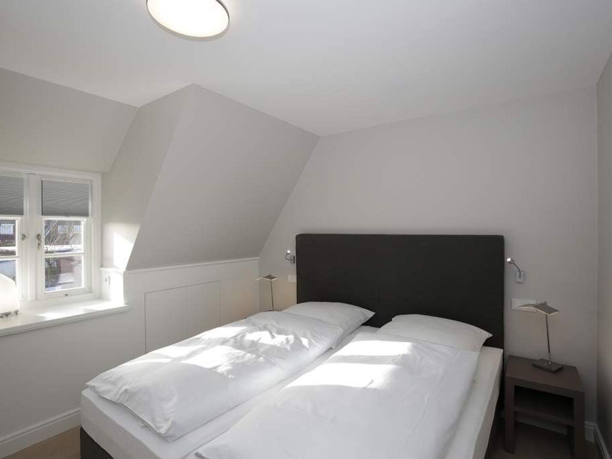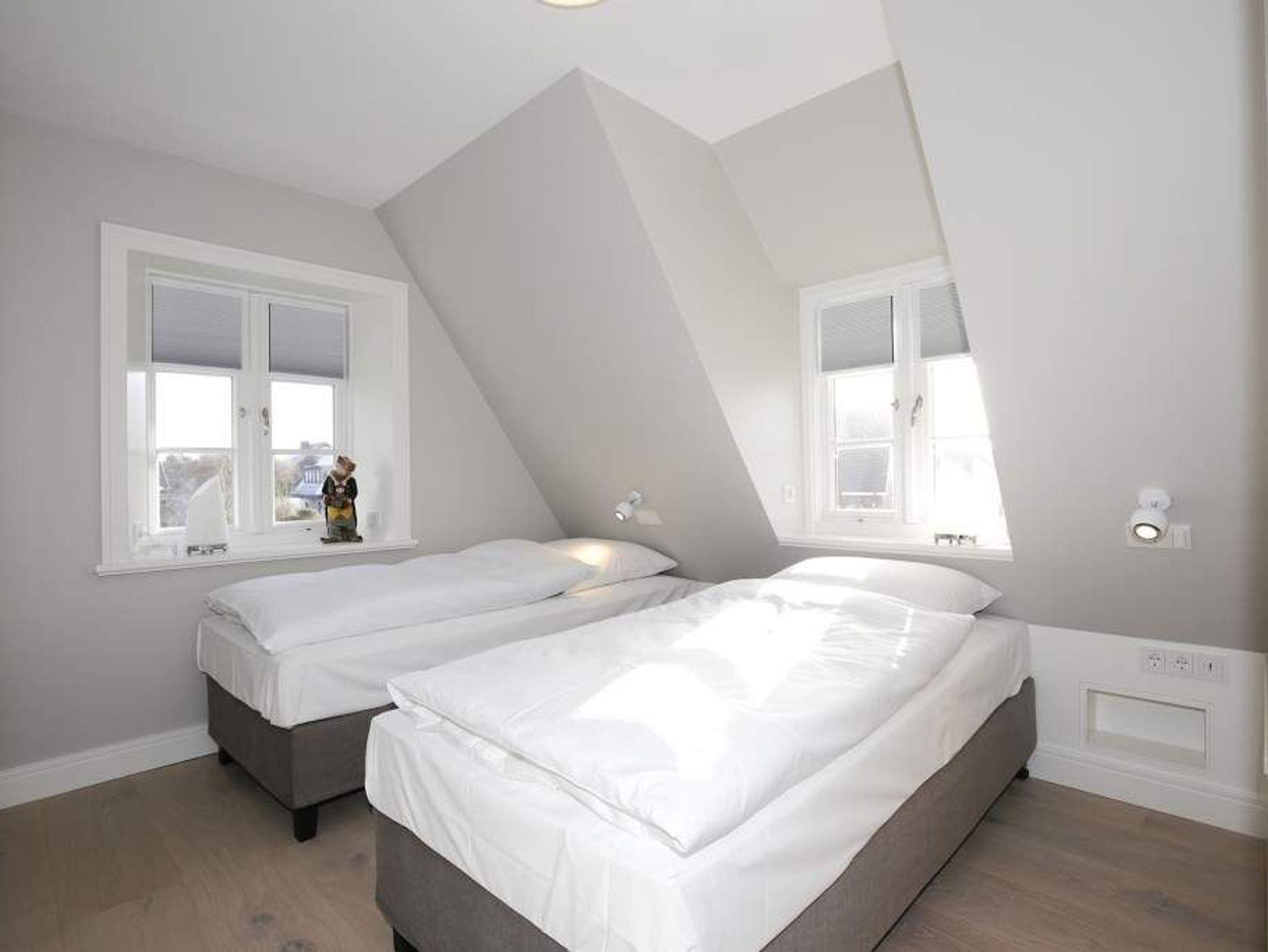 Im Obergeschoss gelangt man über den Flur mit Sekretär (mit Blick über Westerland bis hin zu den Dünen) in zwei weitere hochwertige Schlafzimmer mit Doppelbetten (1,80 x 2,00 m, Einzelmatratzen) und ein weiteres Badezimmer mit Dusche, Waschtisch, Handtuchtrockner, Fön und WC mit Geruchabsaugung.