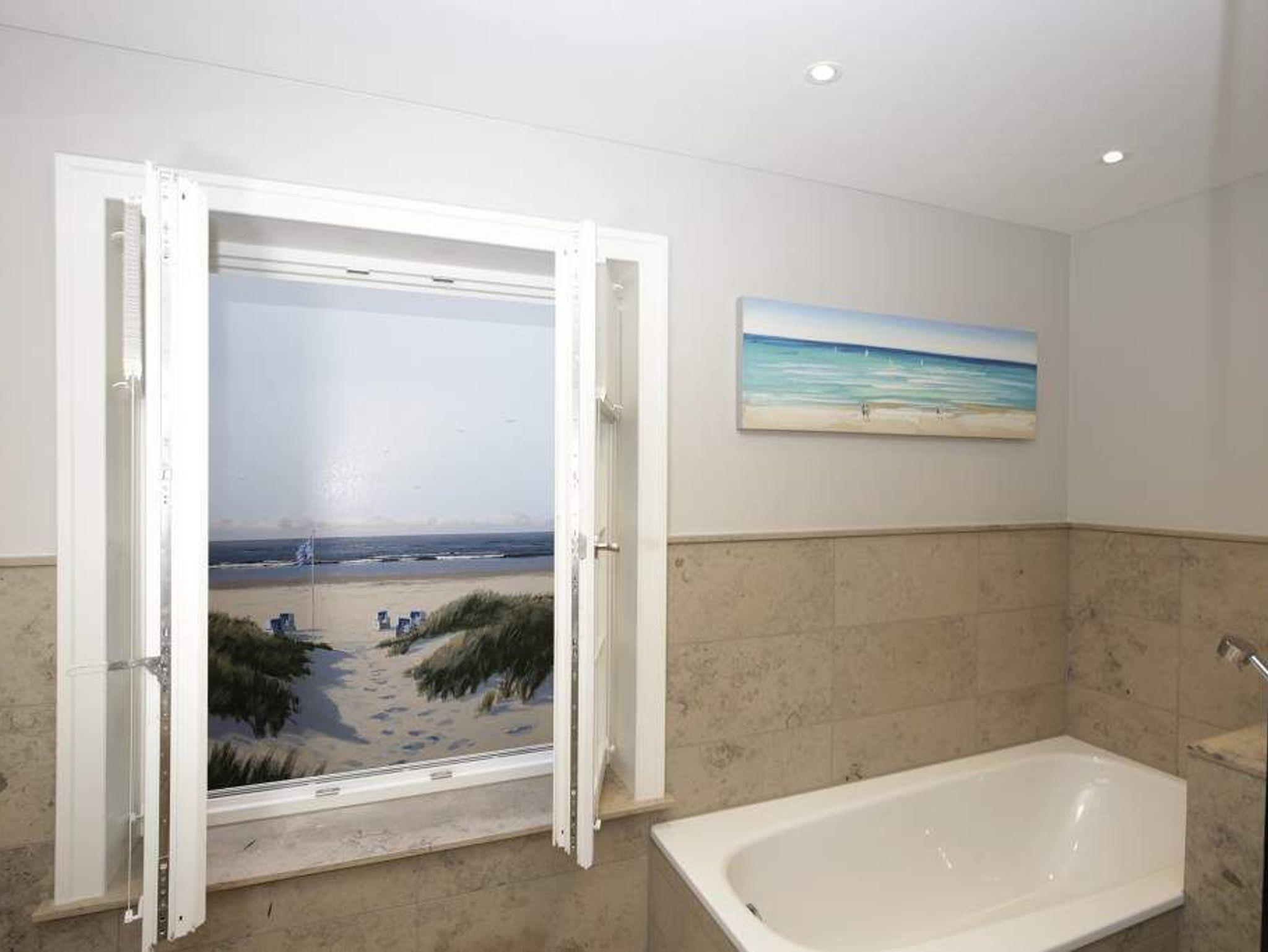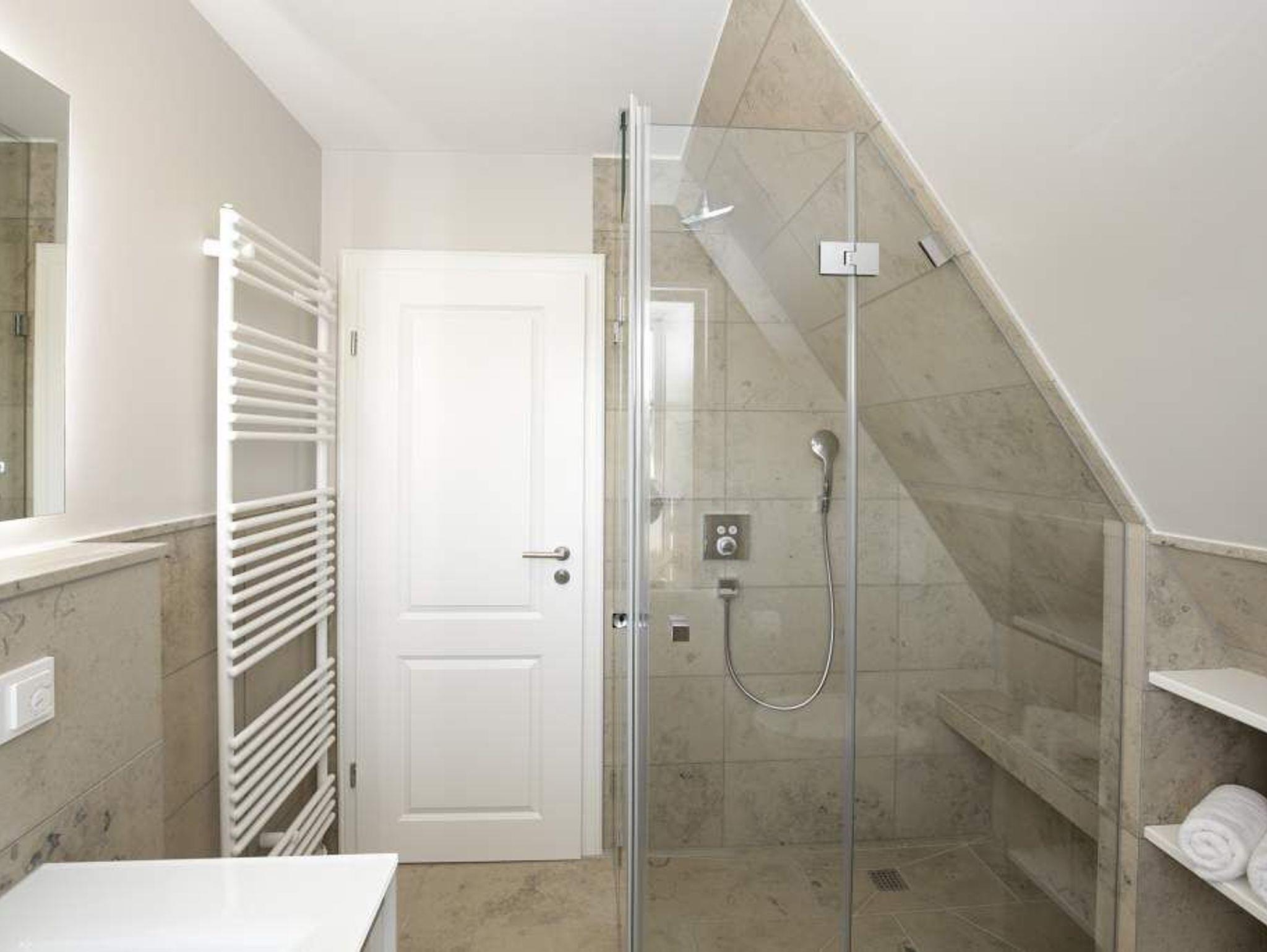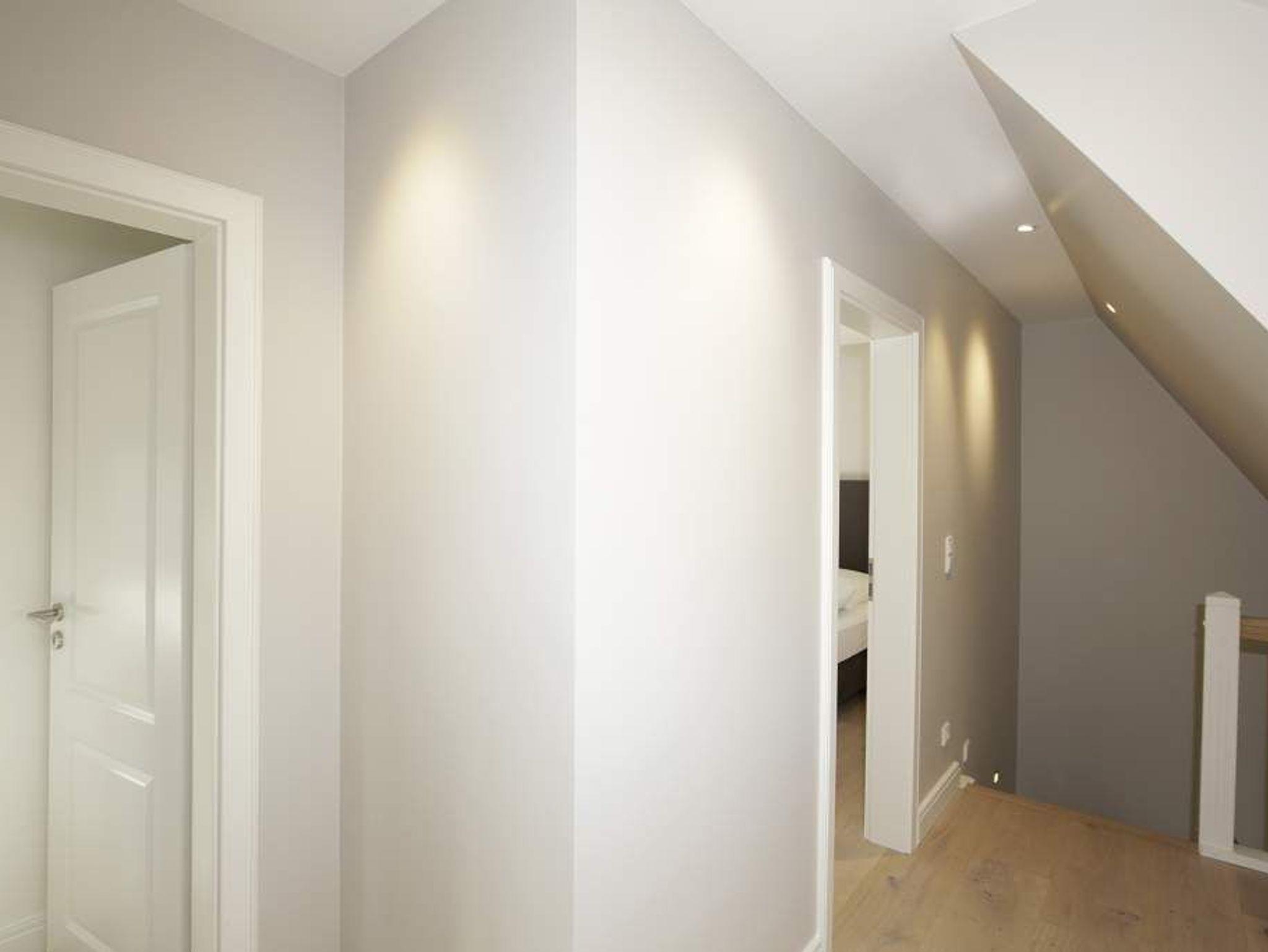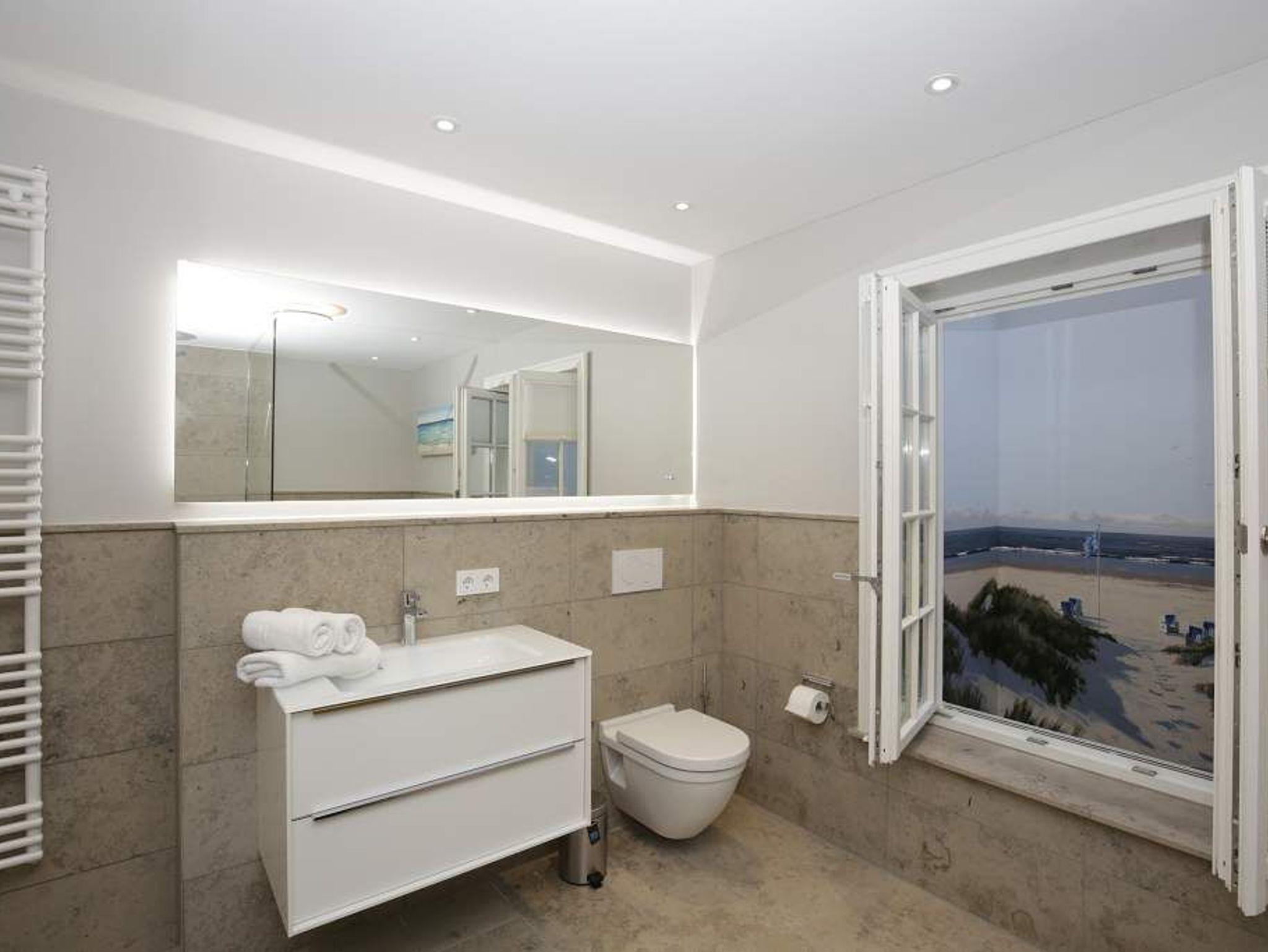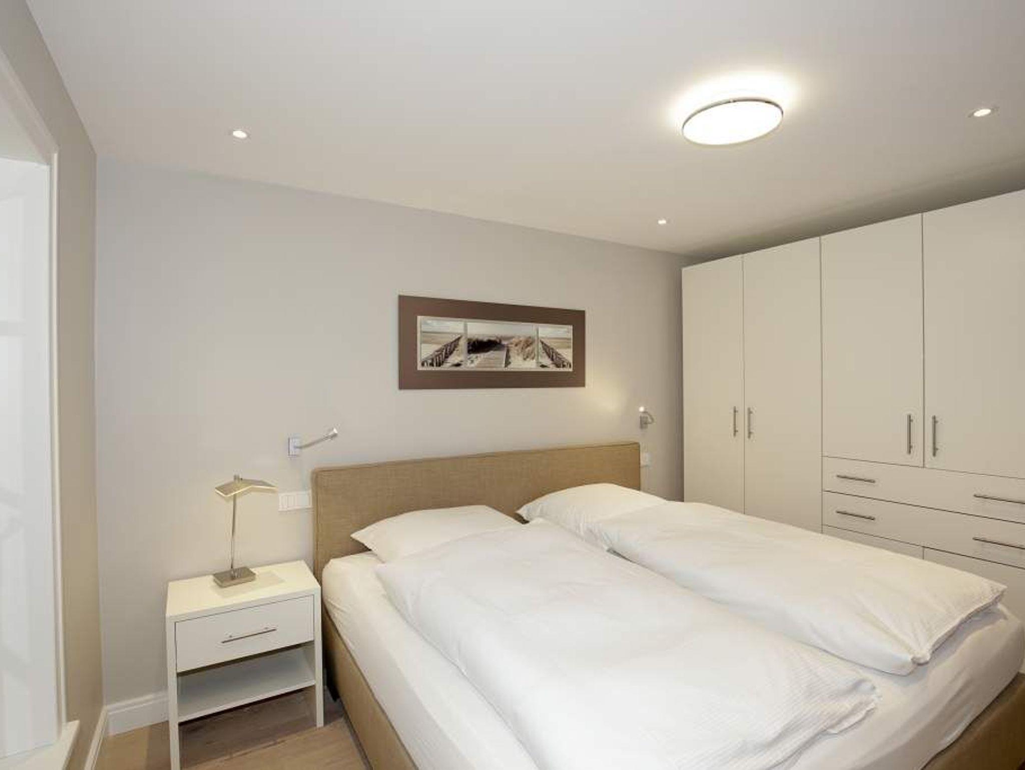 Im Obergeschoss gelangt man über den Flur mit Sekretär (mit Blick über Westerland bis hin zu den Dünen) in zwei weitere hochwertige Schlafzimmer mit Doppelbetten (1,80 x 2,00 m, Einzelmatratzen) und ein weiteres Badezimmer mit Dusche, Waschtisch, Handtuchtrockner, Fön und WC mit Geruchabsaugung.