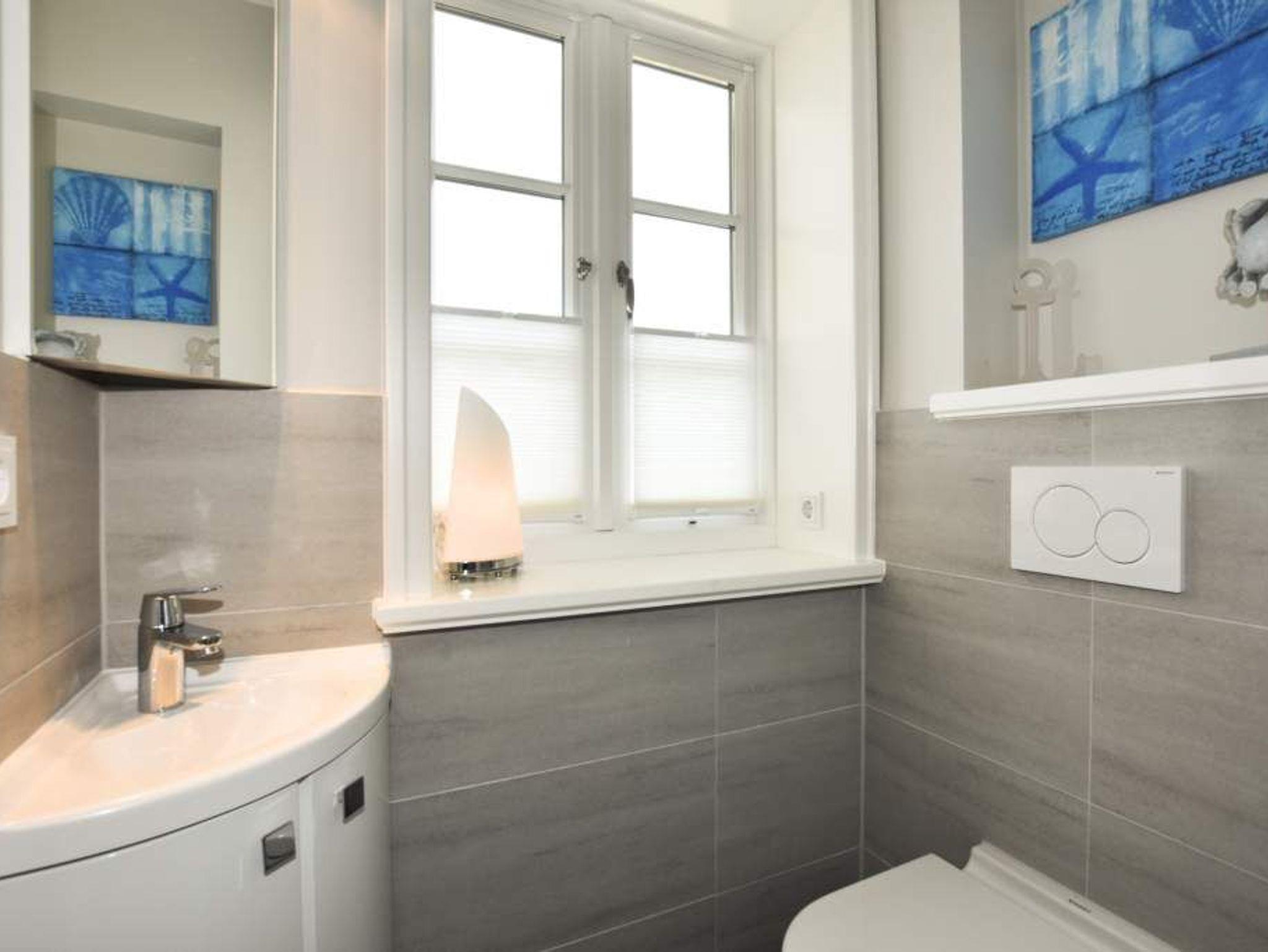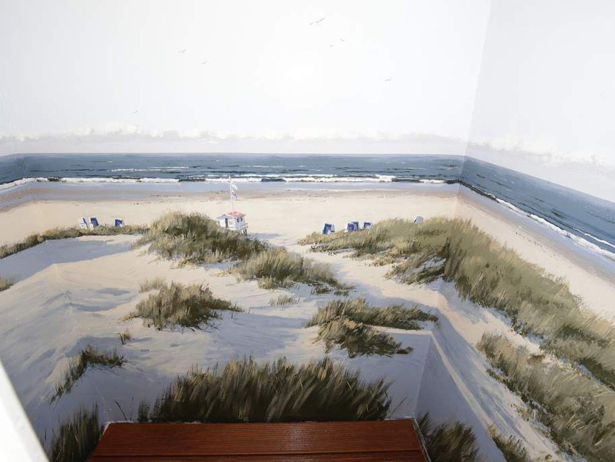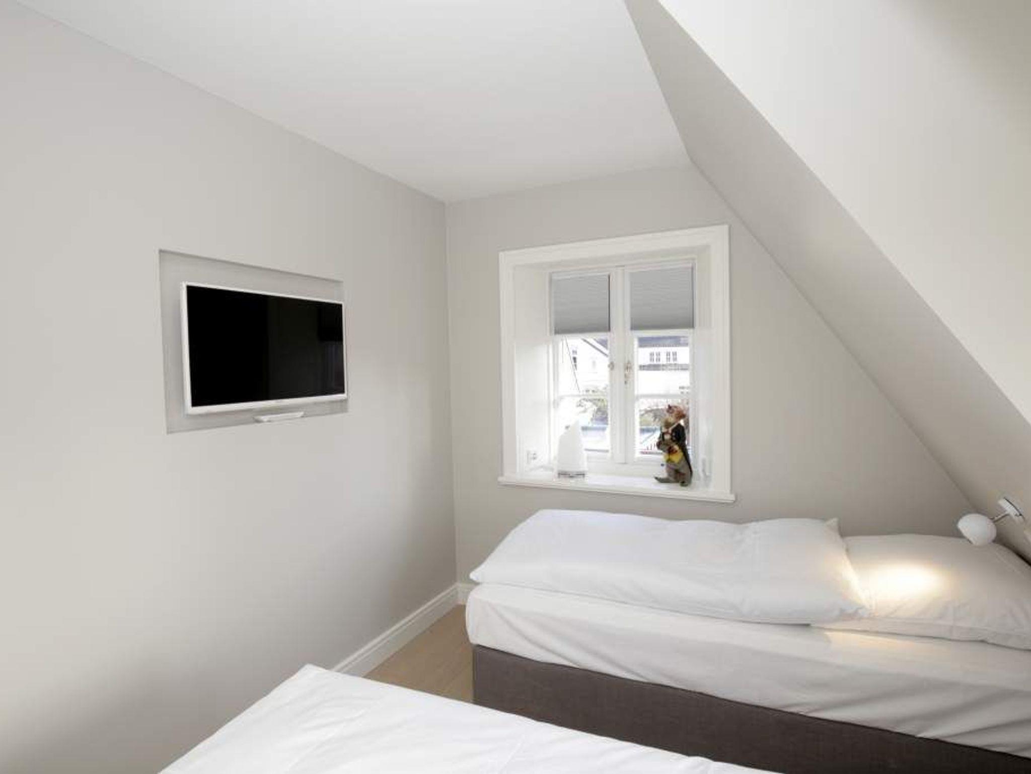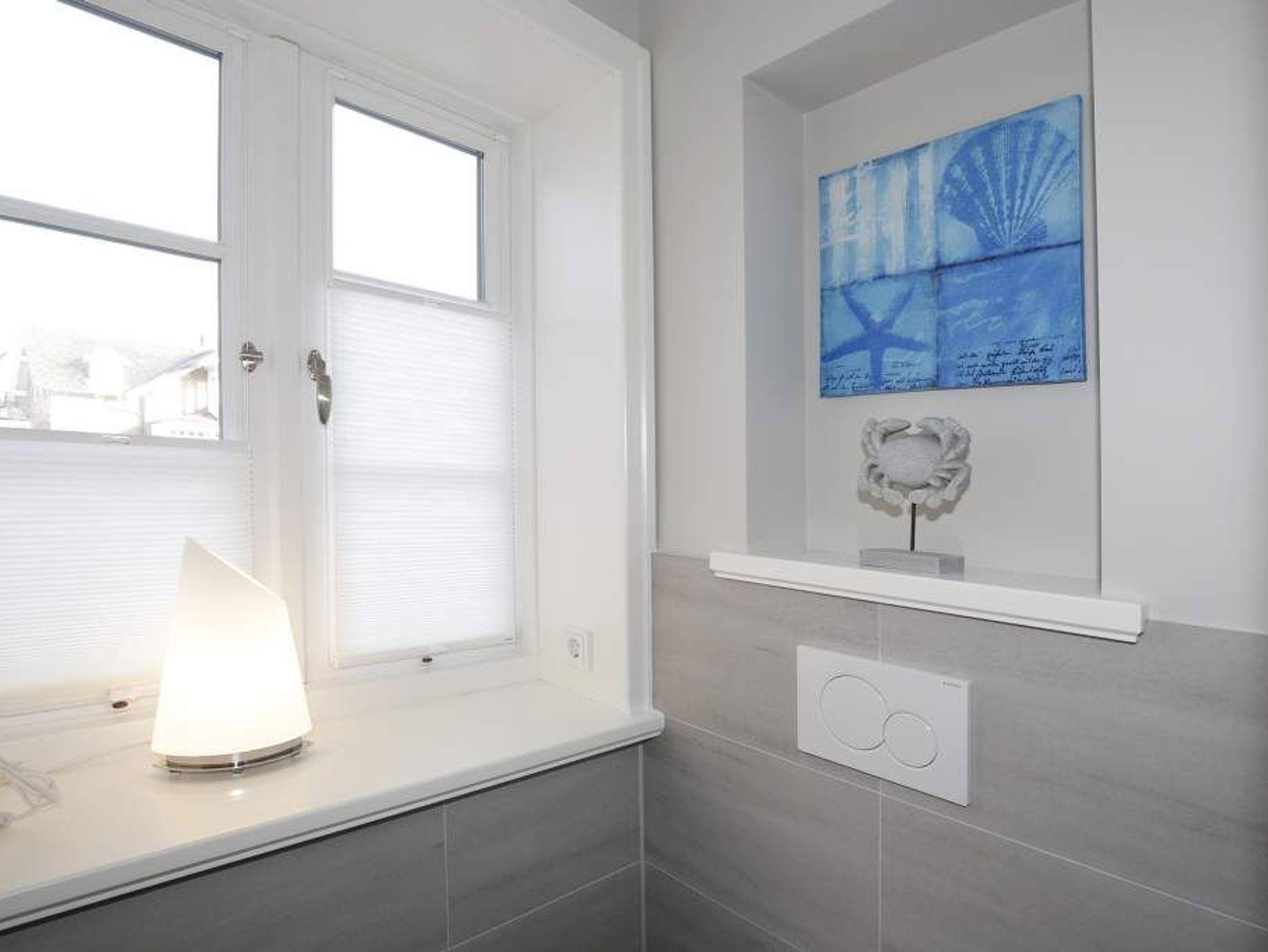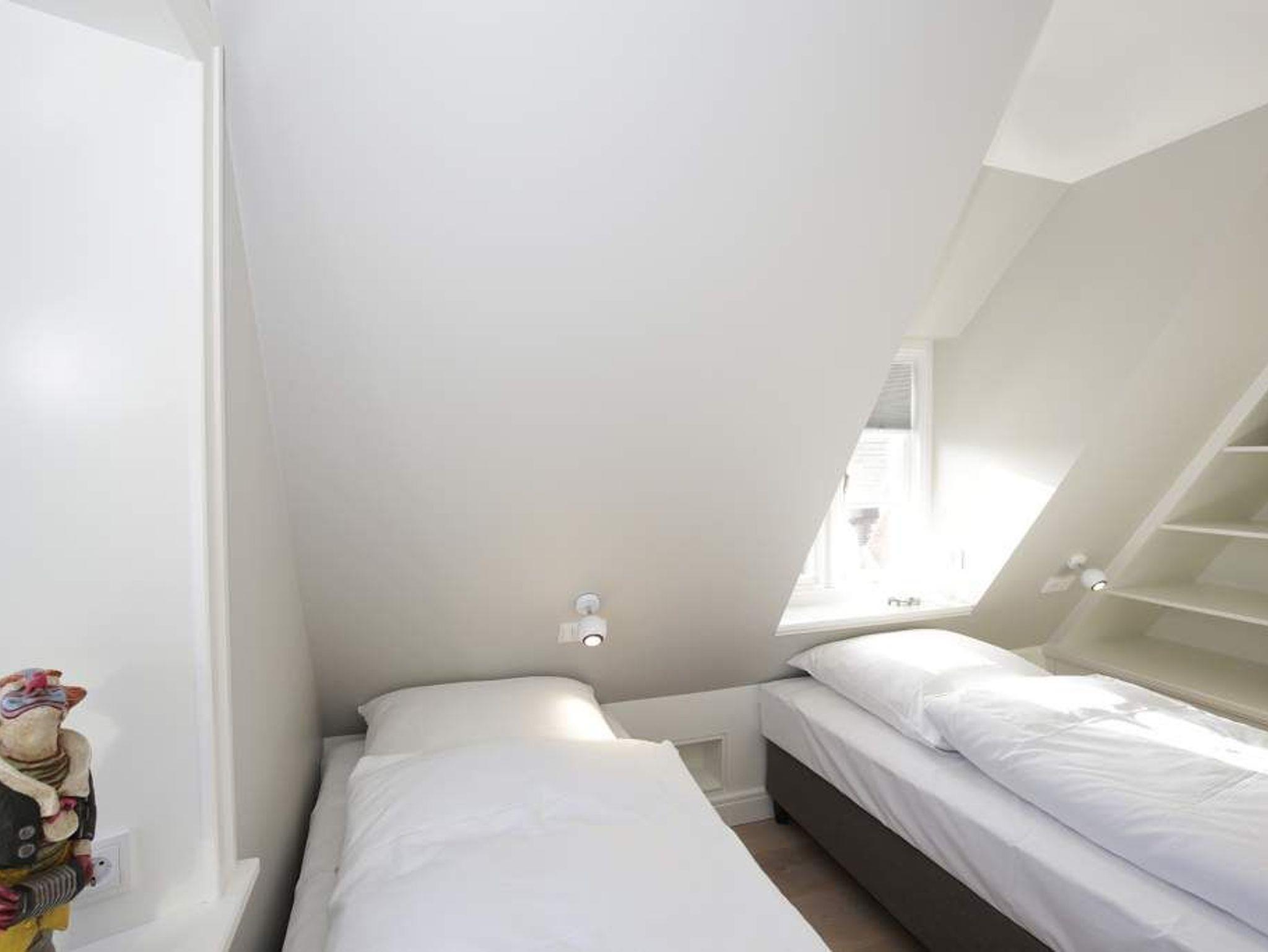 Im Obergeschoss gelangt man über den Flur mit Sekretär (mit Blick über Westerland bis hin zu den Dünen) in zwei weitere hochwertige Schlafzimmer mit Doppelbetten (1,80 x 2,00 m, Einzelmatratzen) und ein weiteres Badezimmer mit Dusche, Waschtisch, Handtuchtrockner, Fön und WC mit Geruchabsaugung.