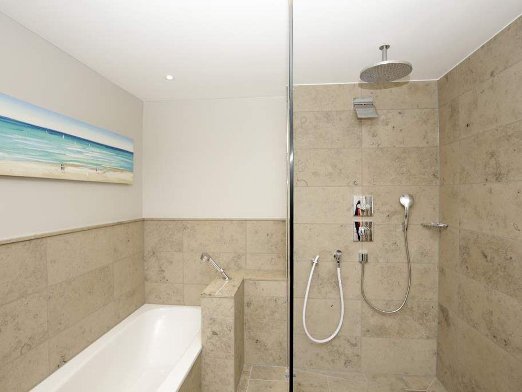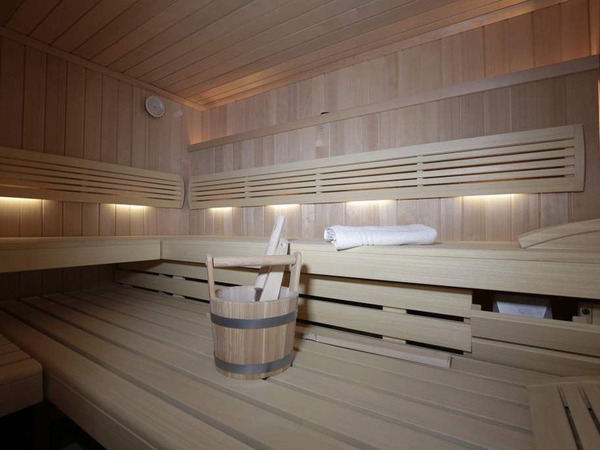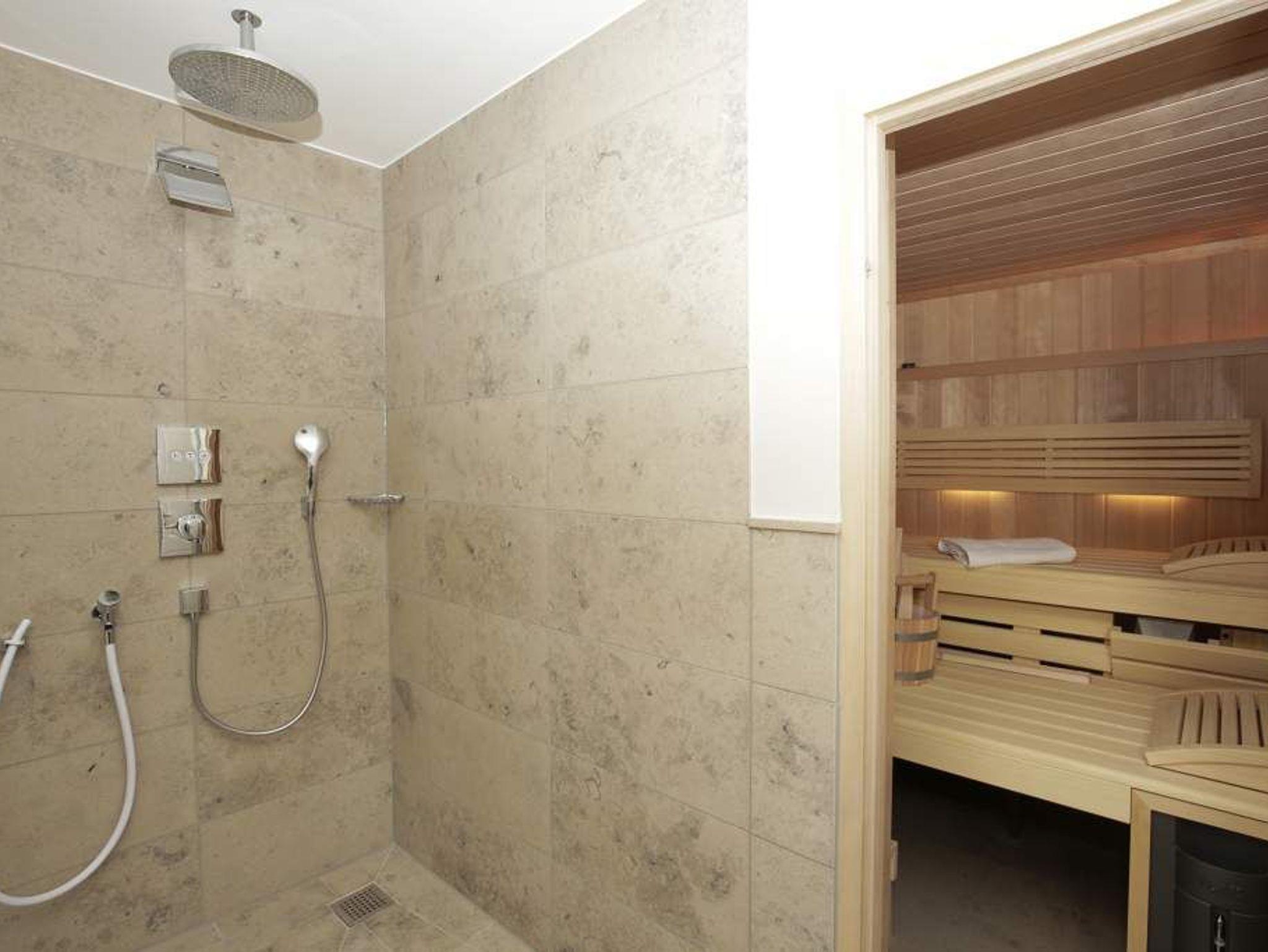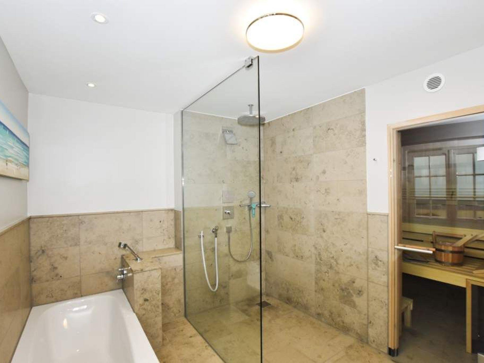 Im Untergeschoss befinden sich ein komfortables Schlafzimmer mit Doppelbett in Übergröße (2,00 x 2,00 m, Einzelmatratzen) und ein großzügiges Badezimmer mit Dusche, Badewanne, Sauna, Waschtisch, Handtuchtrockner, Fön und WC mit Geruchabsaugung