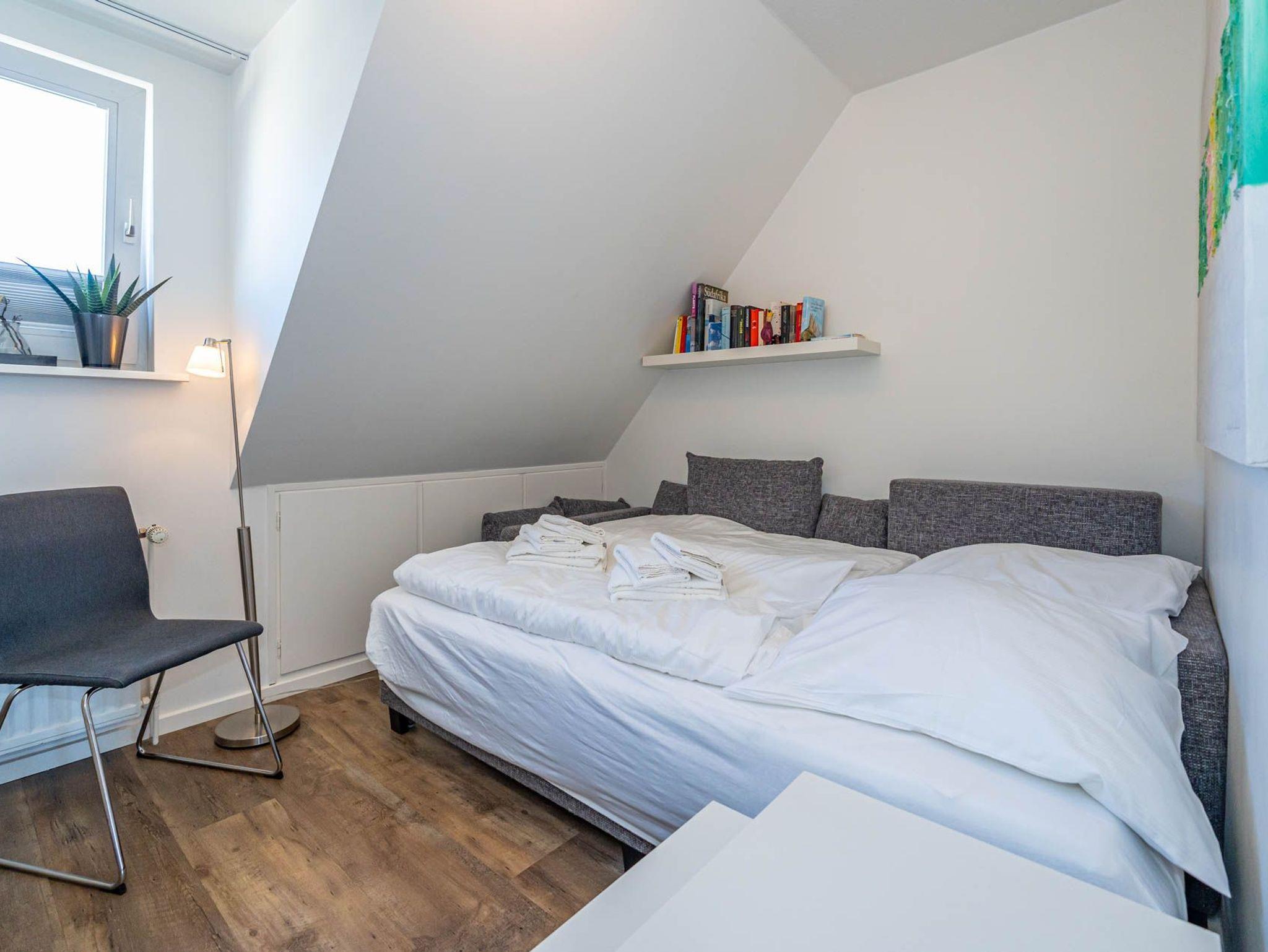 Vom Vorflur mit Garderobe gelangt man in das kleine Schlafzimmer mit Doppelschlafcouch (1,50 x 2,00 m) und verfügt über ein Flachbild-TV. Von dem Flur gelangt man in das Wohnzimmer (mit Austritt zum Balkon), und in das Duschbad/WC.