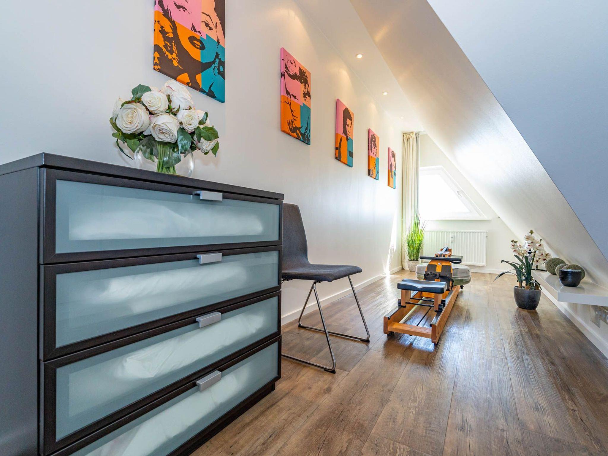 Das Schlafzimmer ist mit einem Doppelbett (1,60X2,00m) 2 Matratzen und einem Rudergerät der Firma Waterrower eingerichtet.