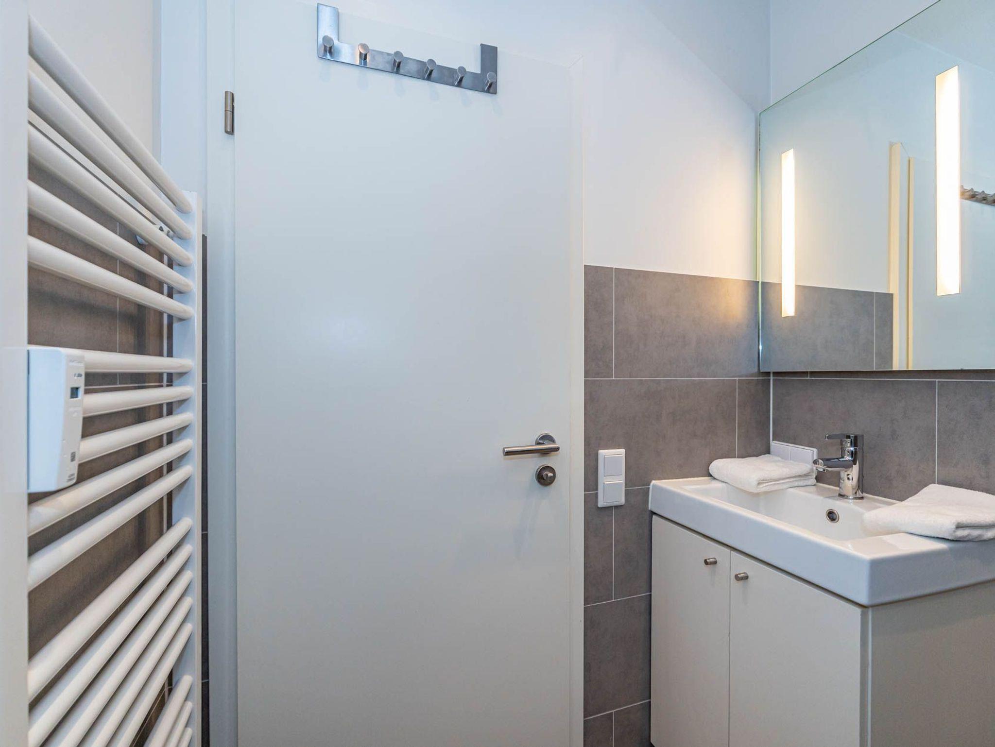 Im Bad befinden sich eine Dusche, ein WC, ein Waschtisch und ein Handtuchtrockner.