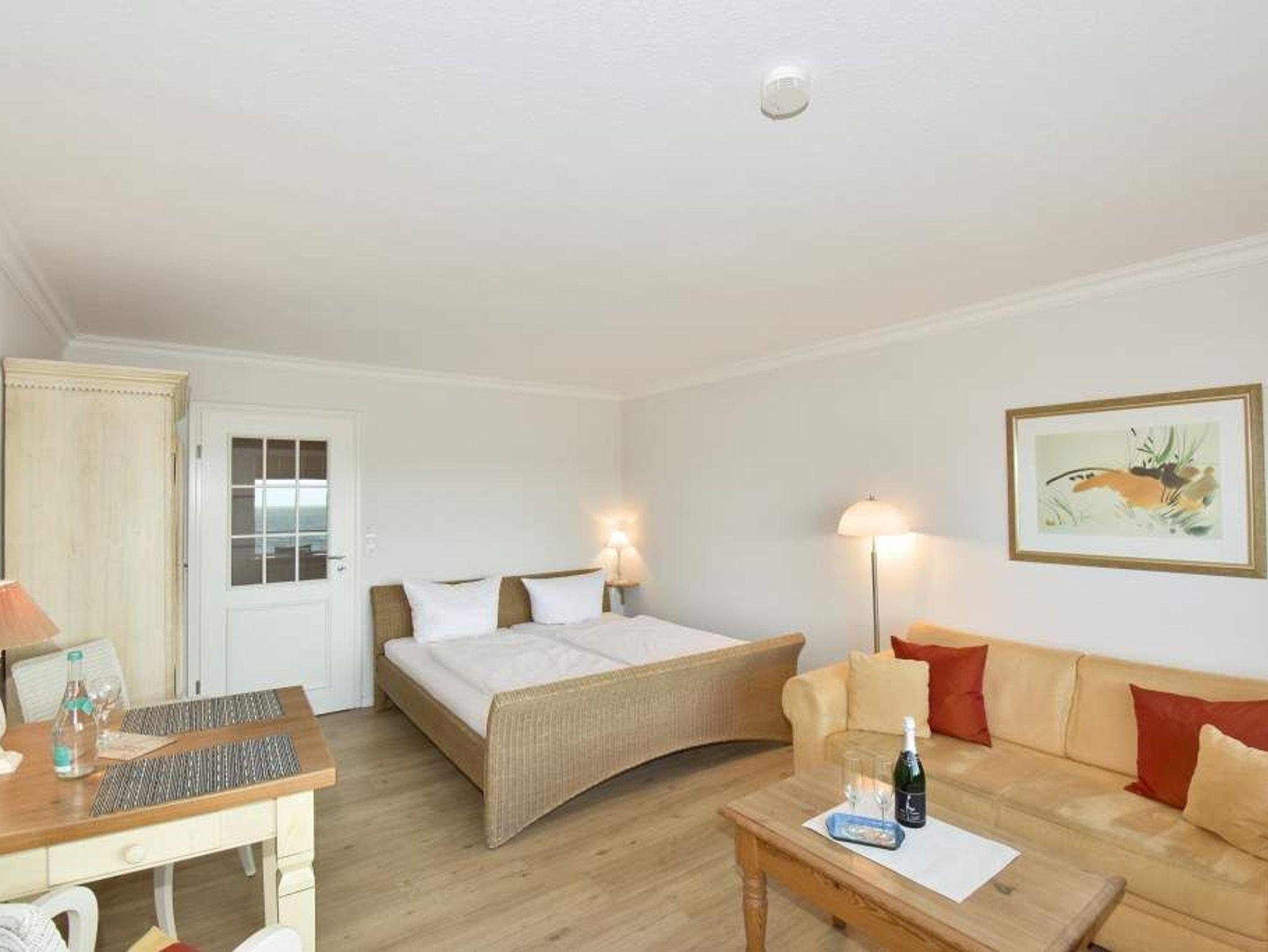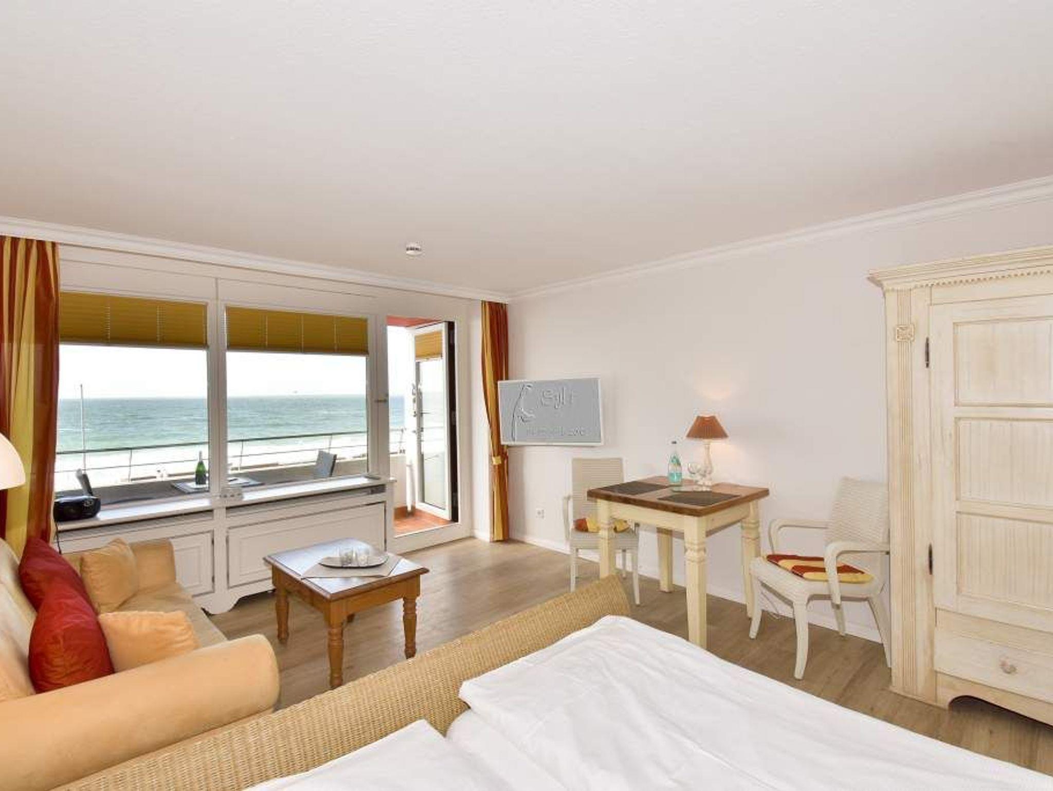 Hochwertig ausgestattete 1-Zimmer-Nichtraucher-Ferienwohnung (ca. 34 qm) in der 1. Etage zur Seeseite mit Westloggia und Meerblick (Nachmittagssonne, mit Balkonmöbeln und Auflagen) ideal für 2 Personen.