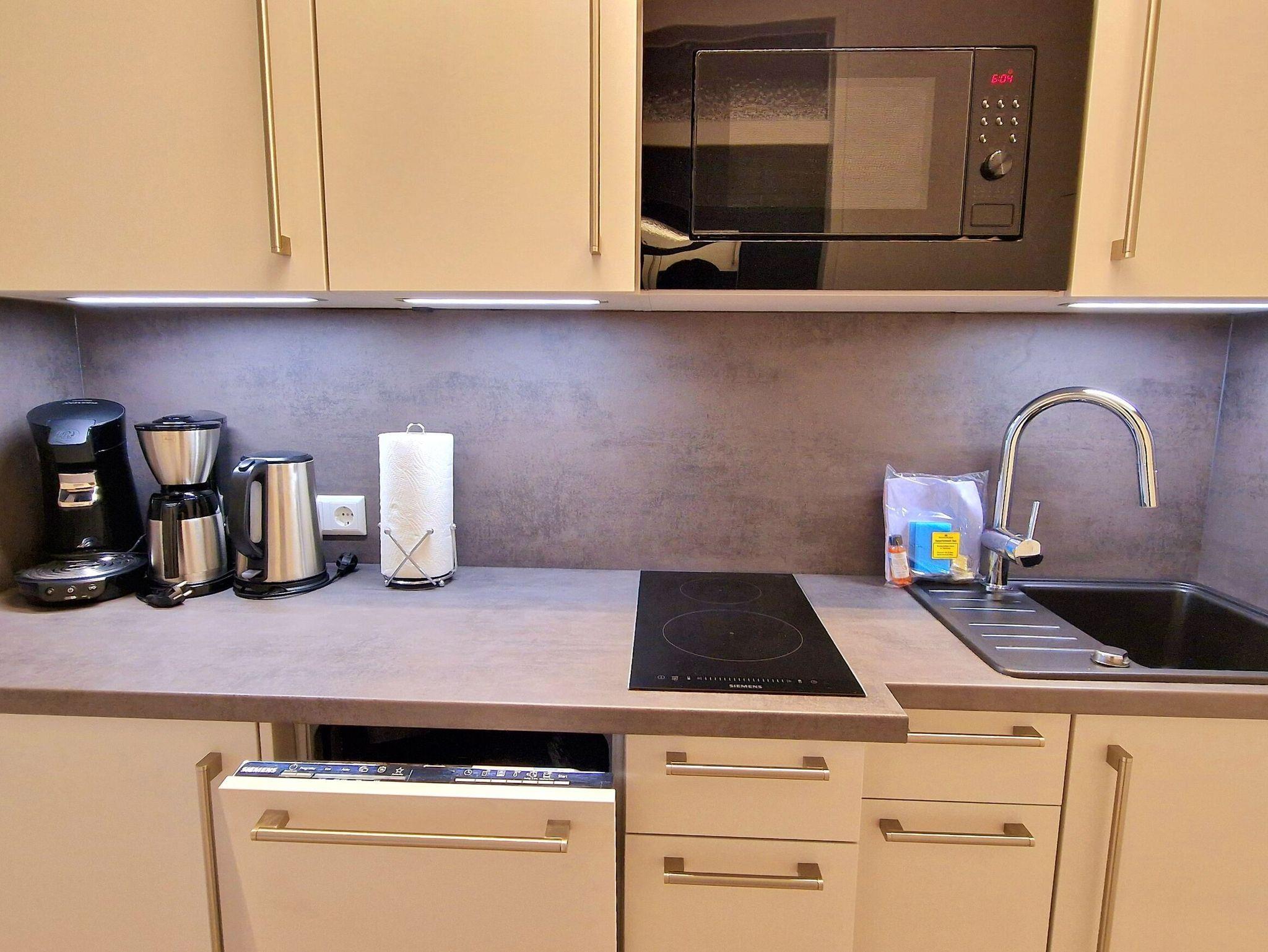 1-Zimmer-Apartment mit freiem Seeblick im 11. OG des Haus Metropol, ca. 25 m². Kombinierter Wohn- und Schlafraum mit festem Doppelbett (140x200 cm), 2er-Sofa mit elektronischer Liegefunktion, Esstisch mit gemütlichen Stühlen, Smart-TV, Festnetzanschluss, seperatem WLAN und möblierten Westbalkon. Hübsche Küchenzeile mit Geschirrspüler, Mikrowelle, 2er-Cerankochfeld und extra Senseo Kaffeemaschine. Duschbad mit WC. Tierhaltung und Rauchen ist in der Wohnung ist nicht gestattet.