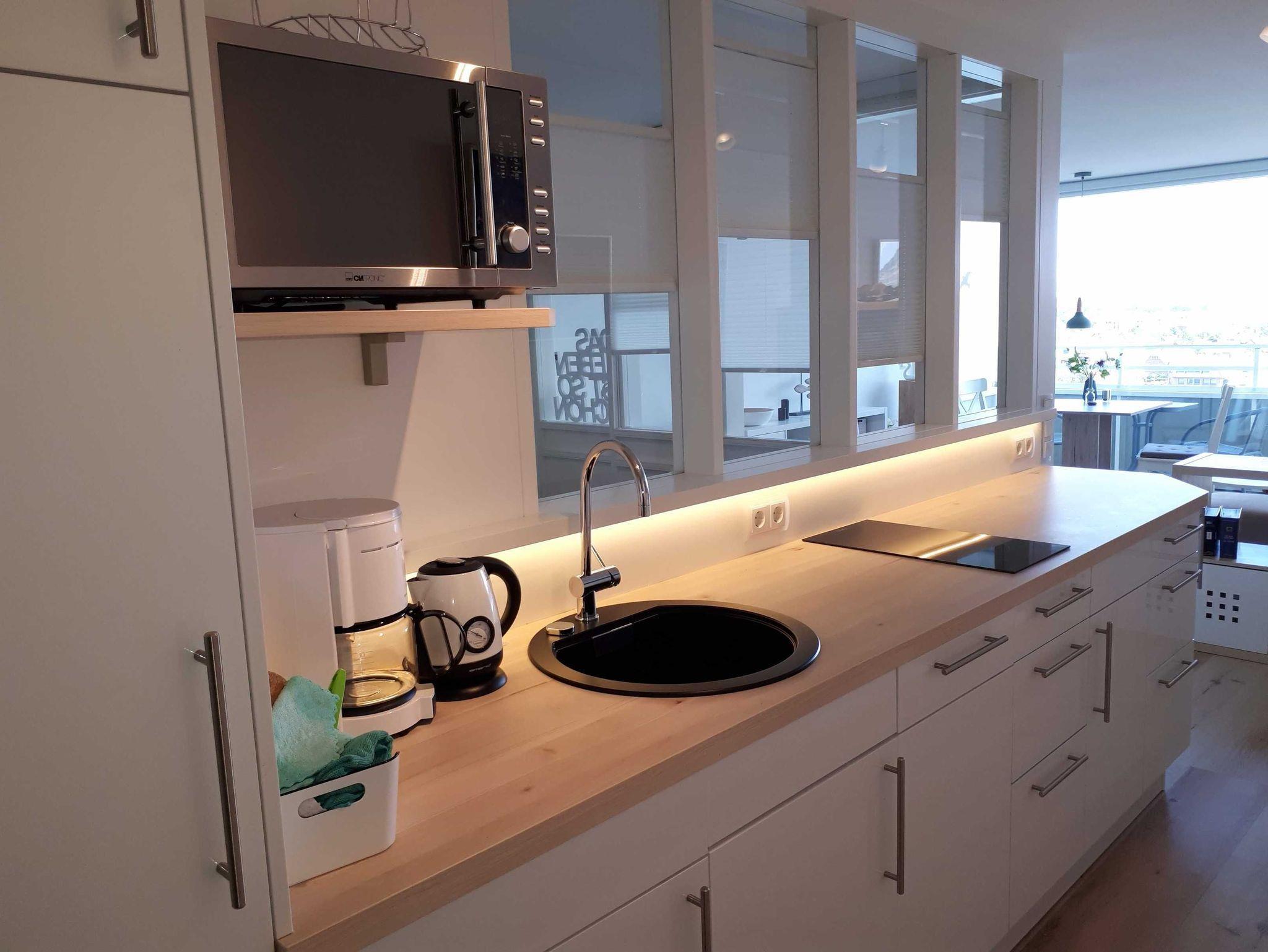 Dieses helle und freundliche neue Appartment überrascht Sie mit einem einmaligen Blick über die Insel Sylt. Hoch oben im höchsten Stockwerk (8.Stock!) vom Balkon im Hanseatenhaus blicken Sie über die Dächer von Westerland bis zum Meer. Aufgrund der Höhe ein ruhiges Appartment und dennoch mitten im Zentrum zwischen Strand und Bahnhof gelegen. Hell und modern eingerichtet mit einem Schlafraum mit Doppelbett sowie einer hochwertigen Schlafcoach bietet die 1,5-Zimmerwohnung Schlafmöglichkeit für 1- 3 Personen. In der von Grund auf frisch renovierten Ferienwohnung mit Liebe zum Detail fühlen Sie sich bei uns zu Hause. Die neue Küchenzeile ausgestattet mit einer Mikrowelle/Backofen, 2-Platten Carankochfeld, Toaster, Kaffeemaschine, Wasserkocher und Geschirr für den täglichen Bedarf. Und natürlich das separate, moderne Bad mit einer großen Dusche mit Rainshower, WC, Waschtisch, Handtuchwärmer und Haartrockner.