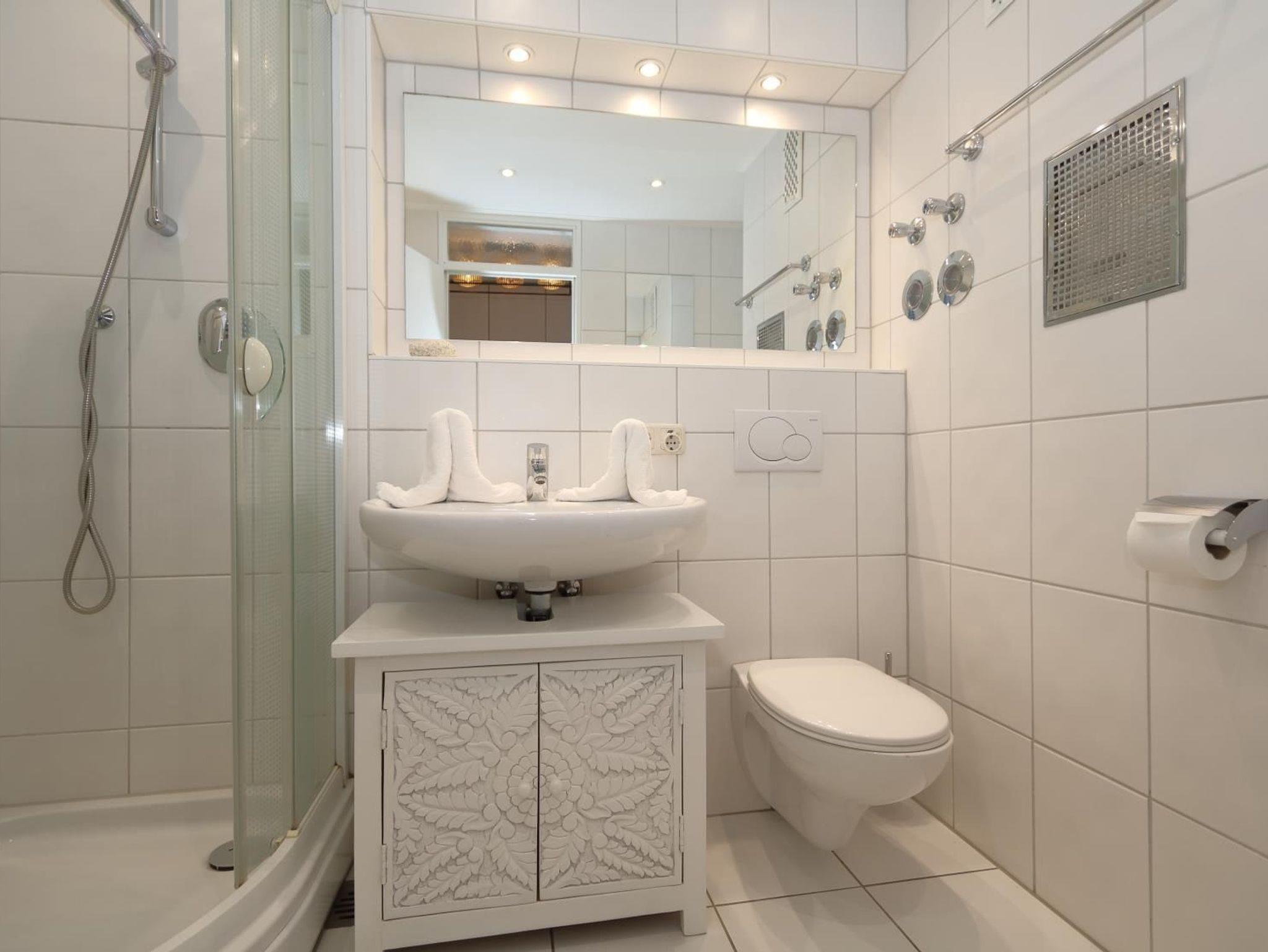 WC, Dusche, Waschbecken, Spiegel und ausreichend Handtücher und Vorleger.