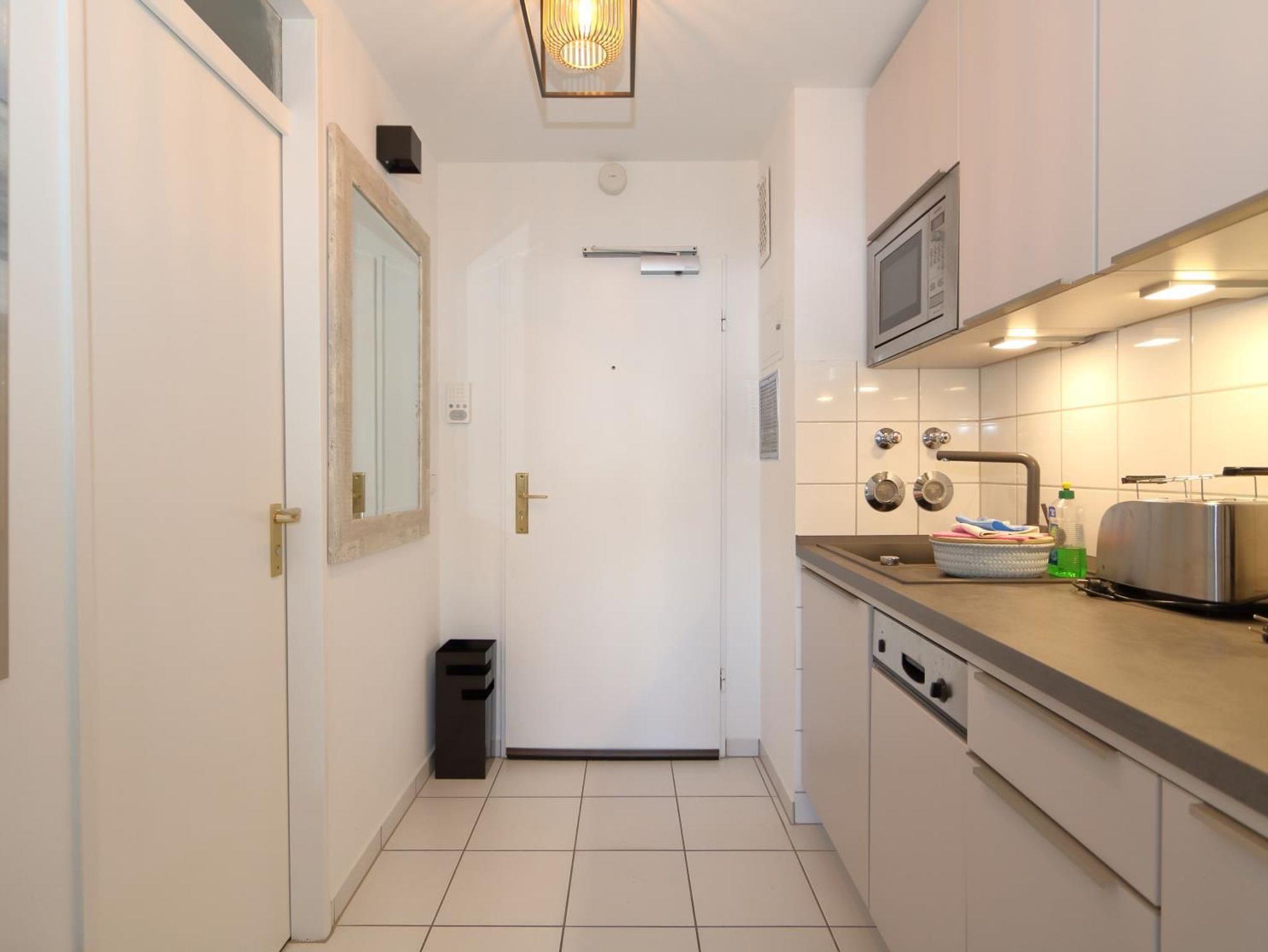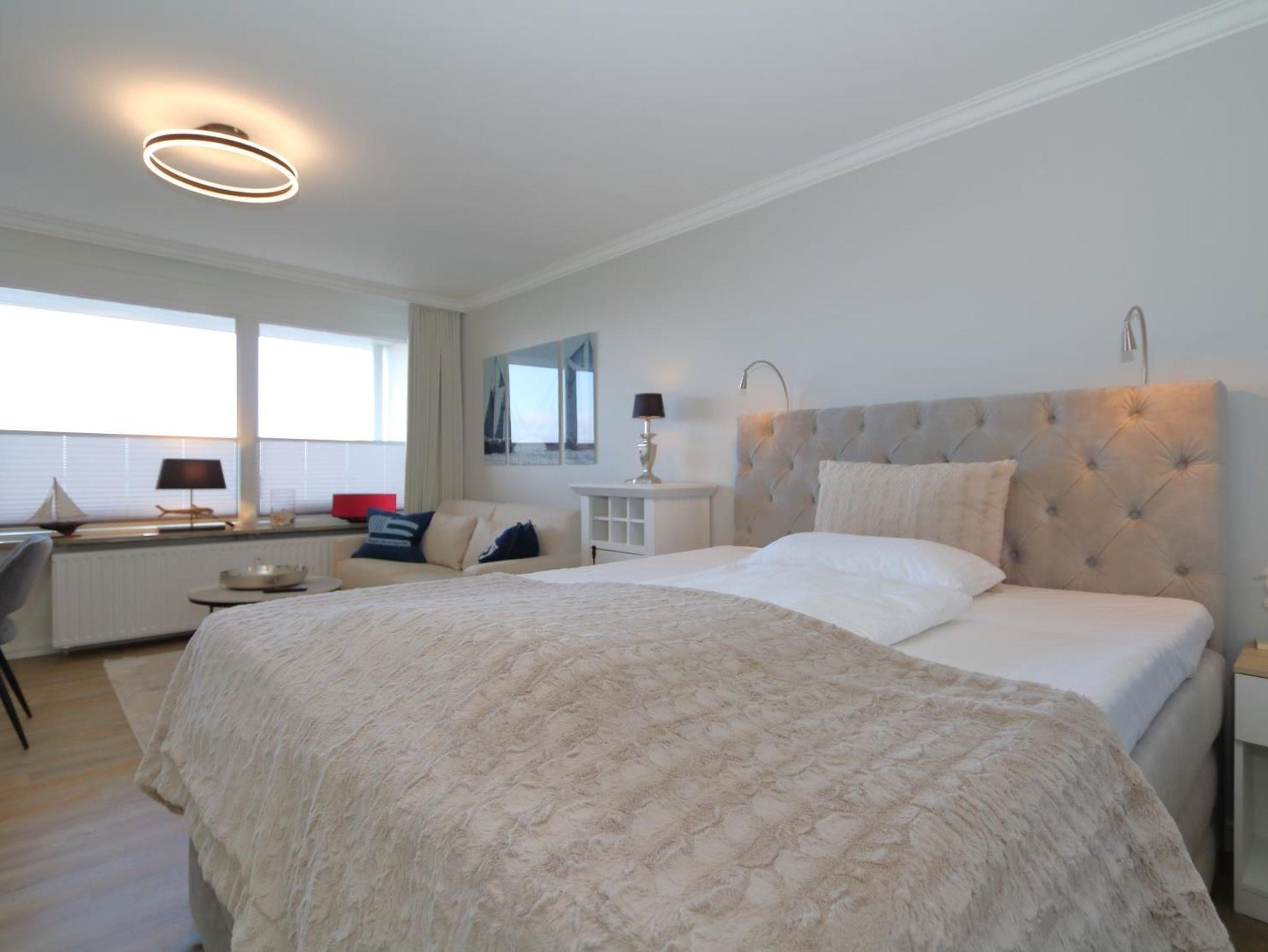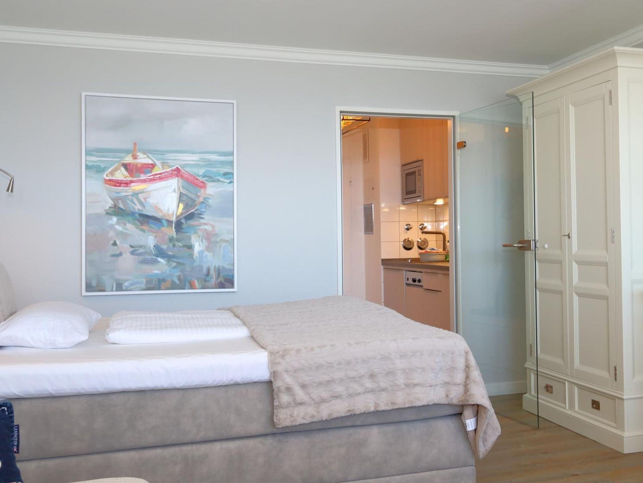 Das Appartement ist großzügig ausgestattet mit u.a. einem festen Boxspringbett, und Westbalkon, moderner Küchenzeile im Flur und ein Badezimmer mit Dusche.