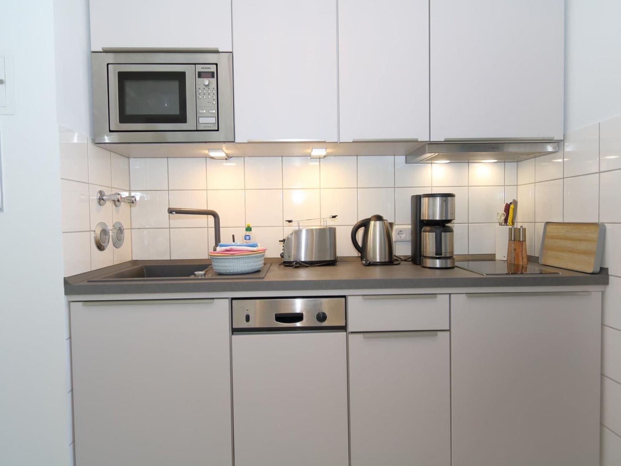 Spülmaschine, gängige Küchenutensilien, Herd , Dunstabzugshaube, Wasserkocher, Microwelle, Filterkaffeemaschine, Toaster, Kühlschrank usw