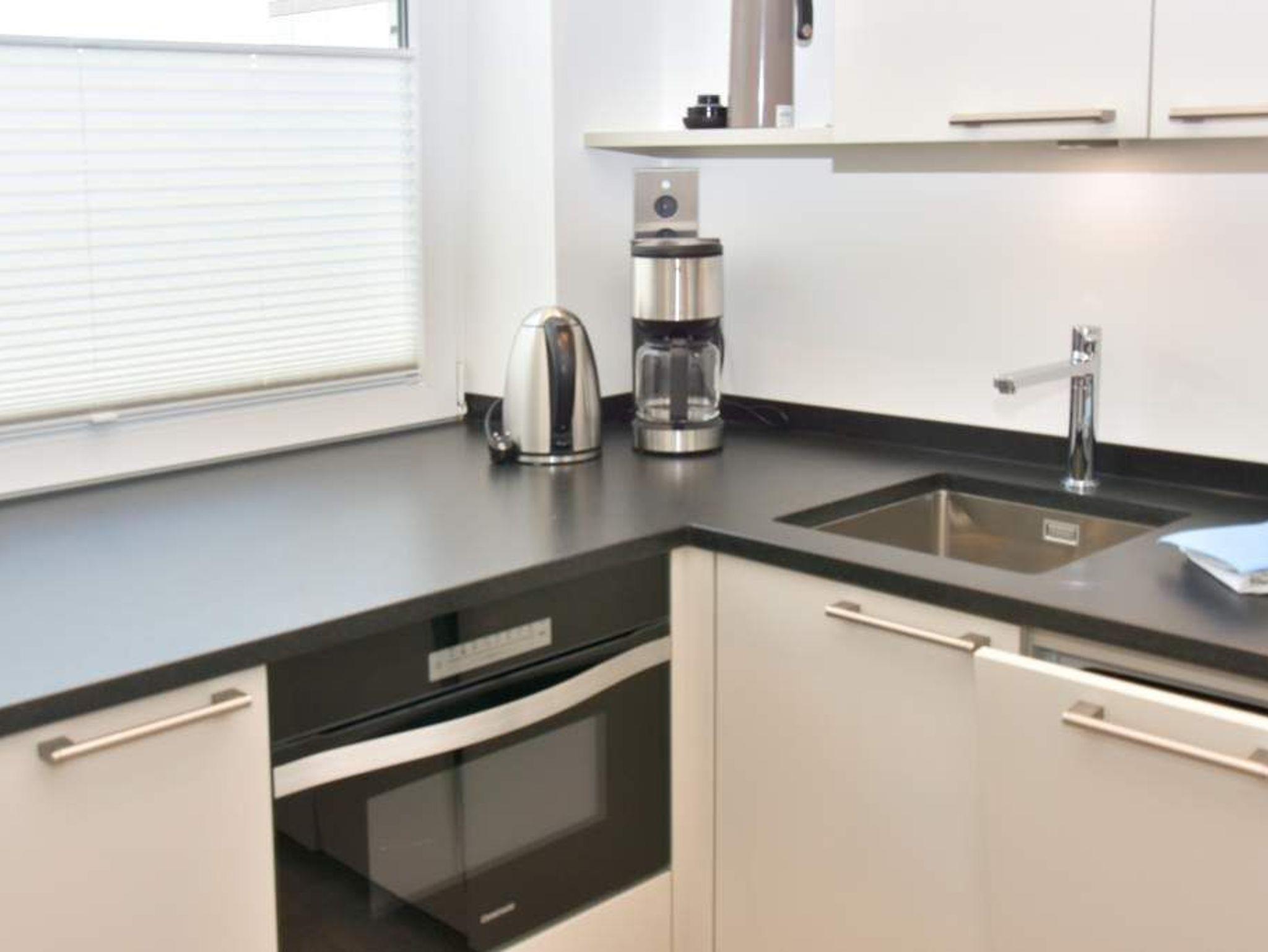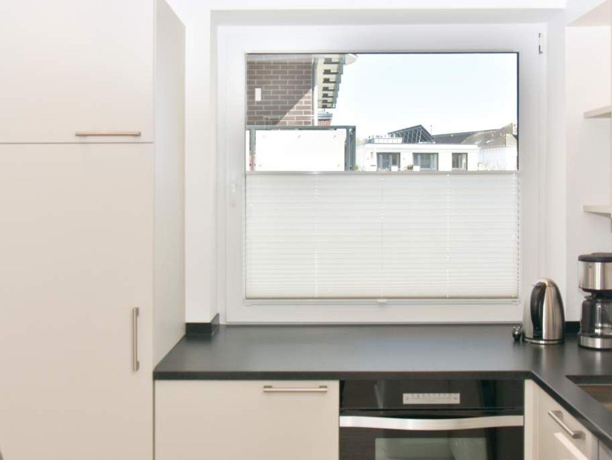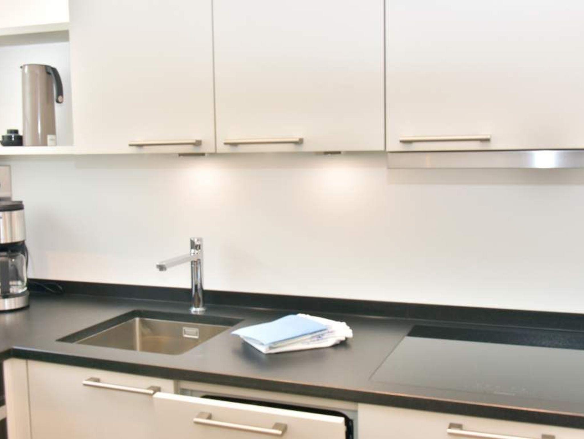 Die separate Küche hat einen Herd mit Backofen, 4-Platten-Ceranfeld, einen Kühlschrank, eine Waschmaschine und ein Fenster. Filter-Kaffeemaschine und Nespresso-Maschine, Wasserkocher und Toaster gehören zur Grundausstattung.
