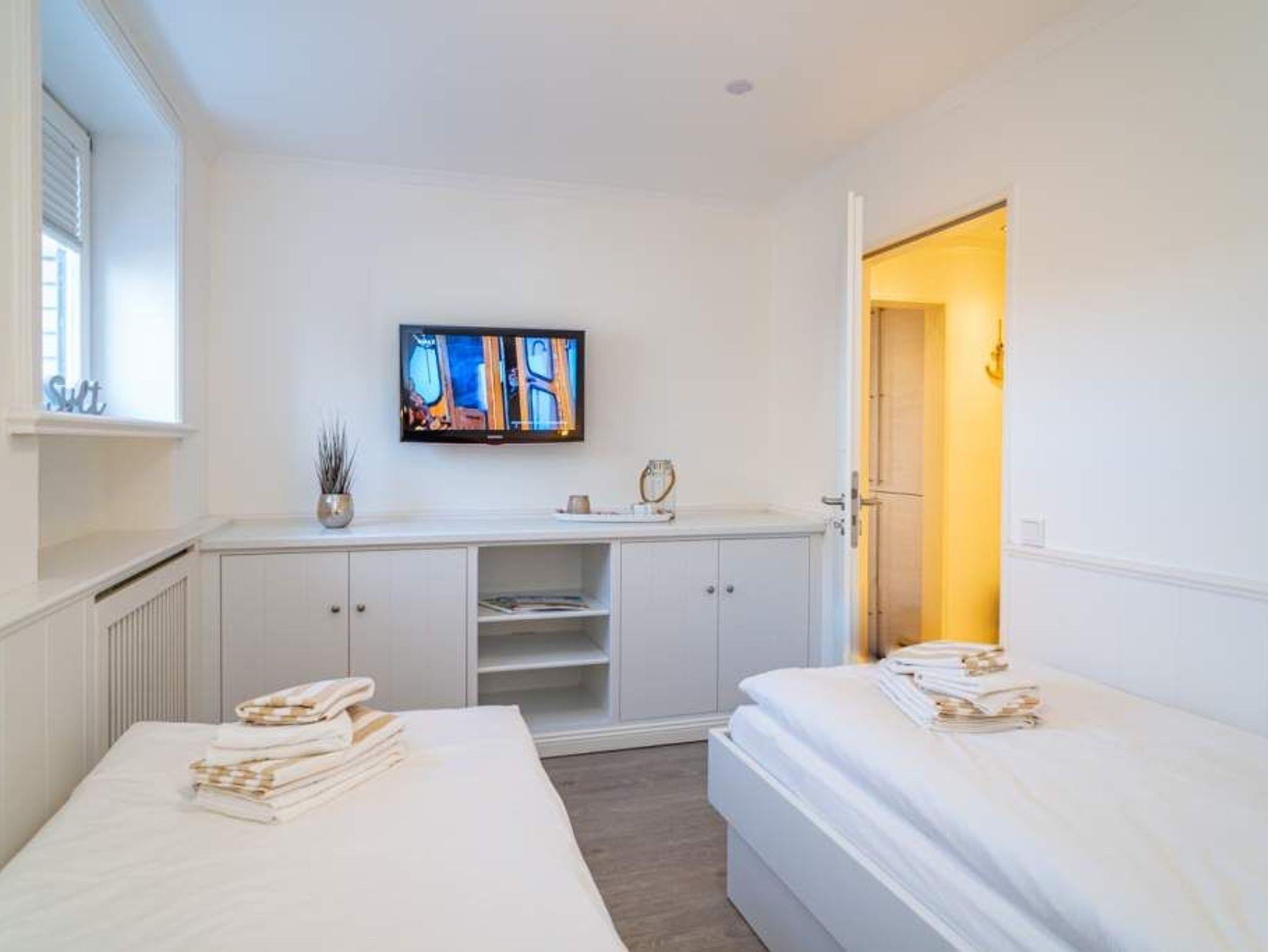 Das Schlafzimmer ist mit zwei auseinander stehenden Einzelbetten und einem Flachbild-TV ausgestattet.
