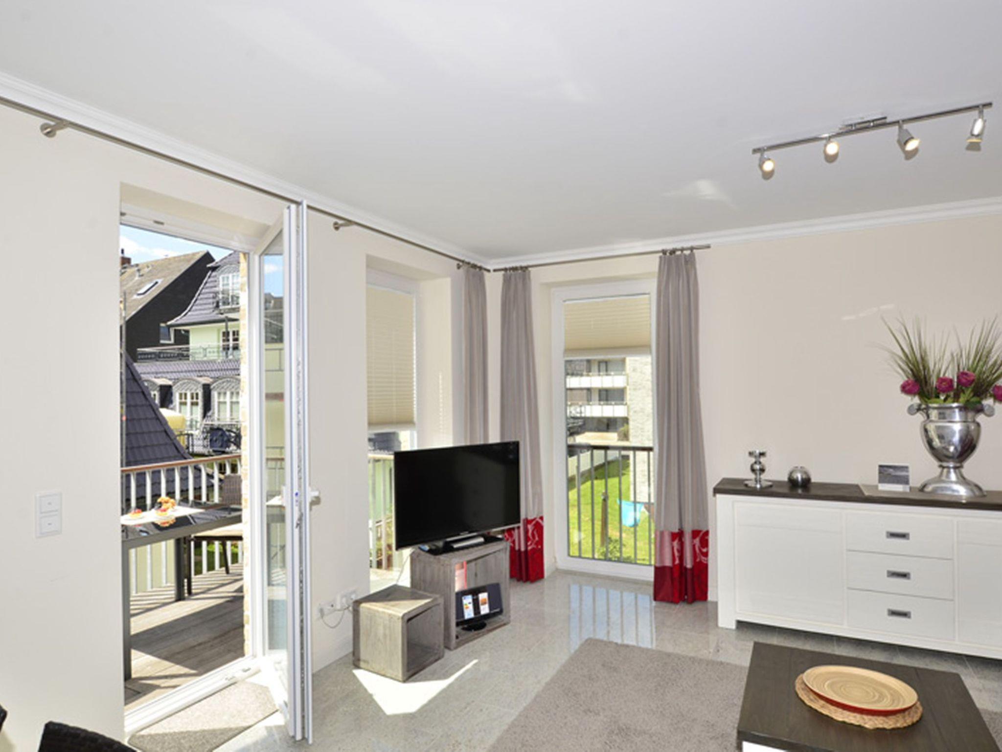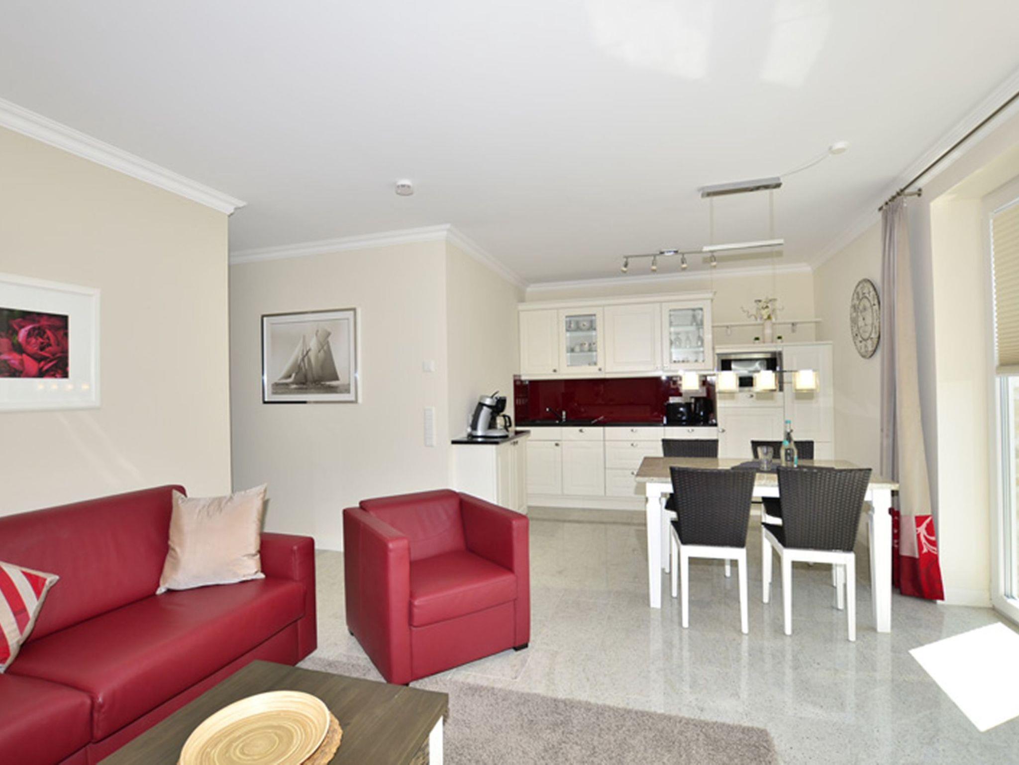 Diese stilvoll eingerichtete 2-Zimmer-Nichtraucherwohnung befindet sich im 1. Obergeschoss eines Neubaus und bietet auf ca. 58 m² Wohnfläche höchsten Komfort für bis zu vier Personen. Großformatige Fliesen, Fußbodenheizung und eine geschmackvolle Ausstattung schaffen ein elegantes, behagliches Wohnambiente. Zwei Balkone einer nach Süden, der andere nach Westen ausgerichtet laden dazu ein, den Tag in der Sonne zu beginnen oder ihn entspannt bei Nachmittagssonne ausklingen zu lassen. Hochwertige Balkonmöbel mit Auflagen sind selbstverständlich vorhanden.