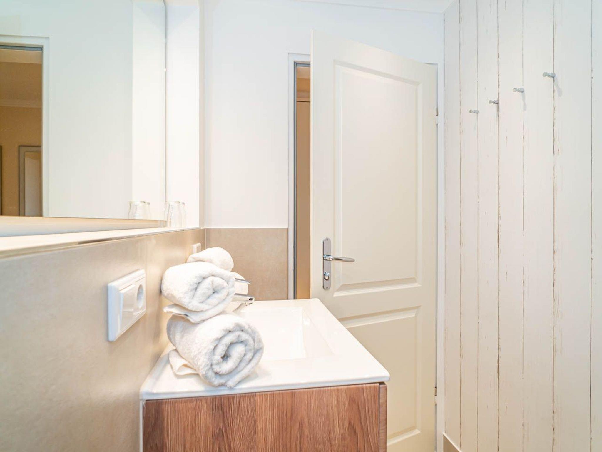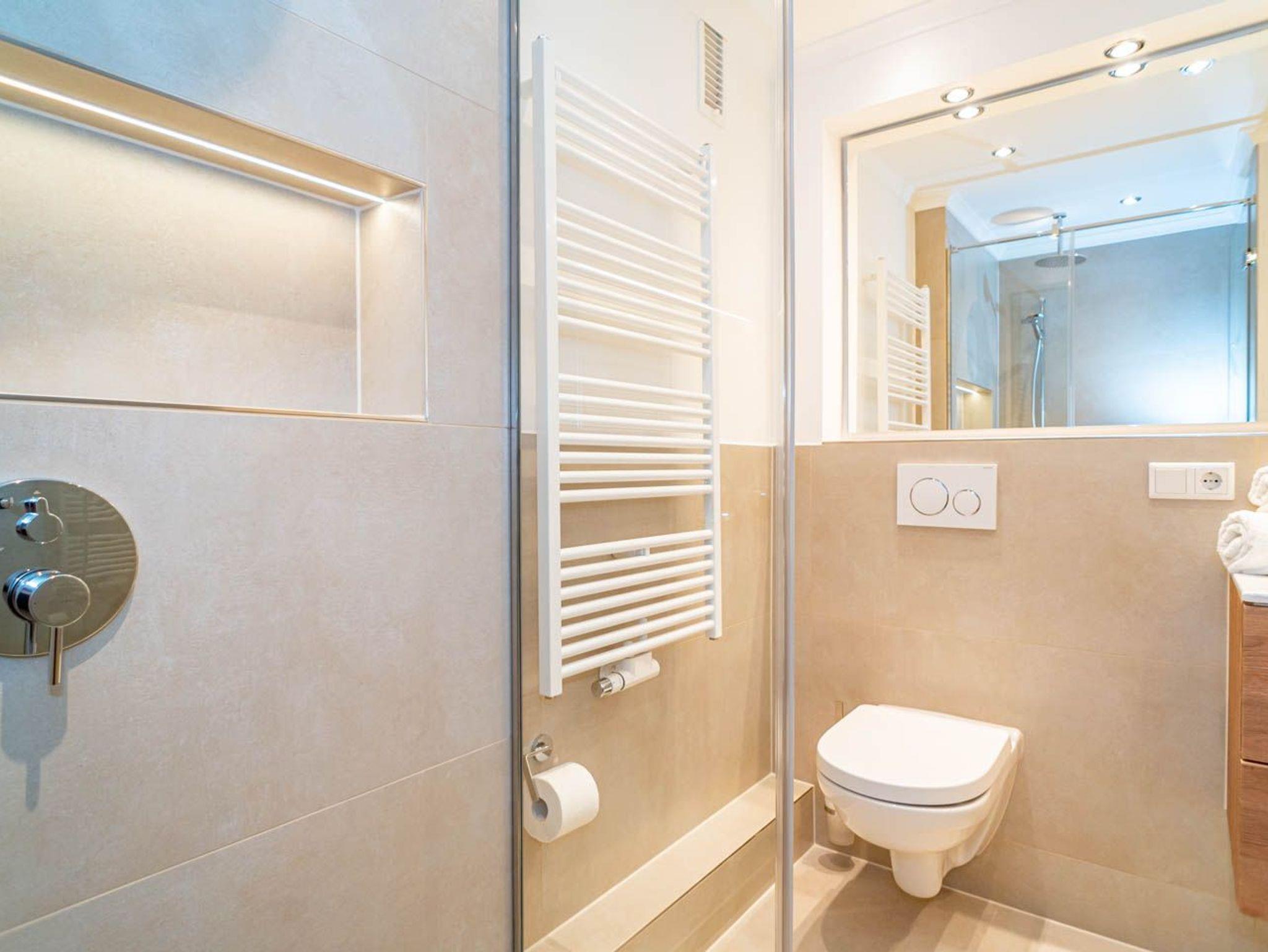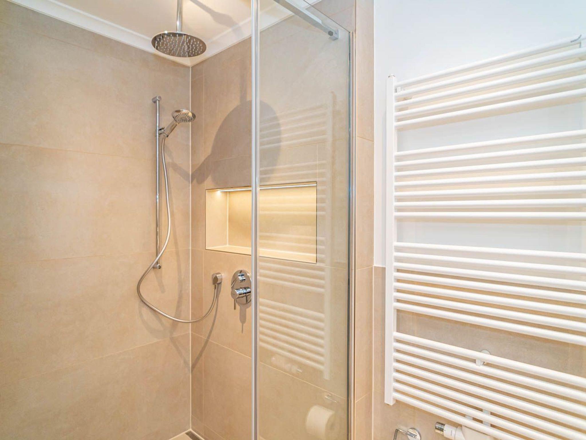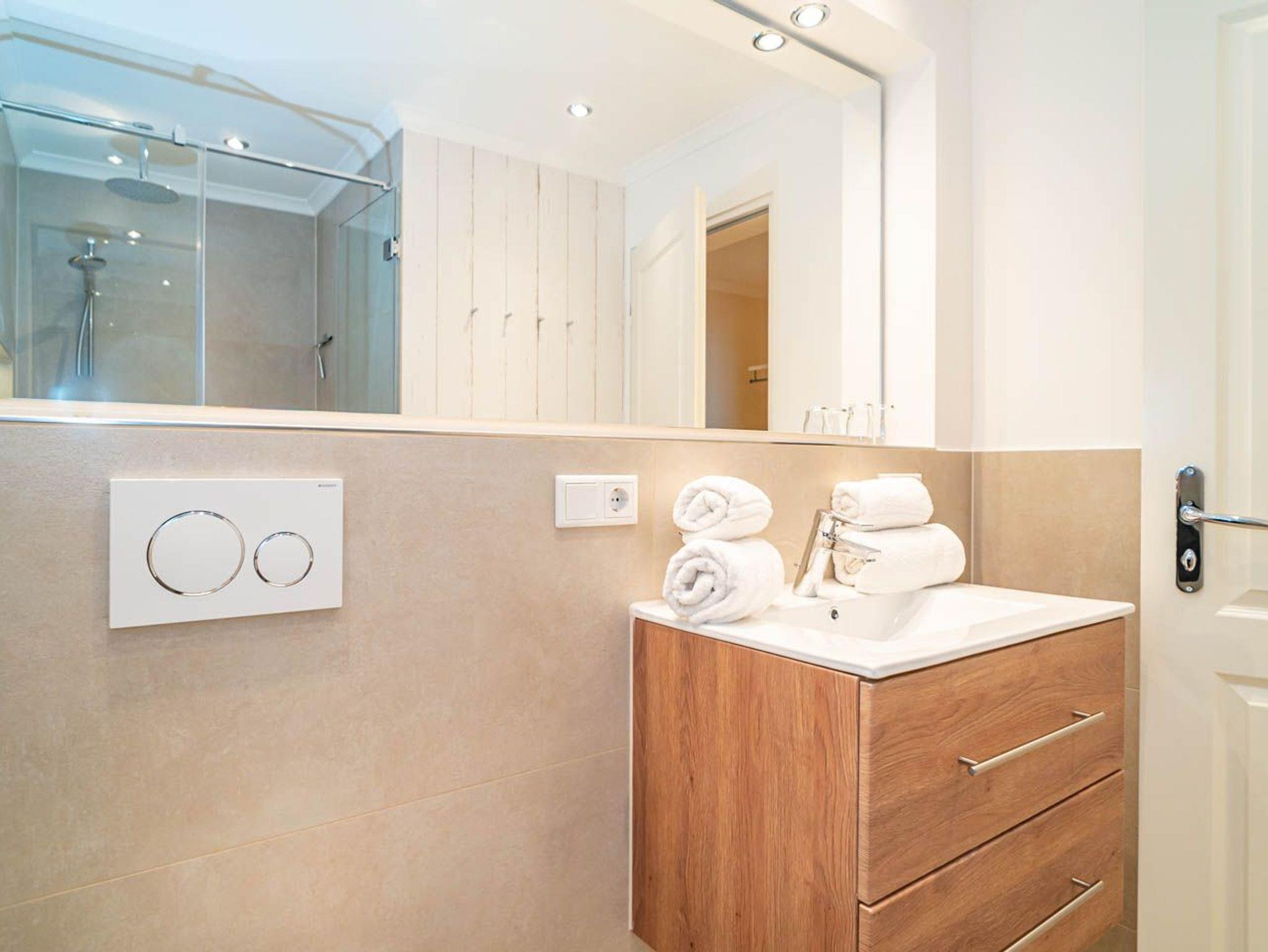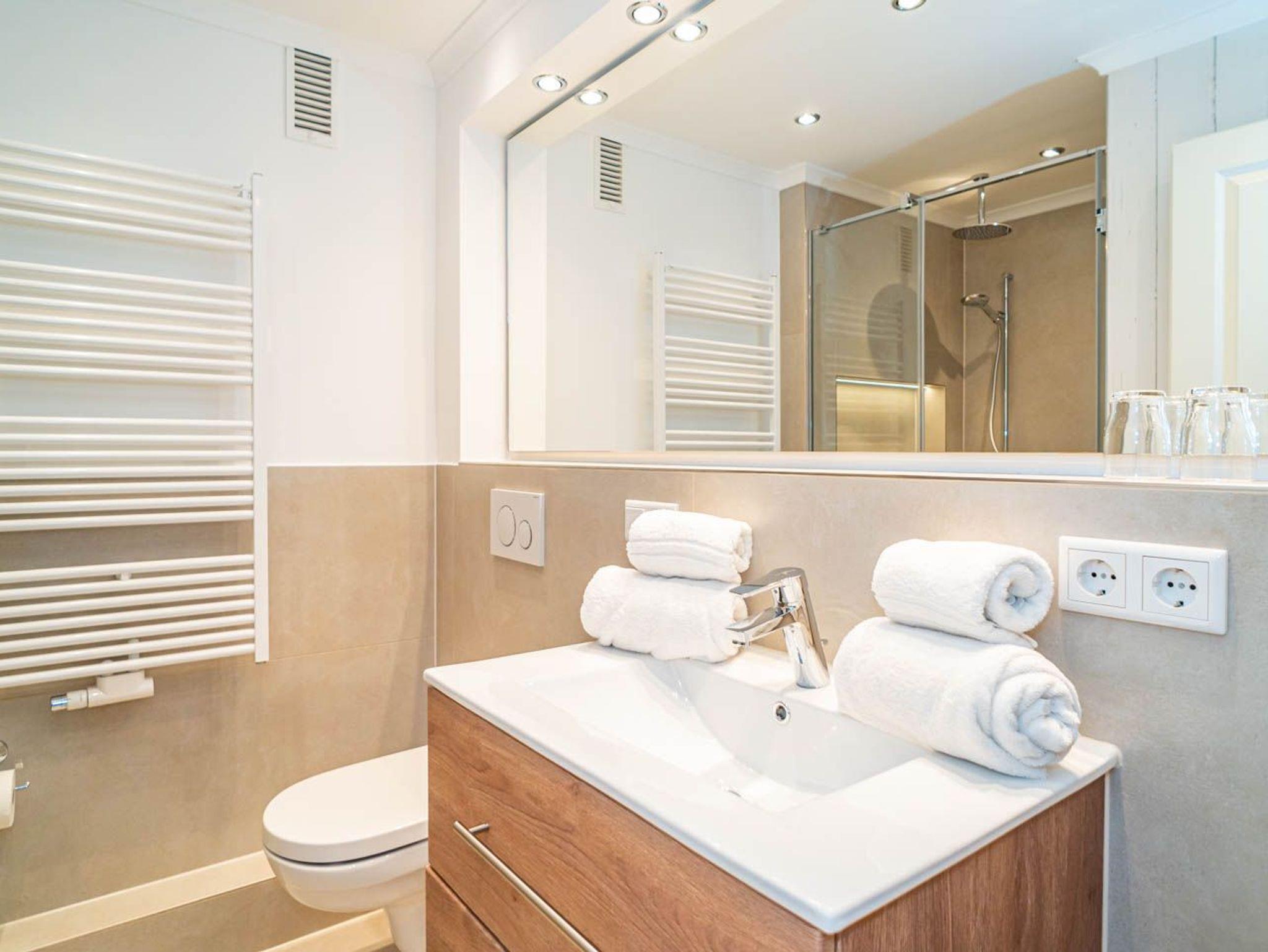 Im modernen Badezimmer erwartet Sie eine großzügige Dusche mit extraflachem Einstieg, ein Waschtisch, Handtuchtrockner, Fön und ein WC.