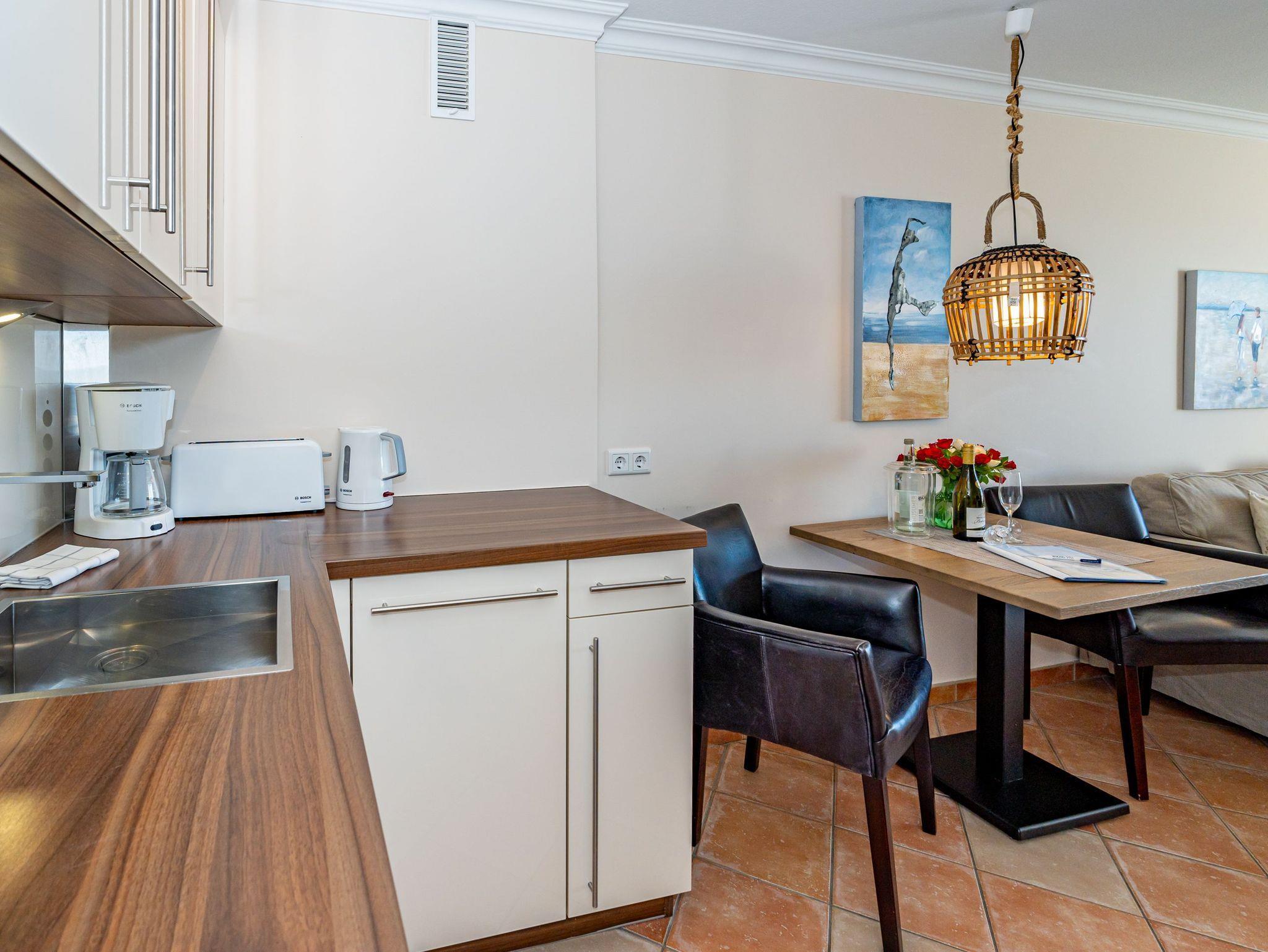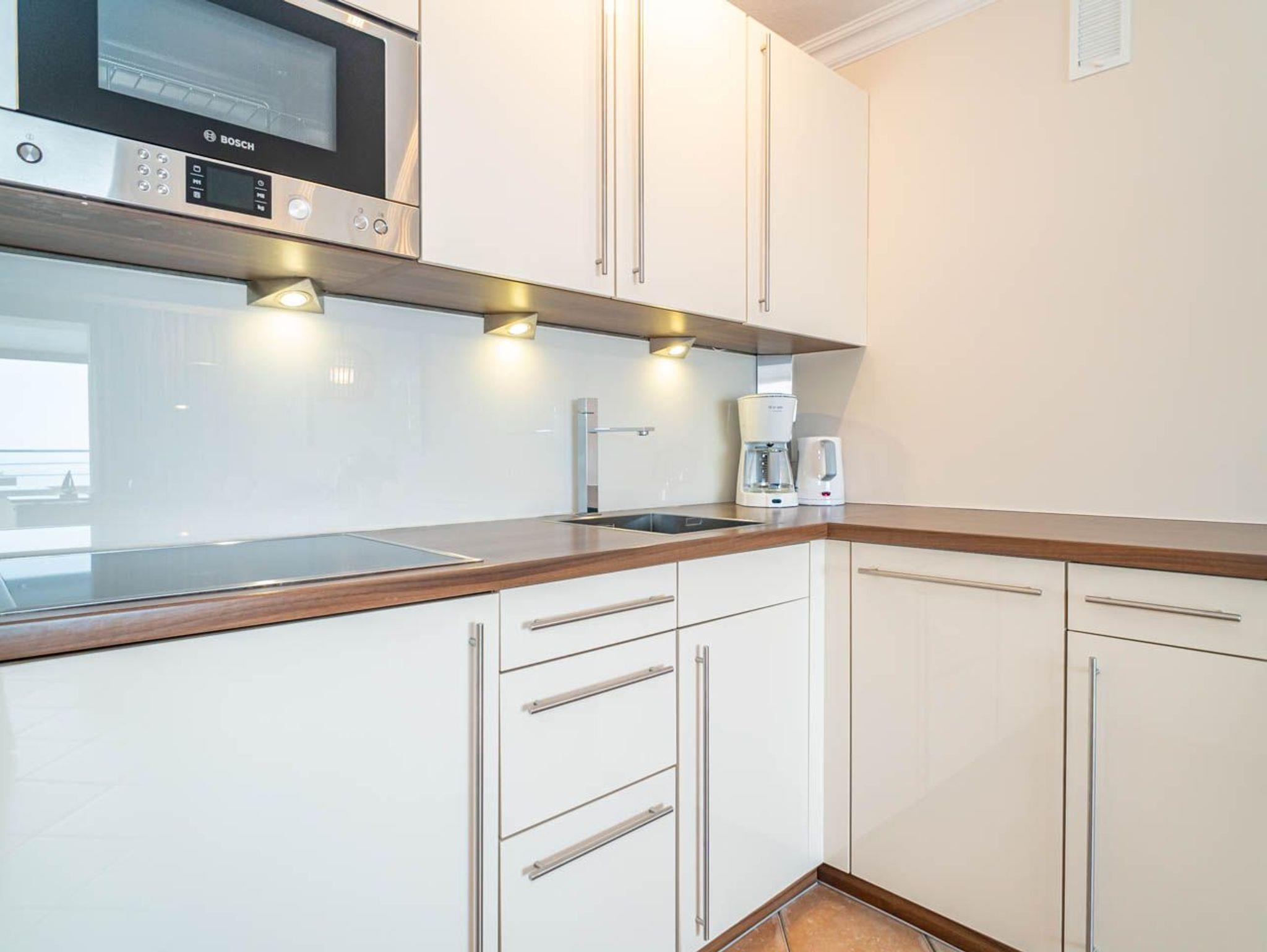 Die offene Einbauküche ist voll ausgestattet mit einem Geschirrspüler, einer Mikrowelle, einer Nespresso-Maschine, einem 4-Platten-Ceranfeld sowie einem Kühlschrank mit 3*-Gefrierfach. Kaffeemaschine, Wasserkocher und Toaster gehören ebenfalls zur Grundausstattung.