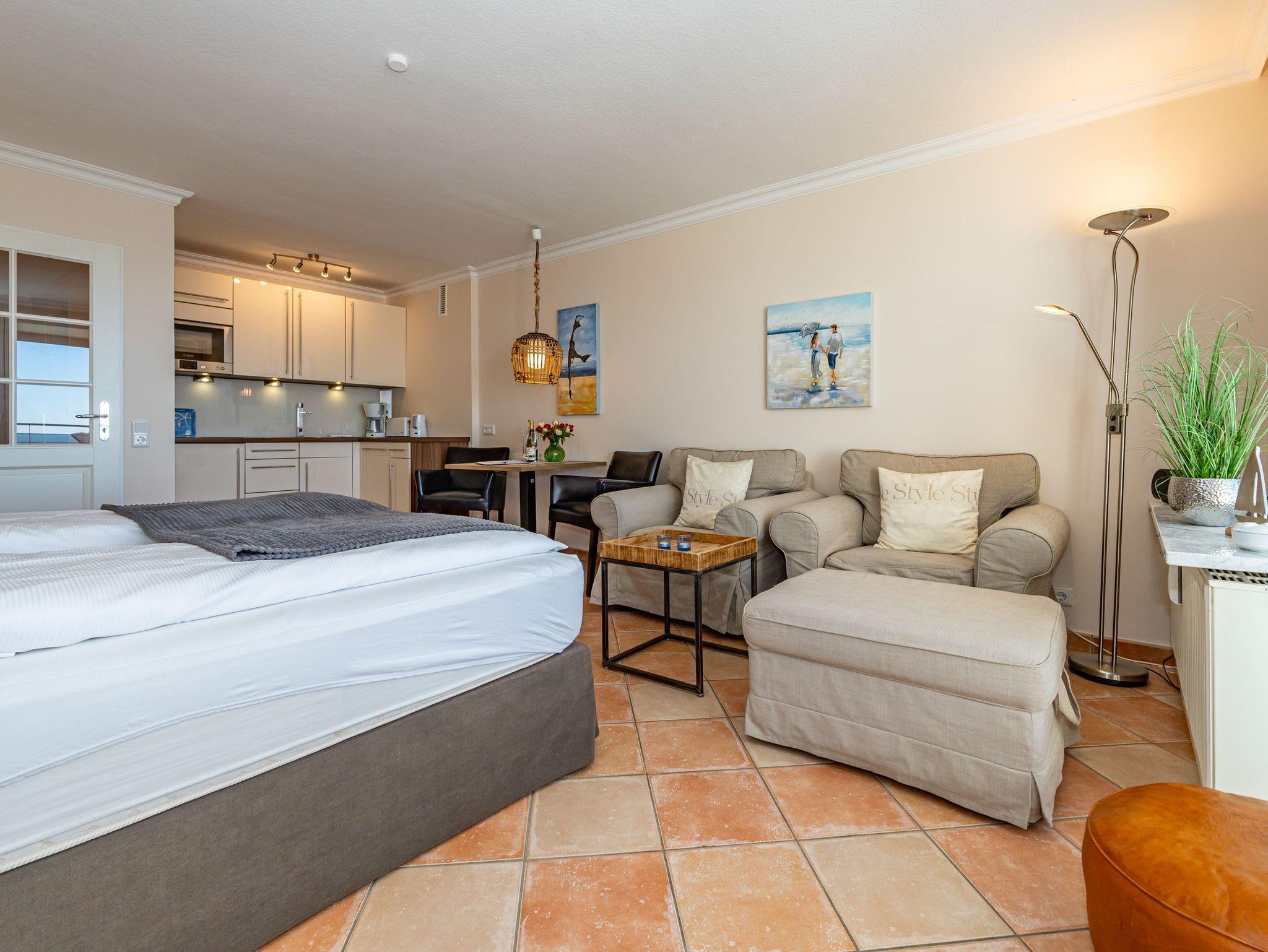 Diese großzügige, komplett renovierte 1-Zimmer-Nichtraucher-Ferienwohnung (ca. 43 qm) in der 5. Etage besticht durch ihre Seeblicklage und eine Westloggia, die Ihnen am Nachmittag sonnige Stunden mit komfortablen Balkonmöbeln und Auflagen bietet - ideal für 2 Personen.
