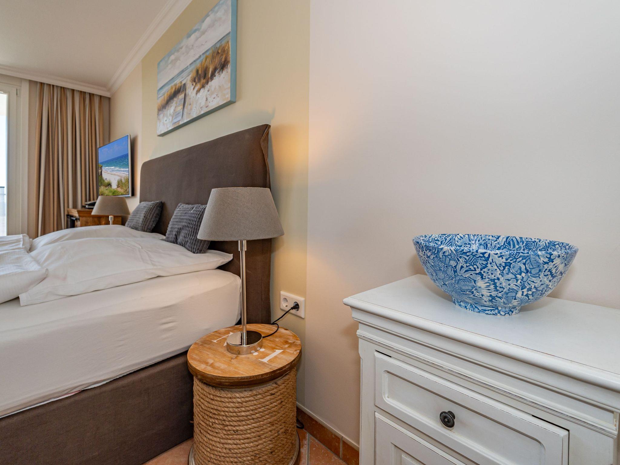 Der Wohn-/Schlafraum besteht aus einem feststehendem Boxspring-Doppelbett (Liegefläche 1,80 x 2,00m, mit besonders komfortablen Einzelmatratzen), 2 gemütlichen Sessel, einem Essplatz mit zwei bequemen Armlehnstühlen, einem Sat-Flachbild-TV mit digitalem Empfang, Radio-CD sowie einem Festnetztelefon inklusive Flatrate für Gespräche ins deutsche Festnetz, kostenloser Internetnutzung (ohne Gewähr).