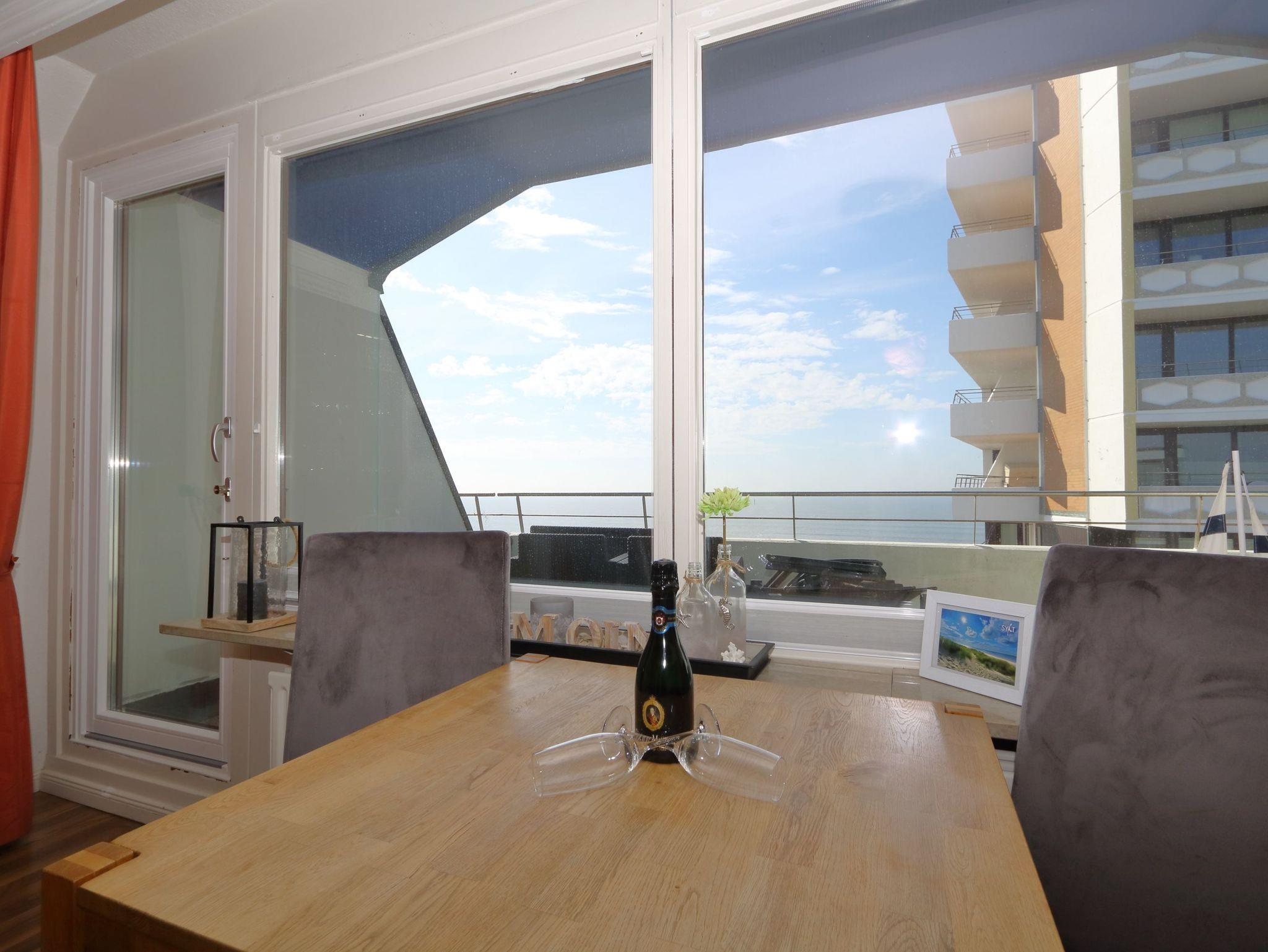 Dieses 1-Zimmer-Appartement befindet sich in der 8. Etage des Appartementhauses Haus am Meer. Diese Etage ist die oberste und damit die Penthouse-Etage, die vom 7. OG über eine Treppe zu erreichen ist. Das Haus steht direkt am Hauptstrand zwischen den beiden Fußgängerzonen.