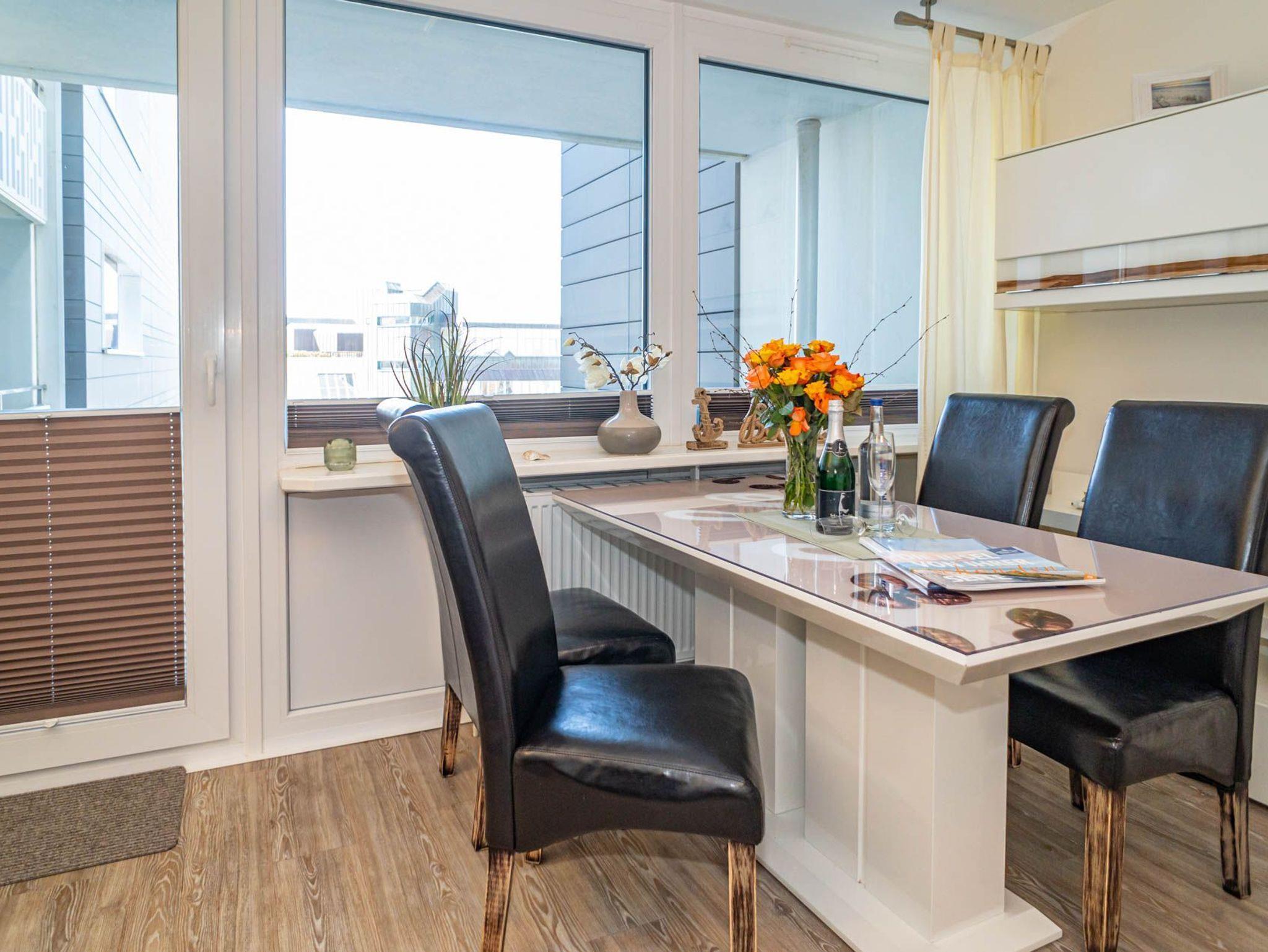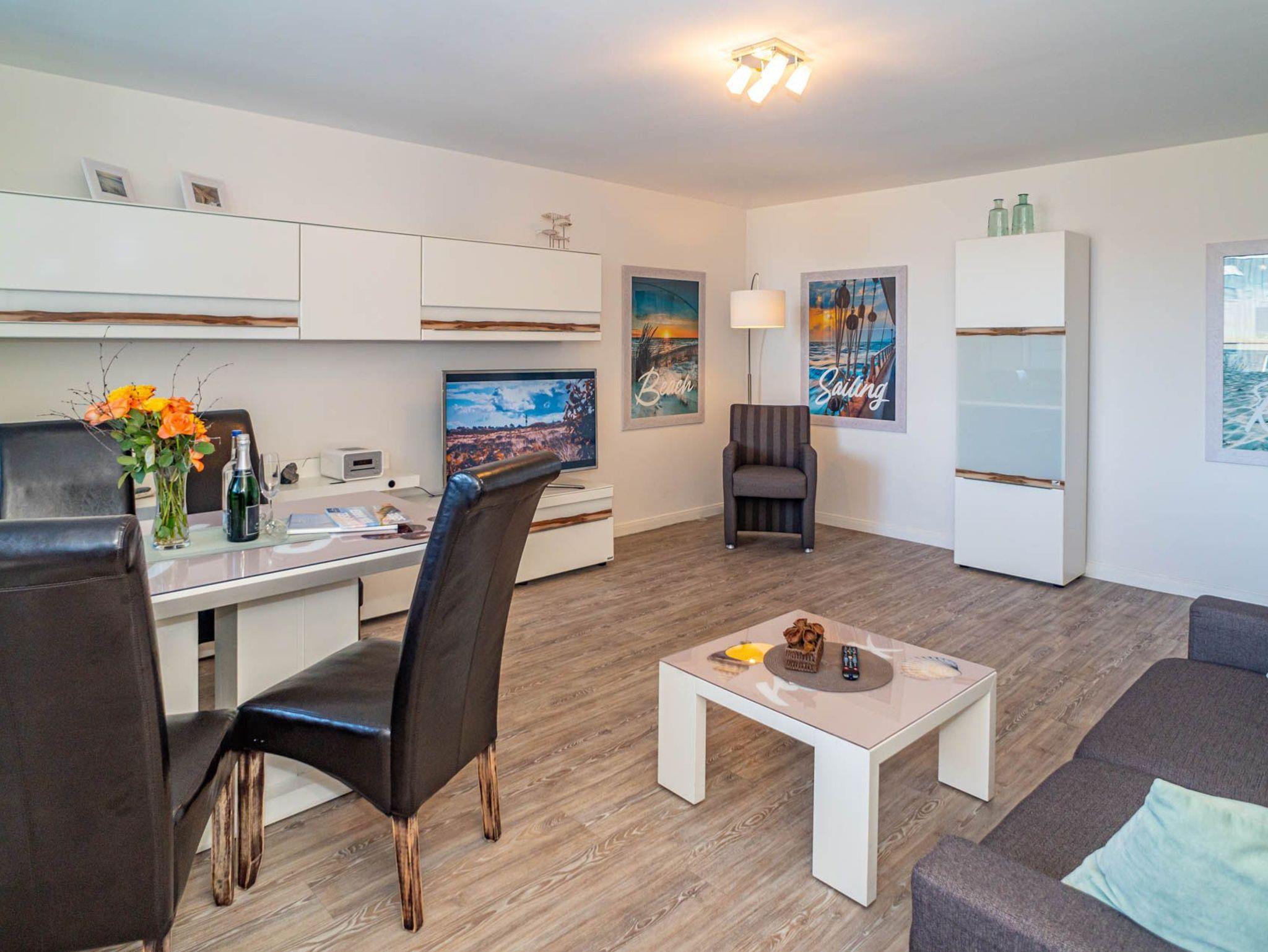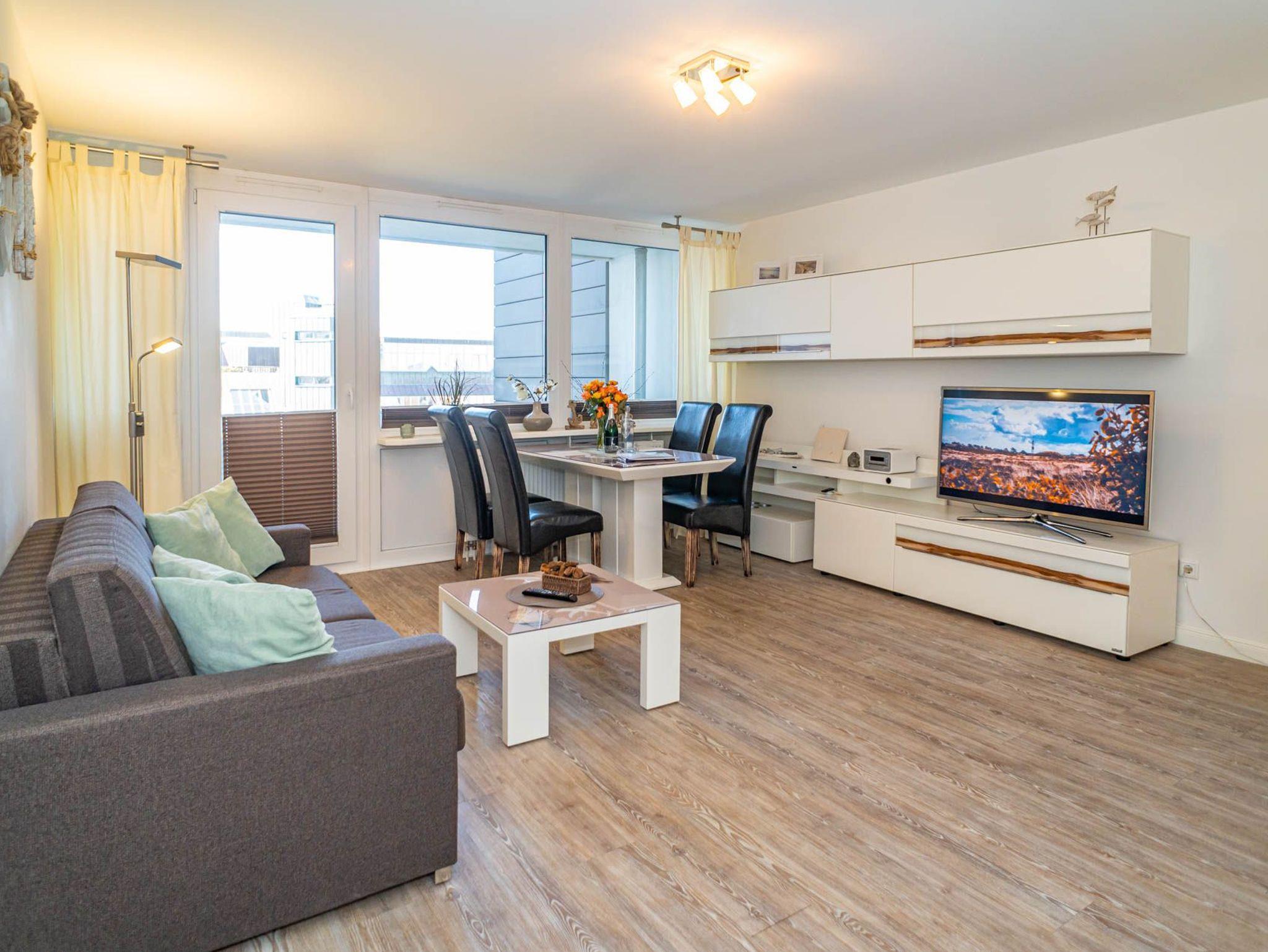 Hochwertig und modern eingerichtete 2-Zimmer-Nichtraucher-Ferienwohnung (ca. 59 qm) in der 2. Etage zur Seeseite mit Westloggia (Nachmittagssonne, mit Balkonmöbeln und Auflagen) für max. 4 Personen.
