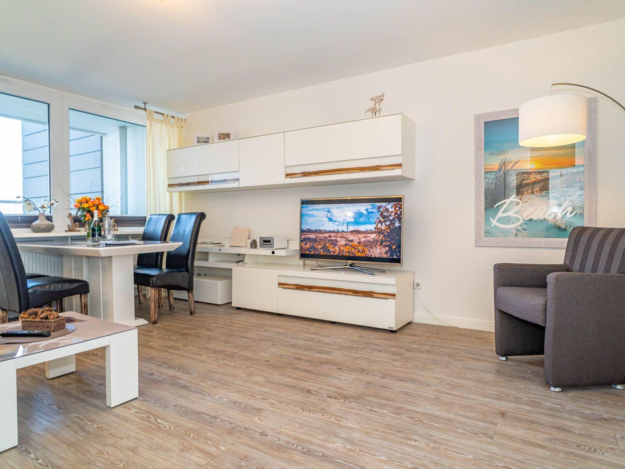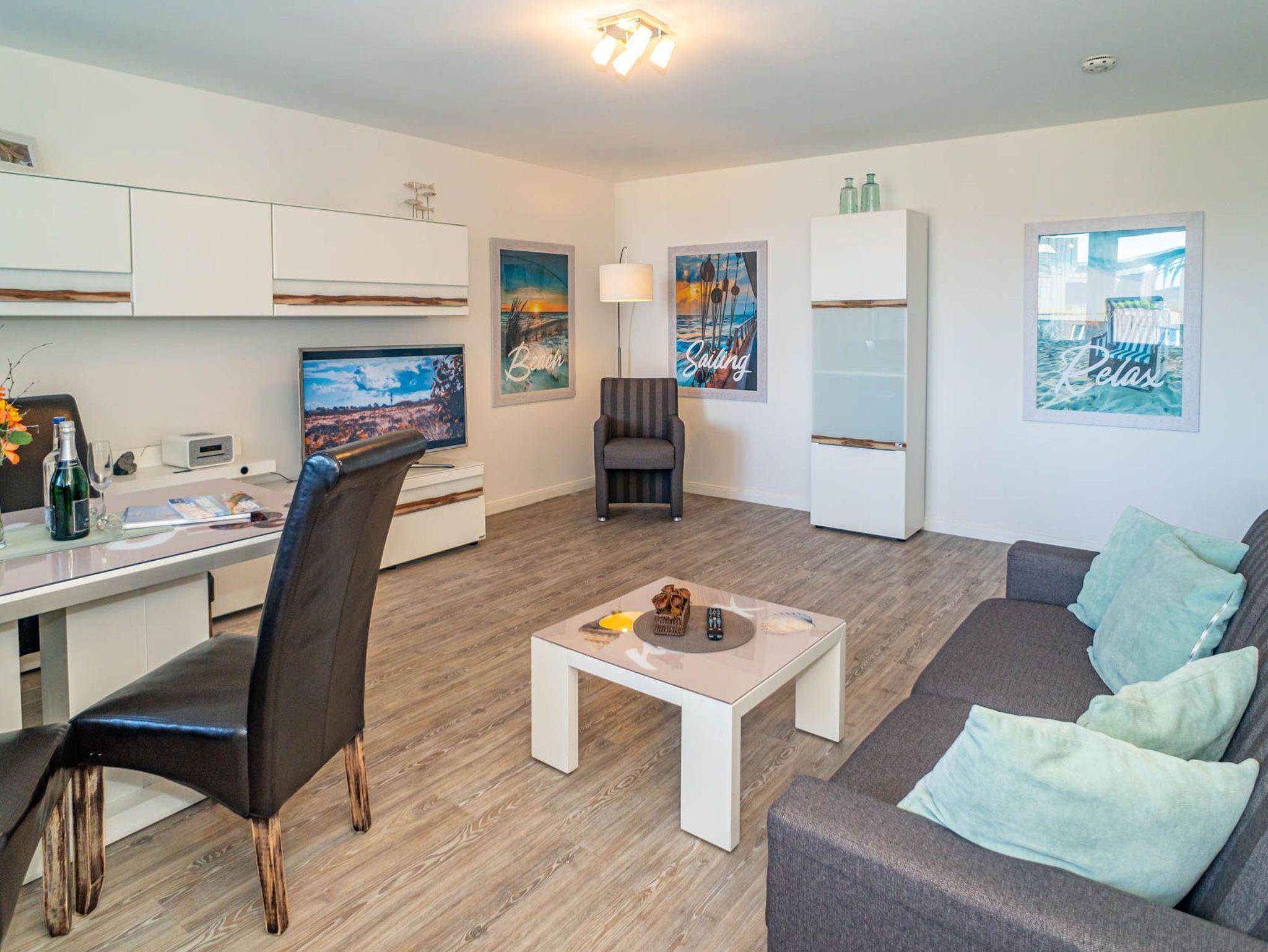 Der Wohnraum besteht aus einer gemütlichen Sitzgarnitur (Doppelschlafcouch und Sessel), einem Essplatz, Kabel-Flachbild-TV, Radio/CD.