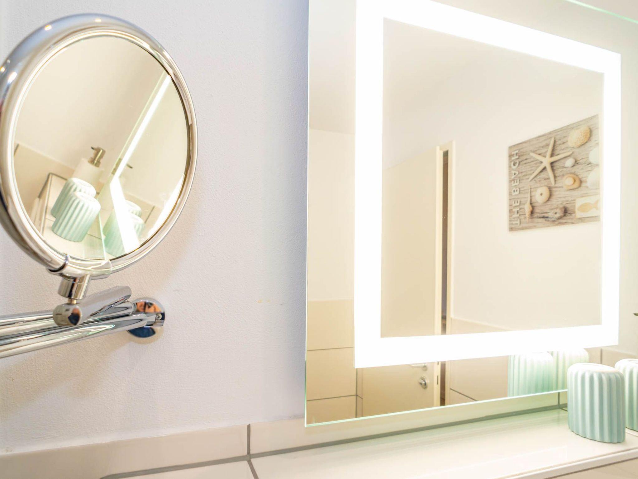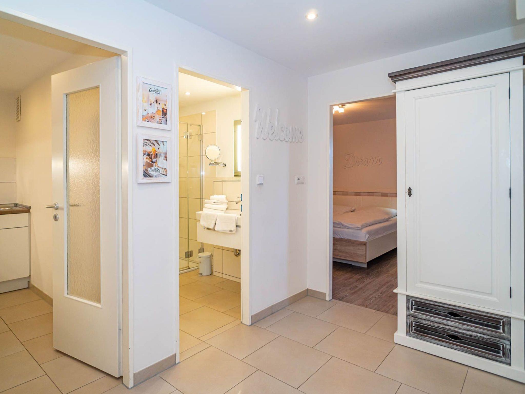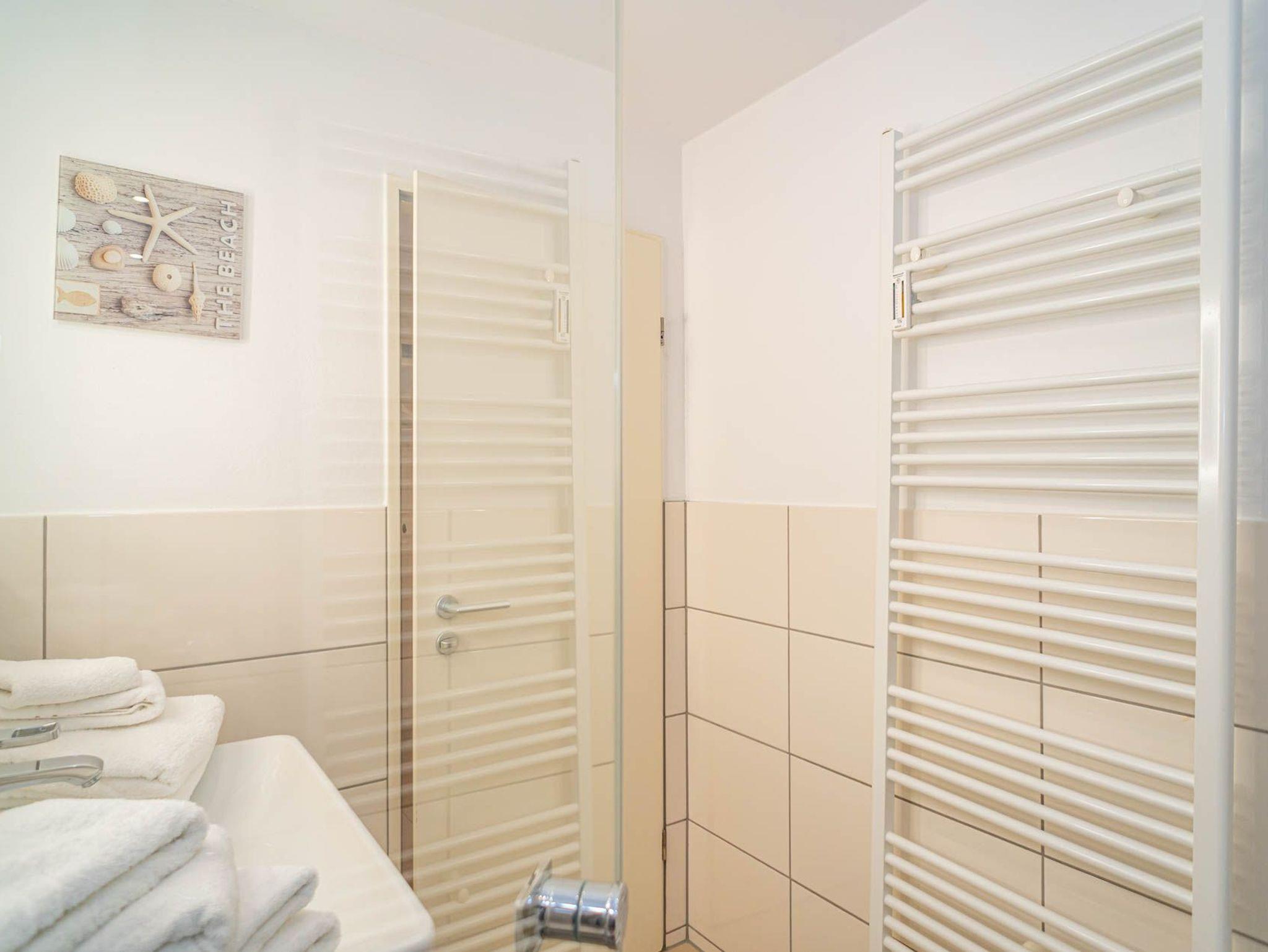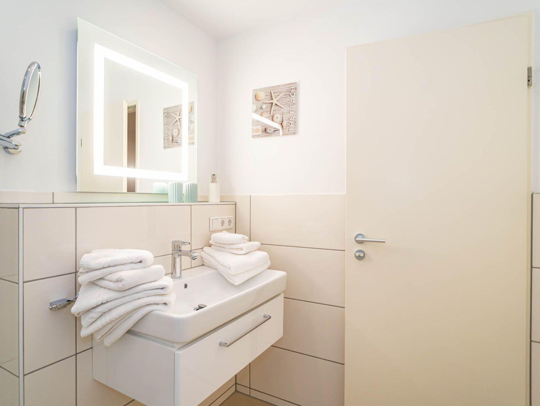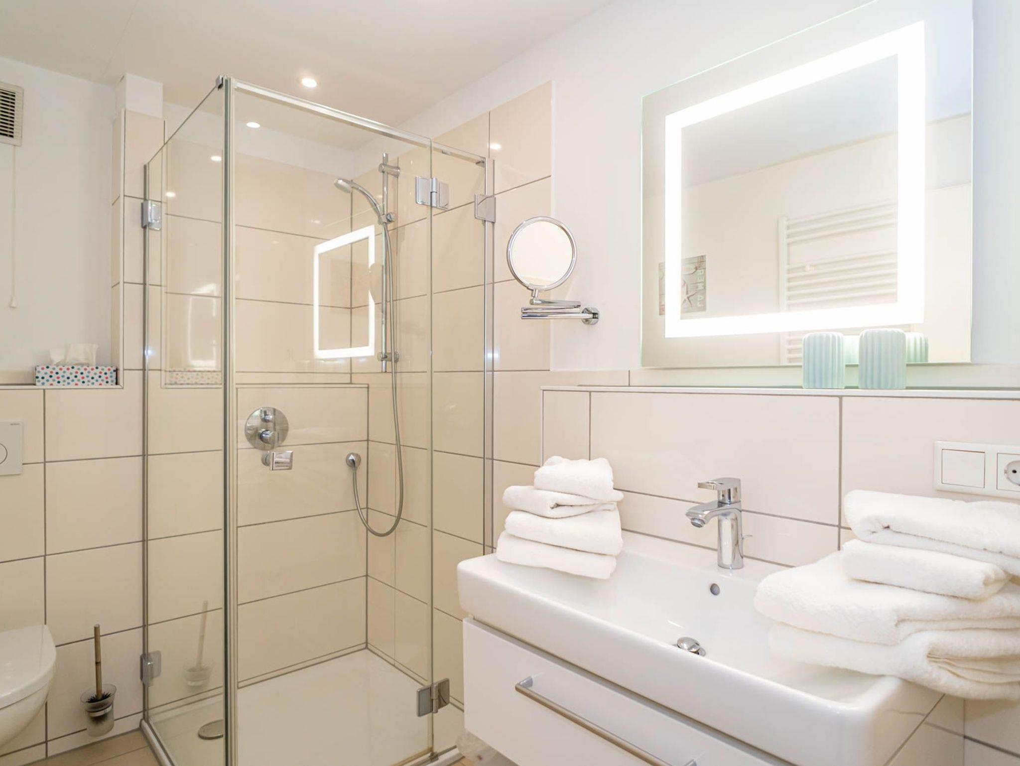 Im modernen Bad befinden sich eine Dusche mit niedrigem Einstieg, ein WC, ein Waschtisch, ein Handtuchtrockner und ein Kosmetikspiegel.