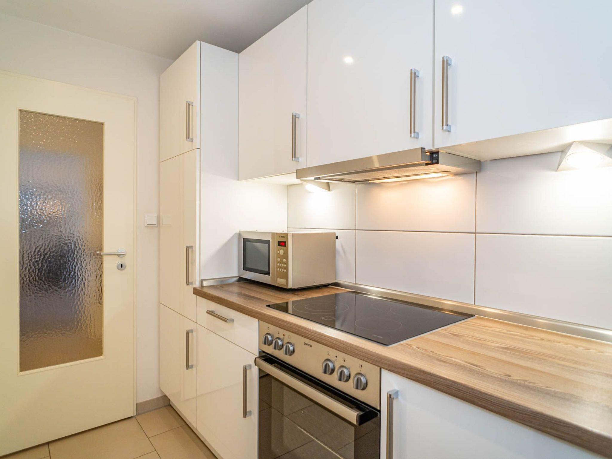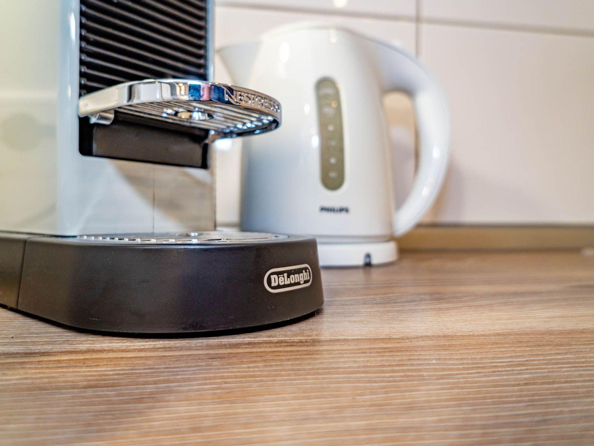 Die Küchenzeile hat einen Herd mit Backofen und Cerankochfeld, einen Geschirrspüler, eine Mikrowelle und einen Kühlschrank mit 3-Sterne-Gefrierfach. Nespresso-Kapsel-Kaffeemaschine und Kaffee-Filtermaschine, Wasserkocher und Toaster gehören zur Grundausstattung.