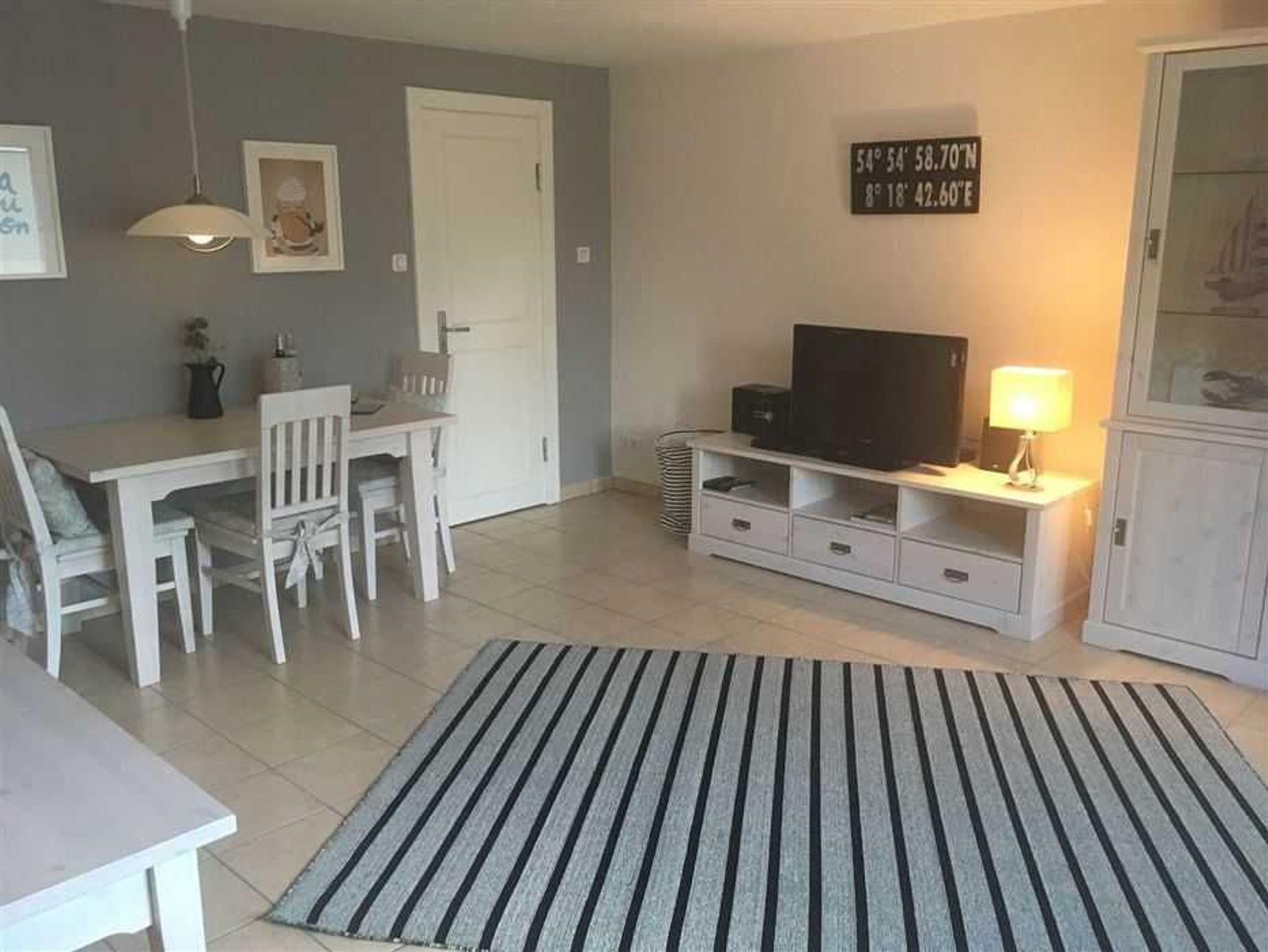 Großer Flachbildschirm im Wohnzimmer und auf der Terrasse finden Sie einen Strandkorb.